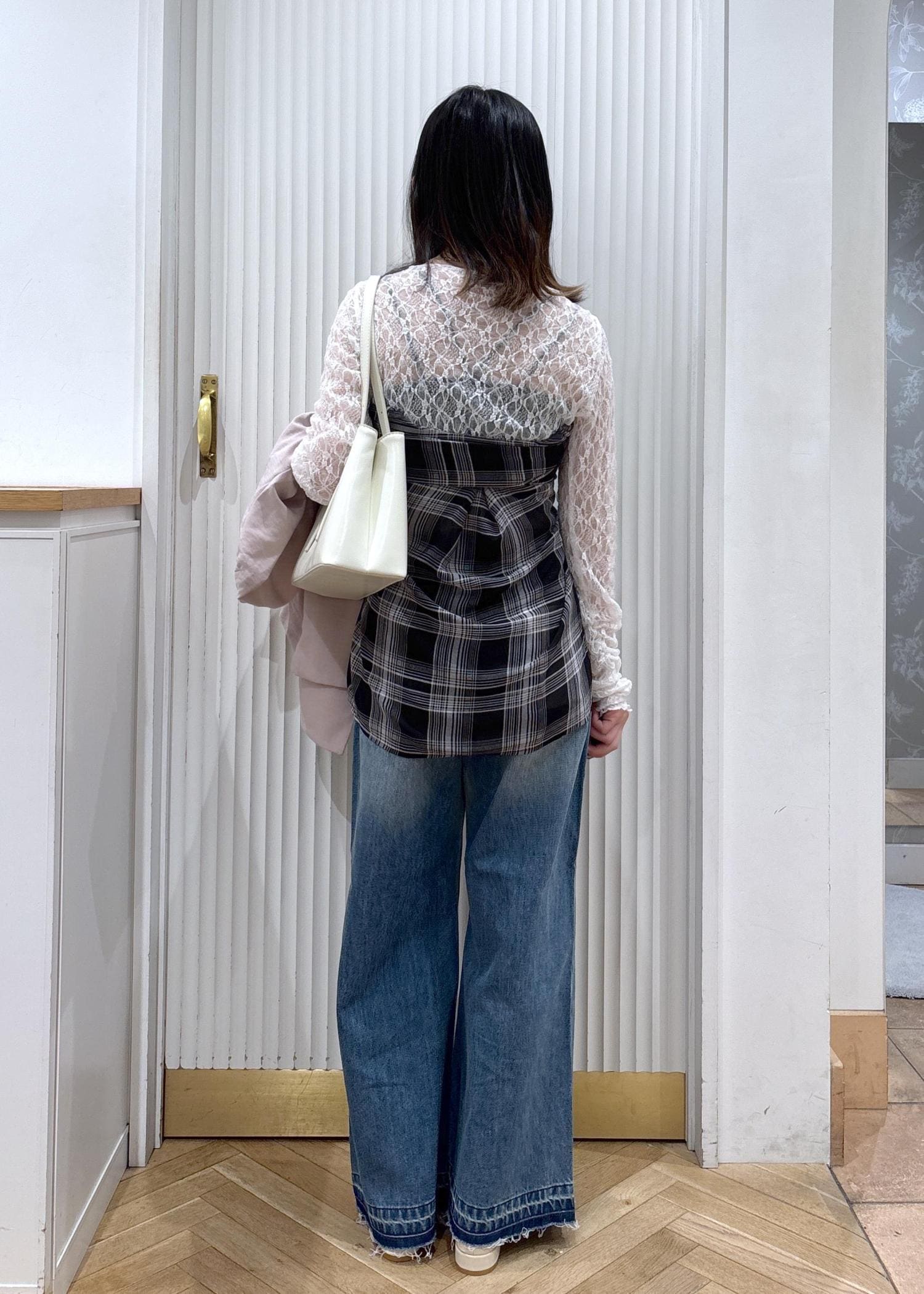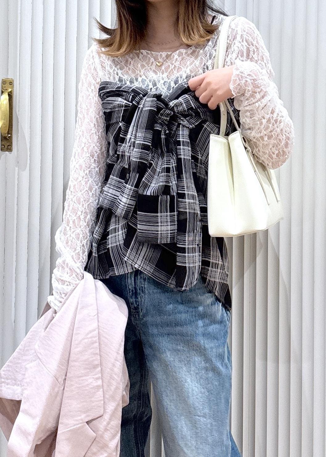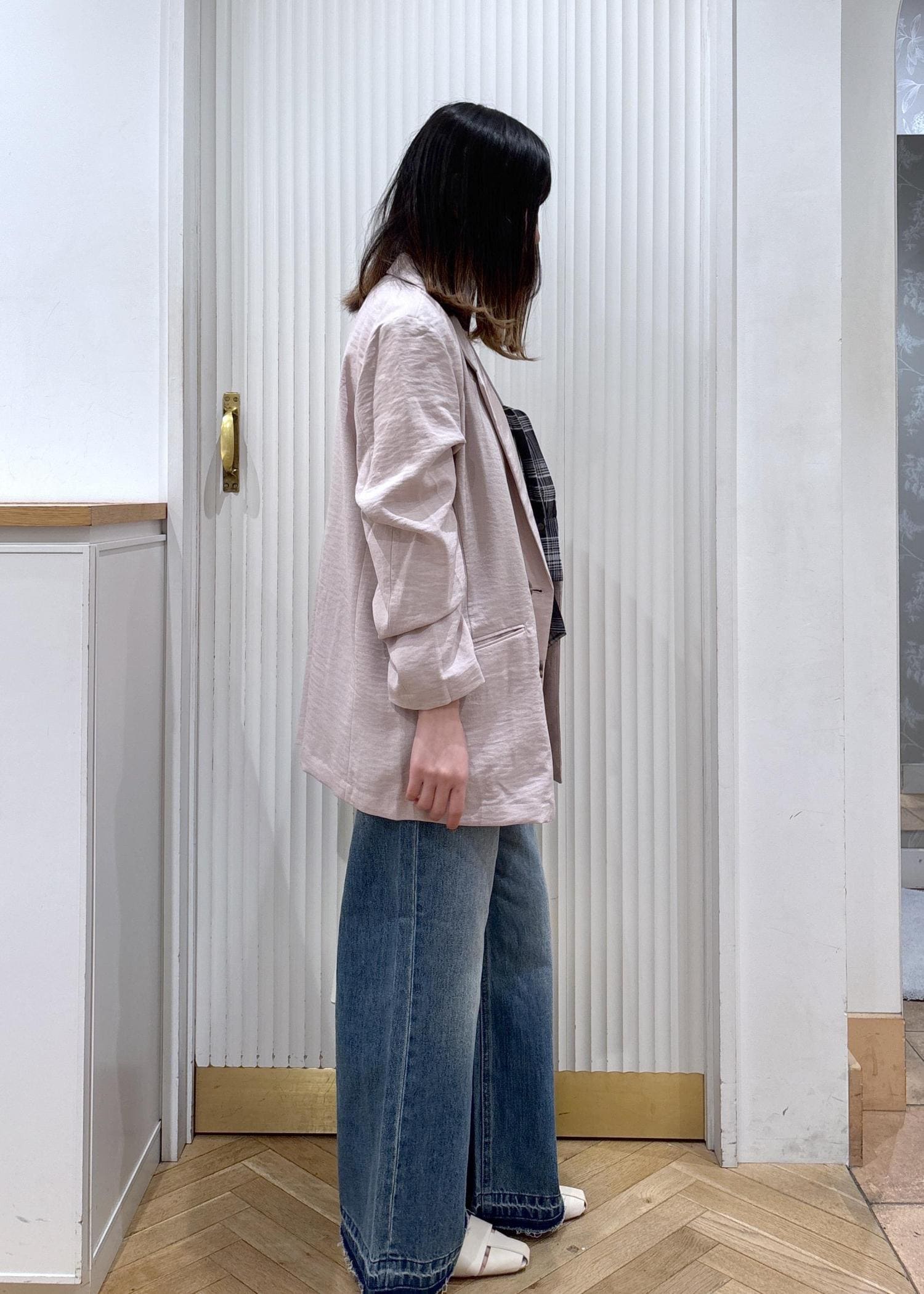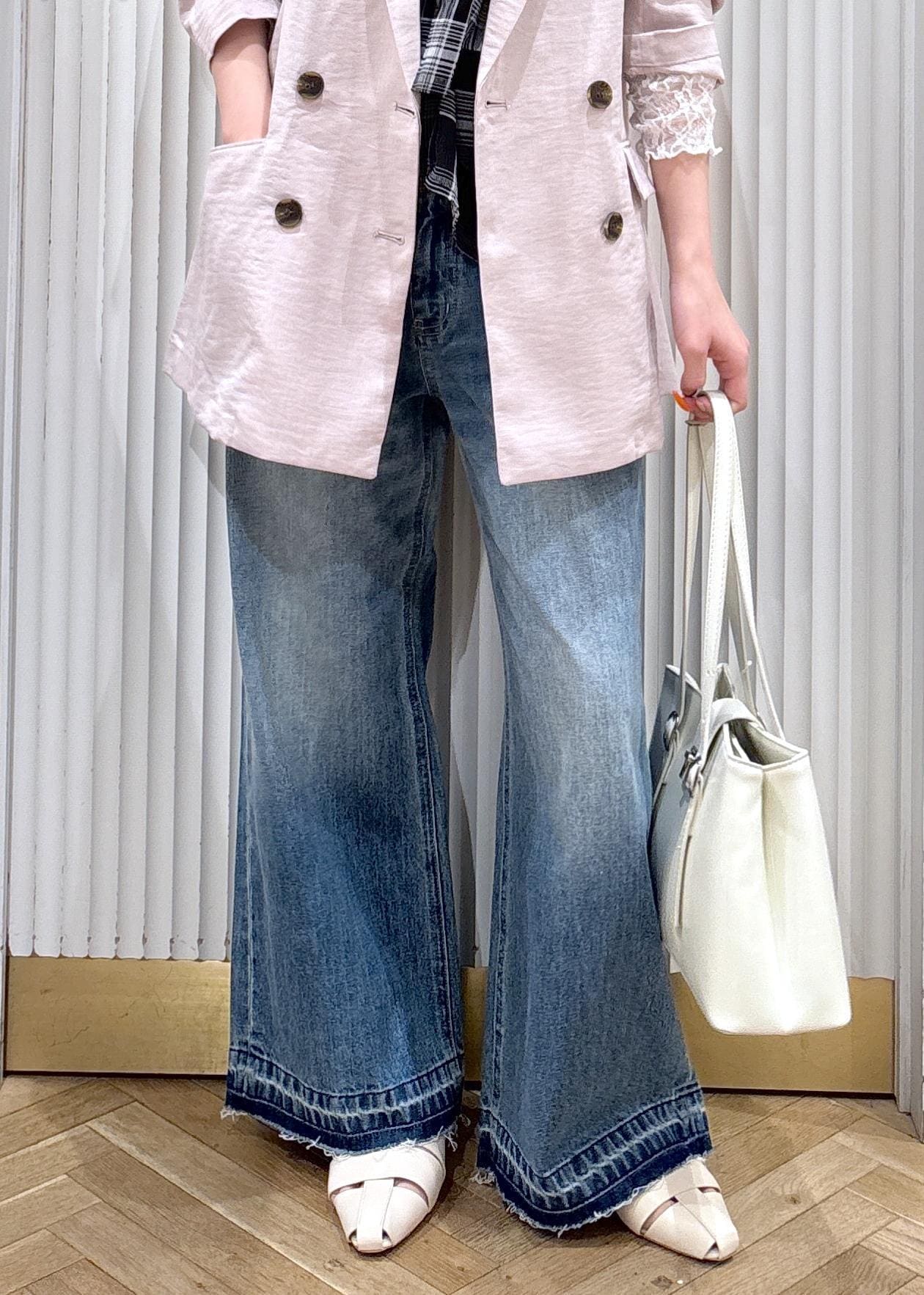 やわらかいピンクのジャケットで女性らしさをプラスしつつ、ワイドデニムで程よくカジュアルダウン。インナーのビスチェ風に巻いたブラウスがコーデのアクセントになってシンプルすぎないバランスになります!ホワイト小物で抜け感を出して、春っぽい軽やかな印象に仕上げたスタイリングです!