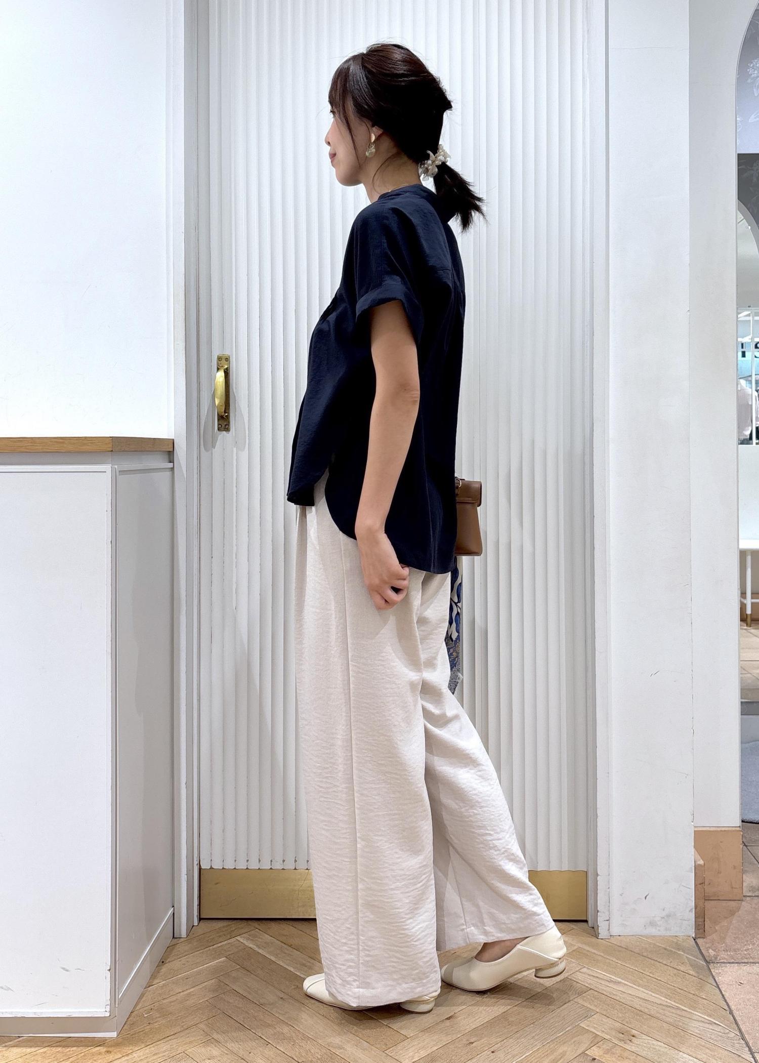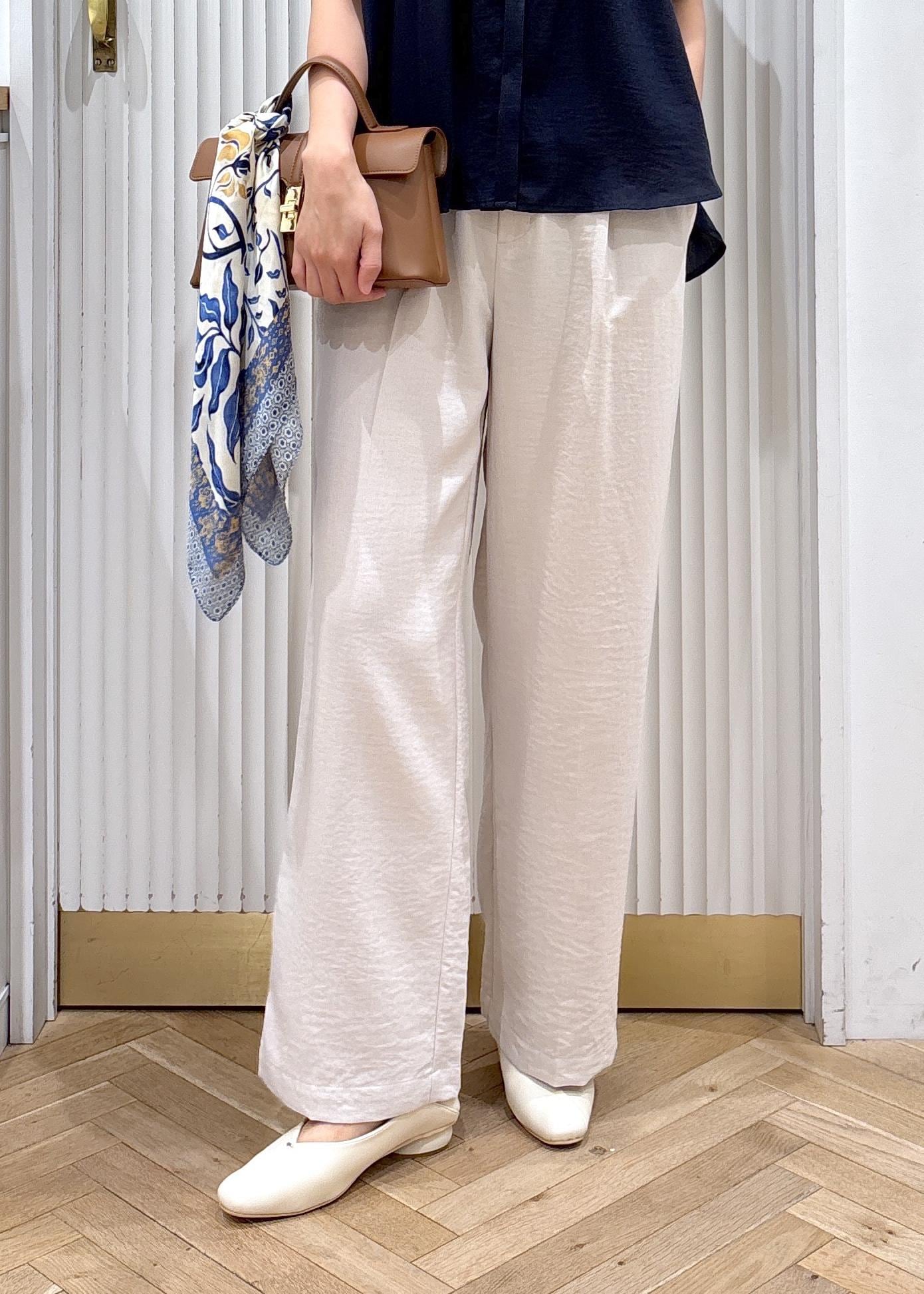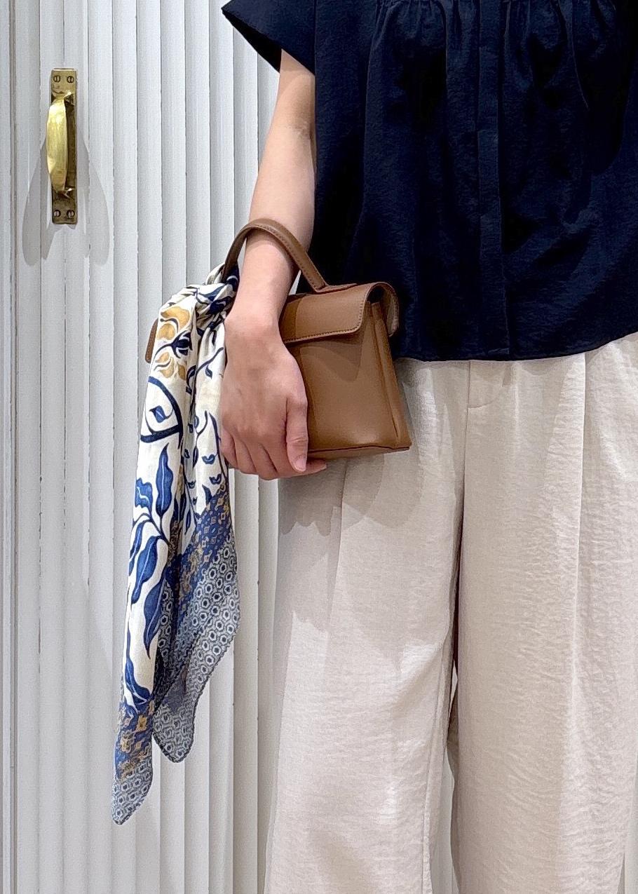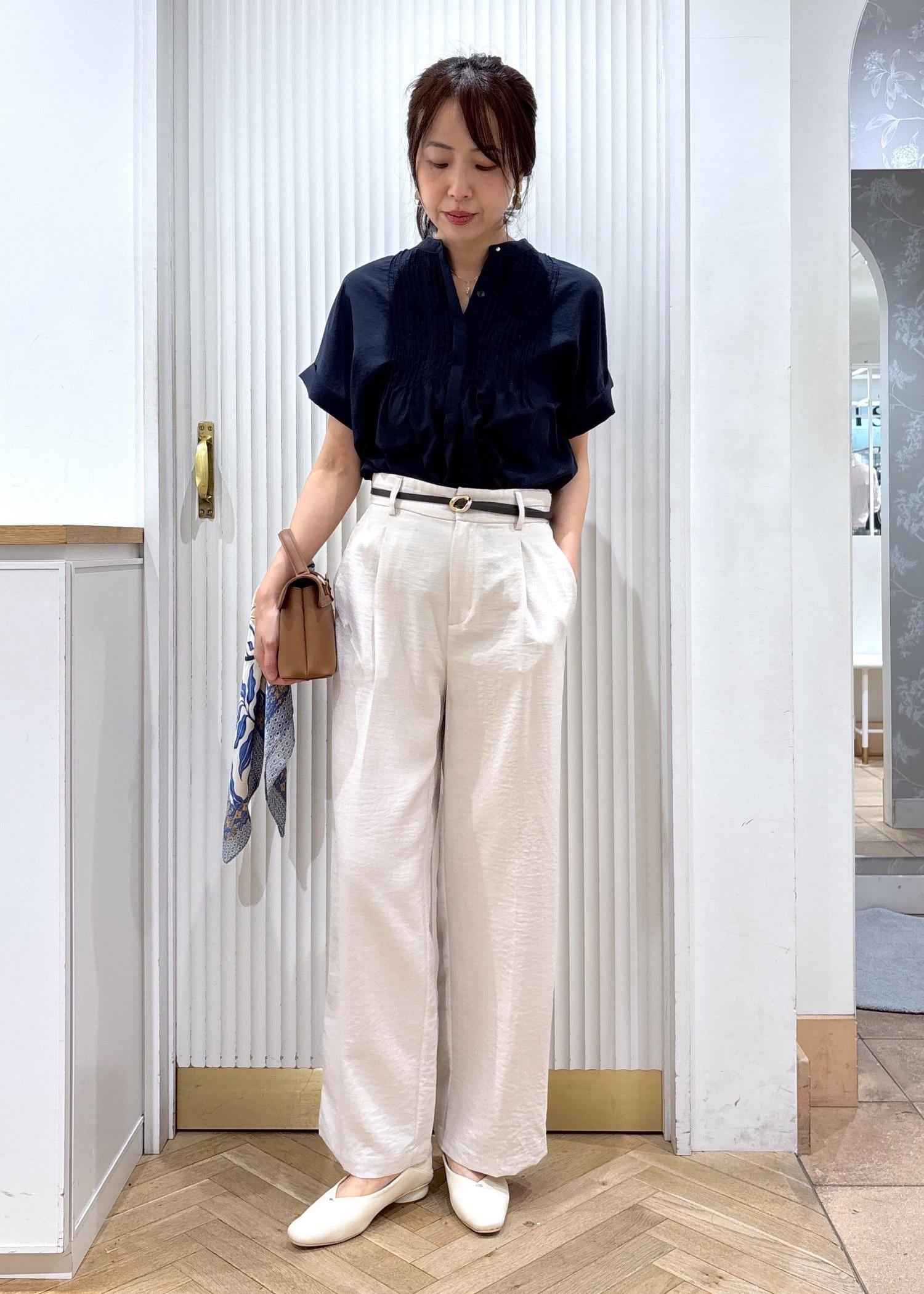 落ち着いたネイビーのトップスに、やわらかなアイボリーのワイドパンツを合わせた、品のある大人カジュアルスタイル。軽やかな素材感が涼しげで、リラックスしつつもきちんと感をキープ。ブラウンのバッグと柄スカーフがさりげないアクセントになり、シンプルな中にも華やかさをプラス。足元はフラットシューズで抜け感を出し、デイリーからお出かけまで幅広く活躍するコーディネートです。