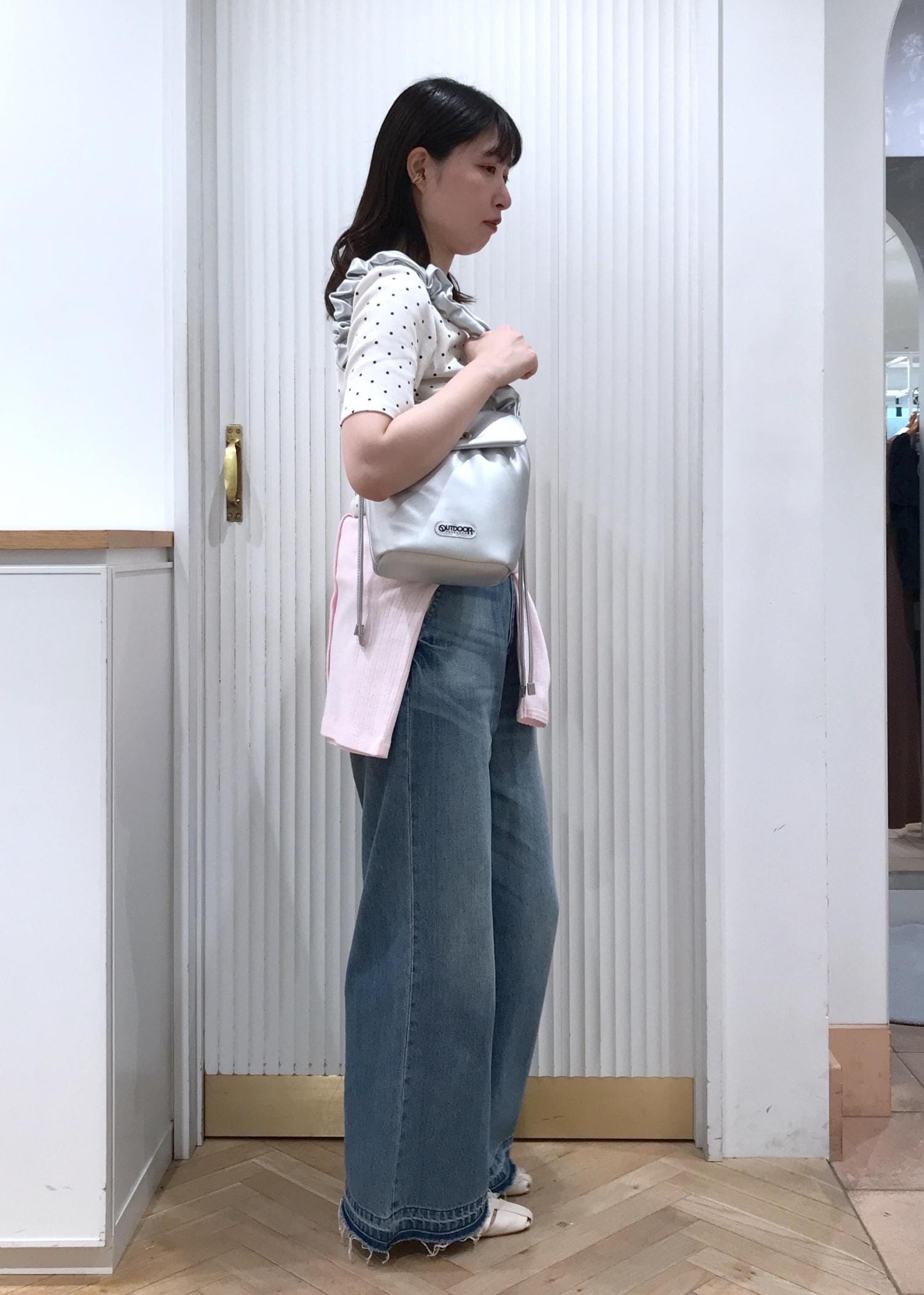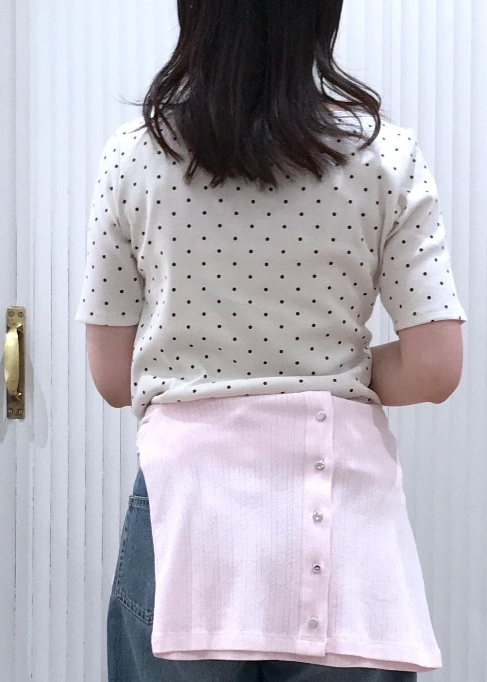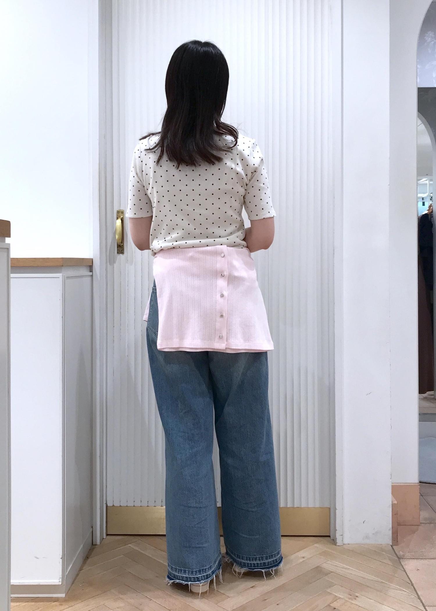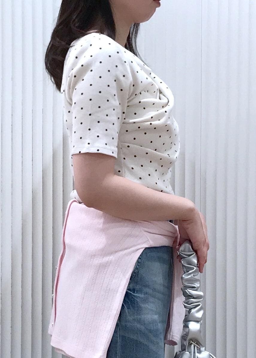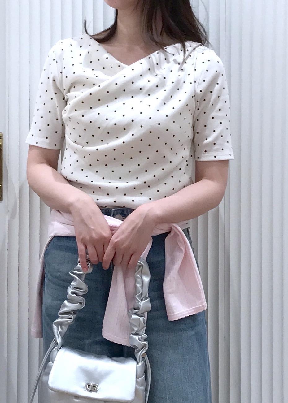 ドレープが可愛いドットトップスとデニムを合わせたカジュアルコーデです。