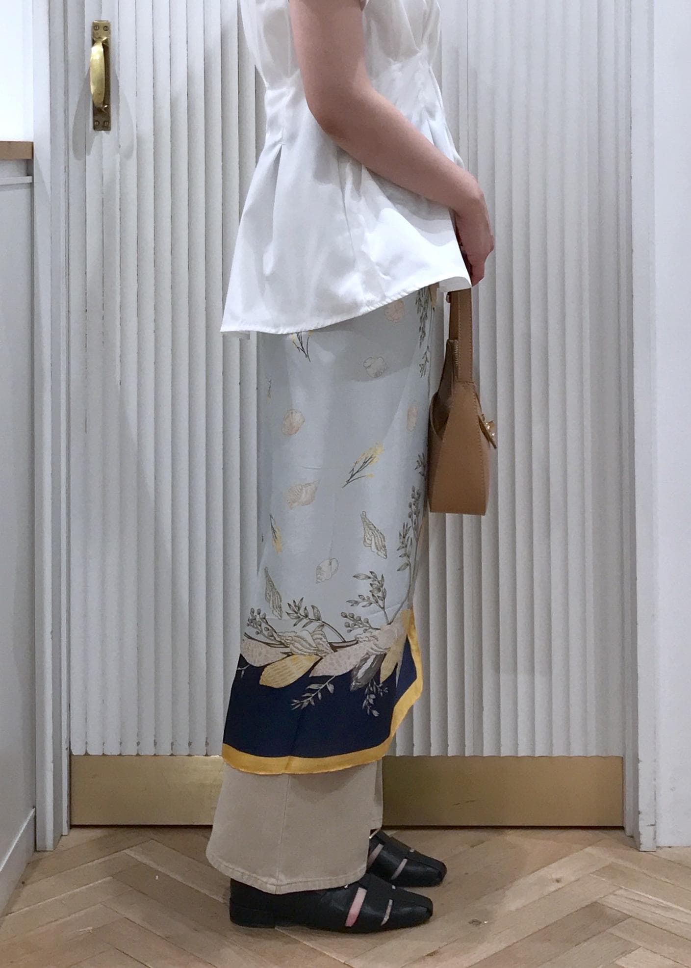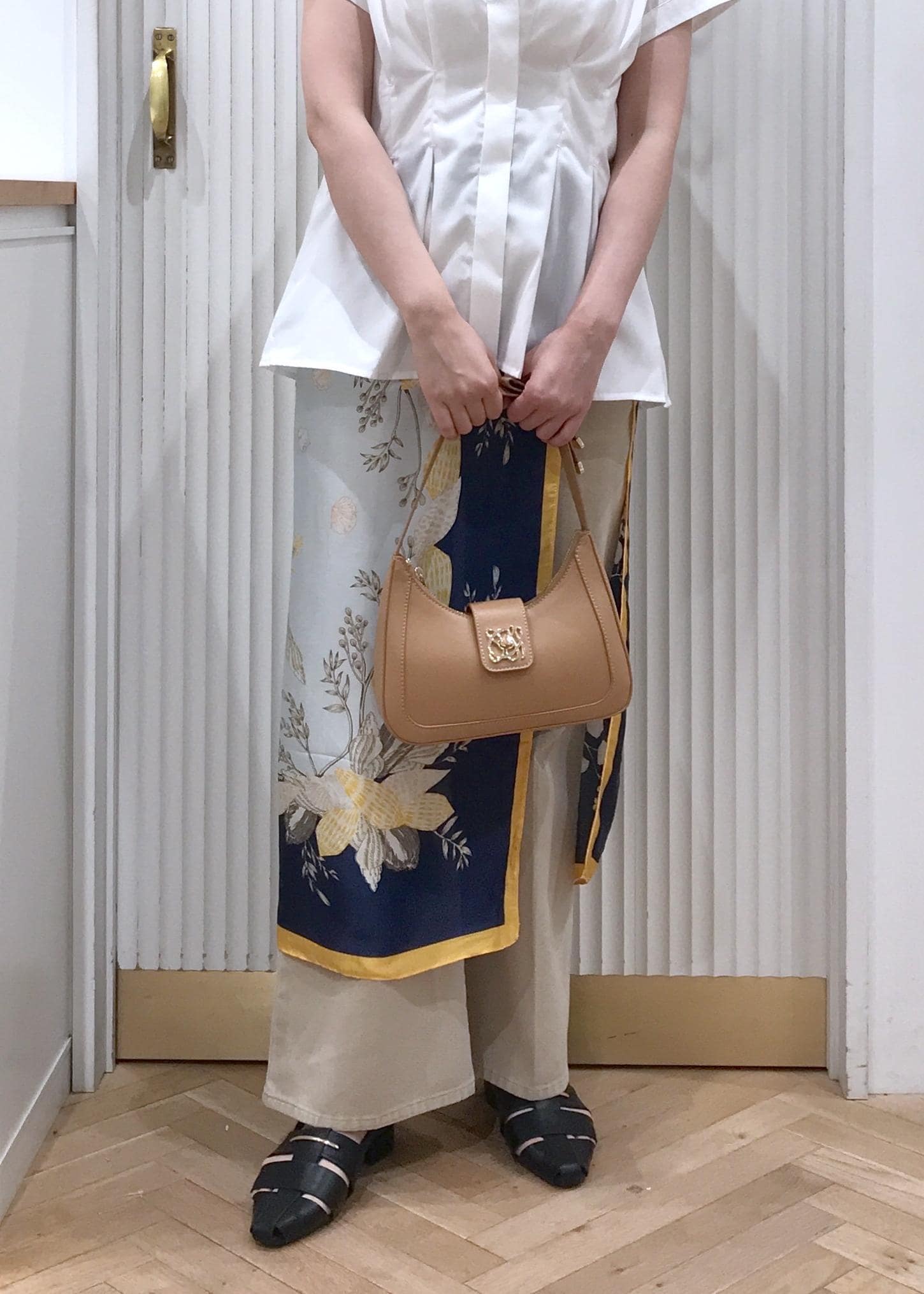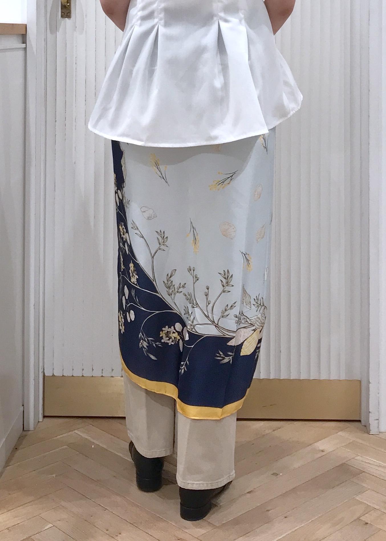 シンプルになり過ぎ無いようにスカーフを腰に巻いて華やかさをだしました。