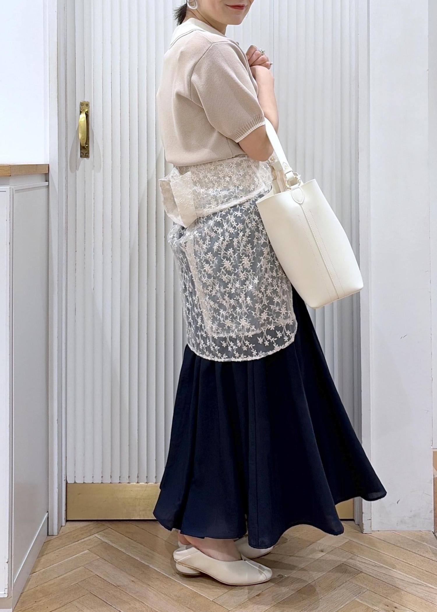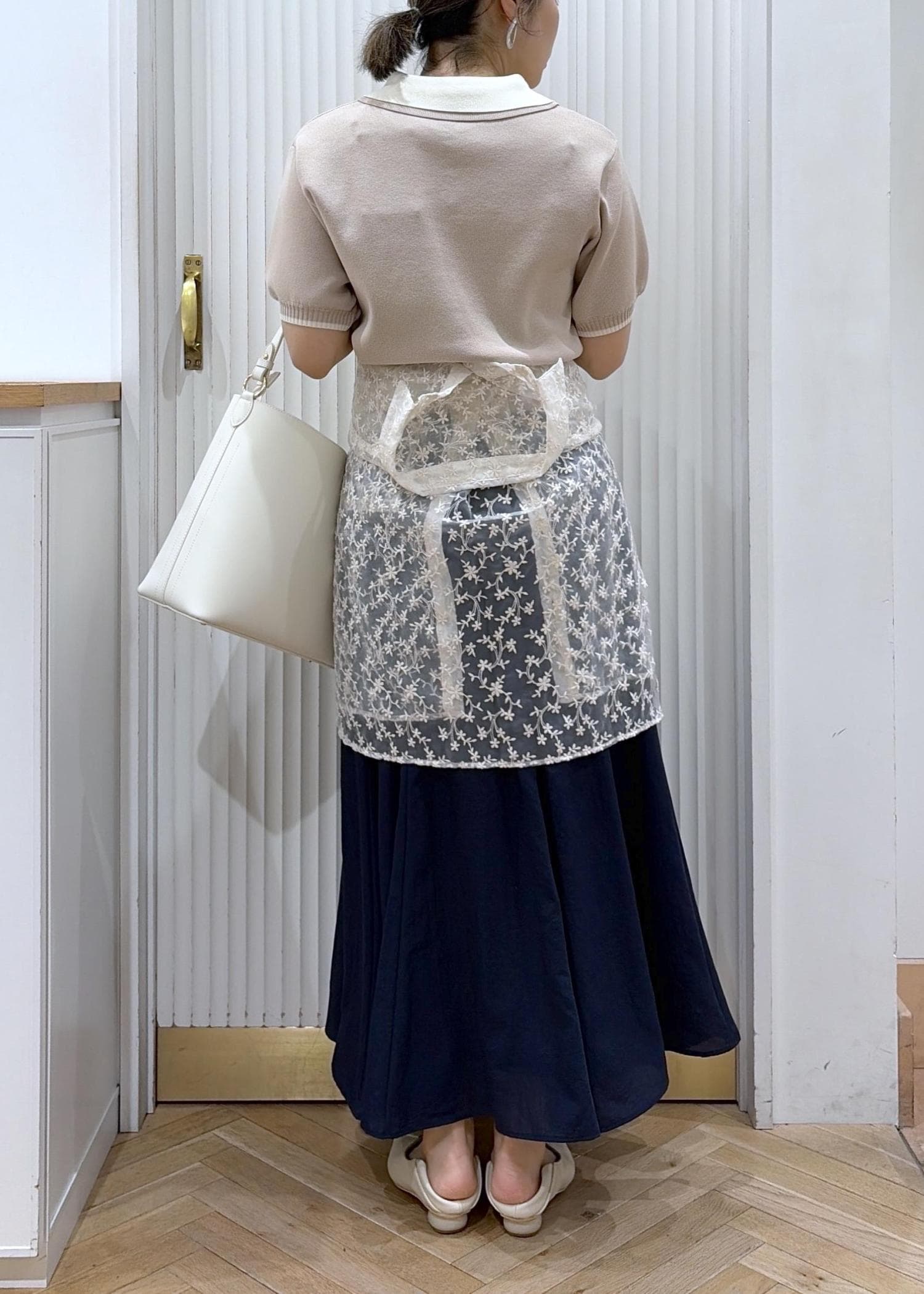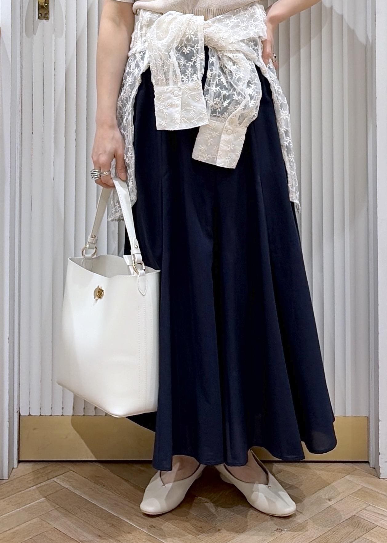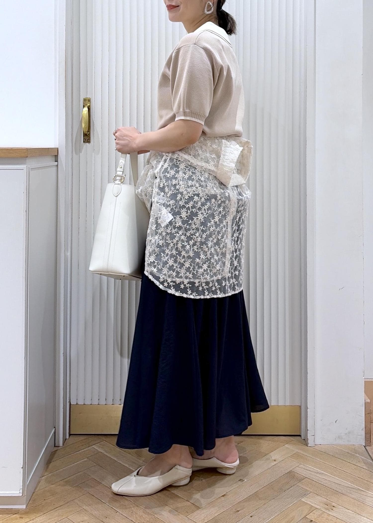 ウエストにはシアーシャツを巻いてトレンドを取り入れました。ほどよい抜けをつくり、かしこまりすぎない表情に。ホワイトの小物でクリーンにまとめた、大人のきちんとカジュアル。