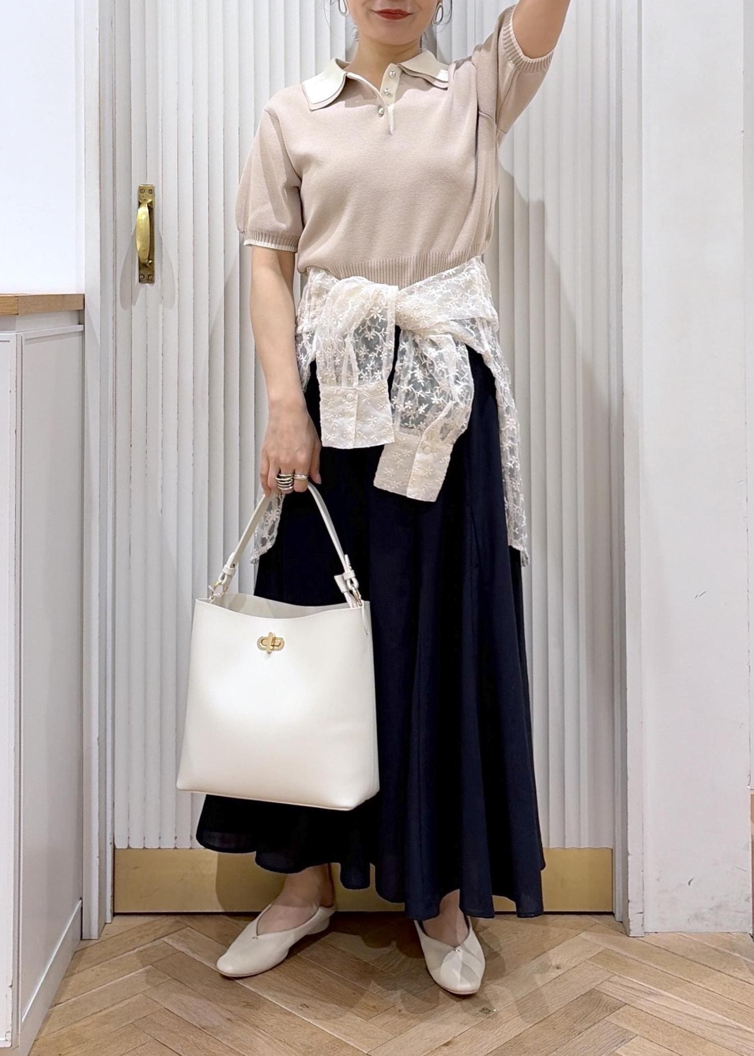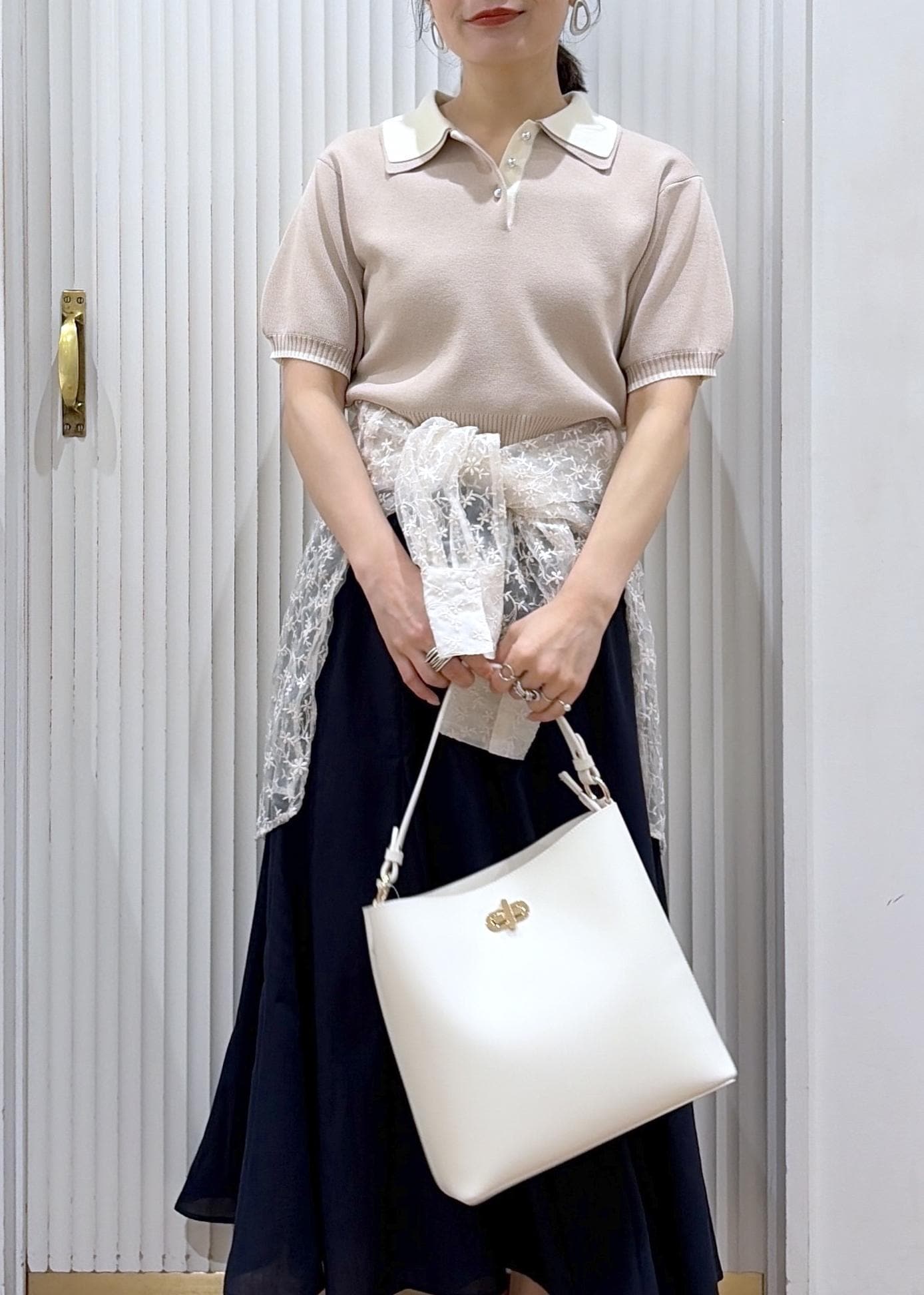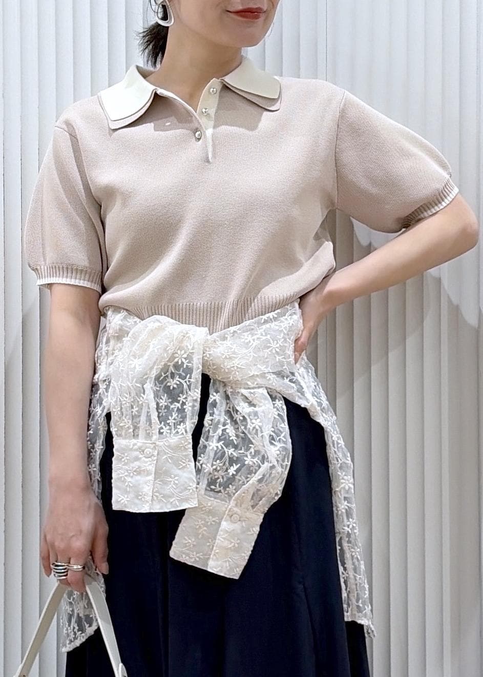 やさしいベージュのポロニットに、軽やかなネイビースカートを合わせて品よく。