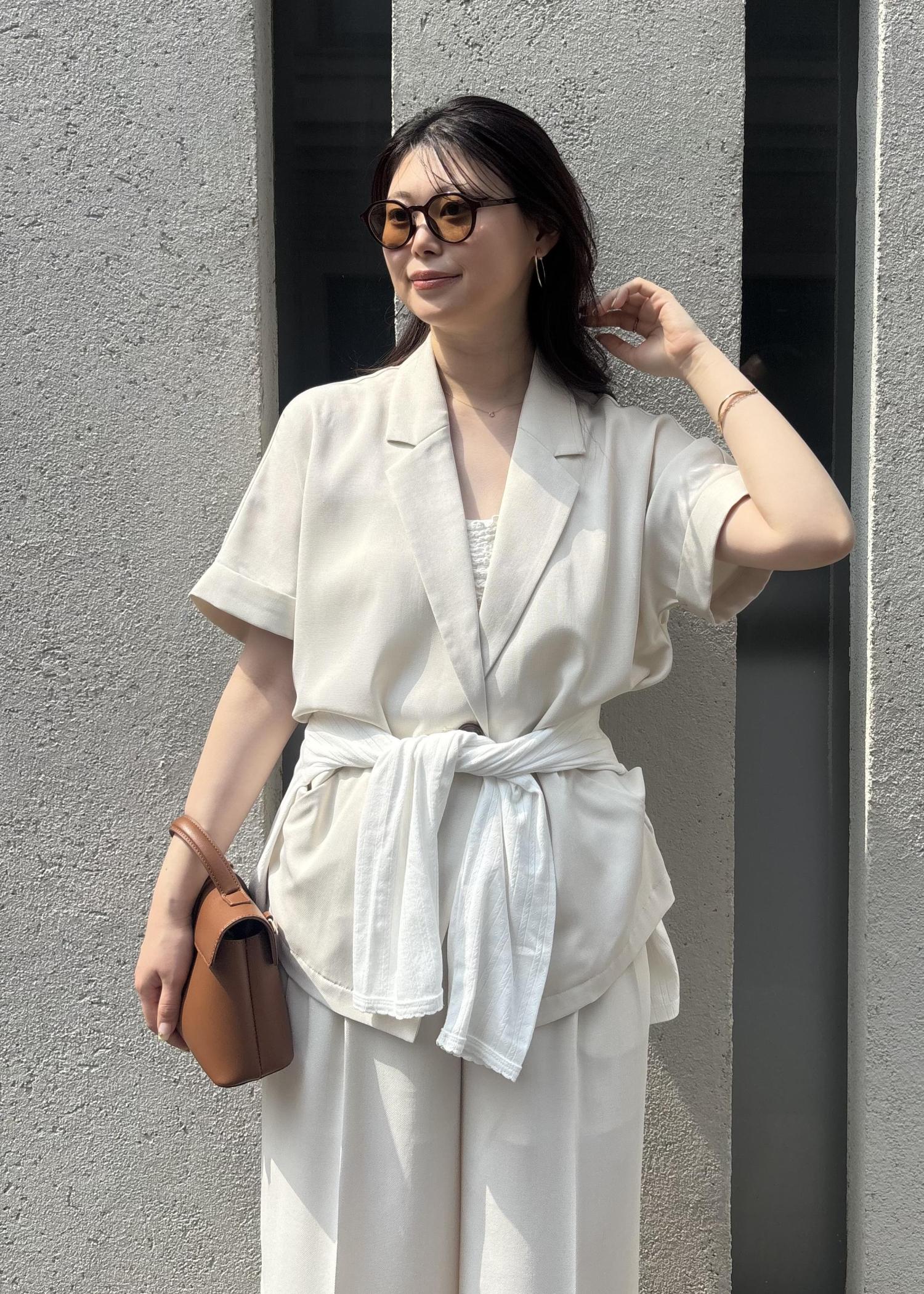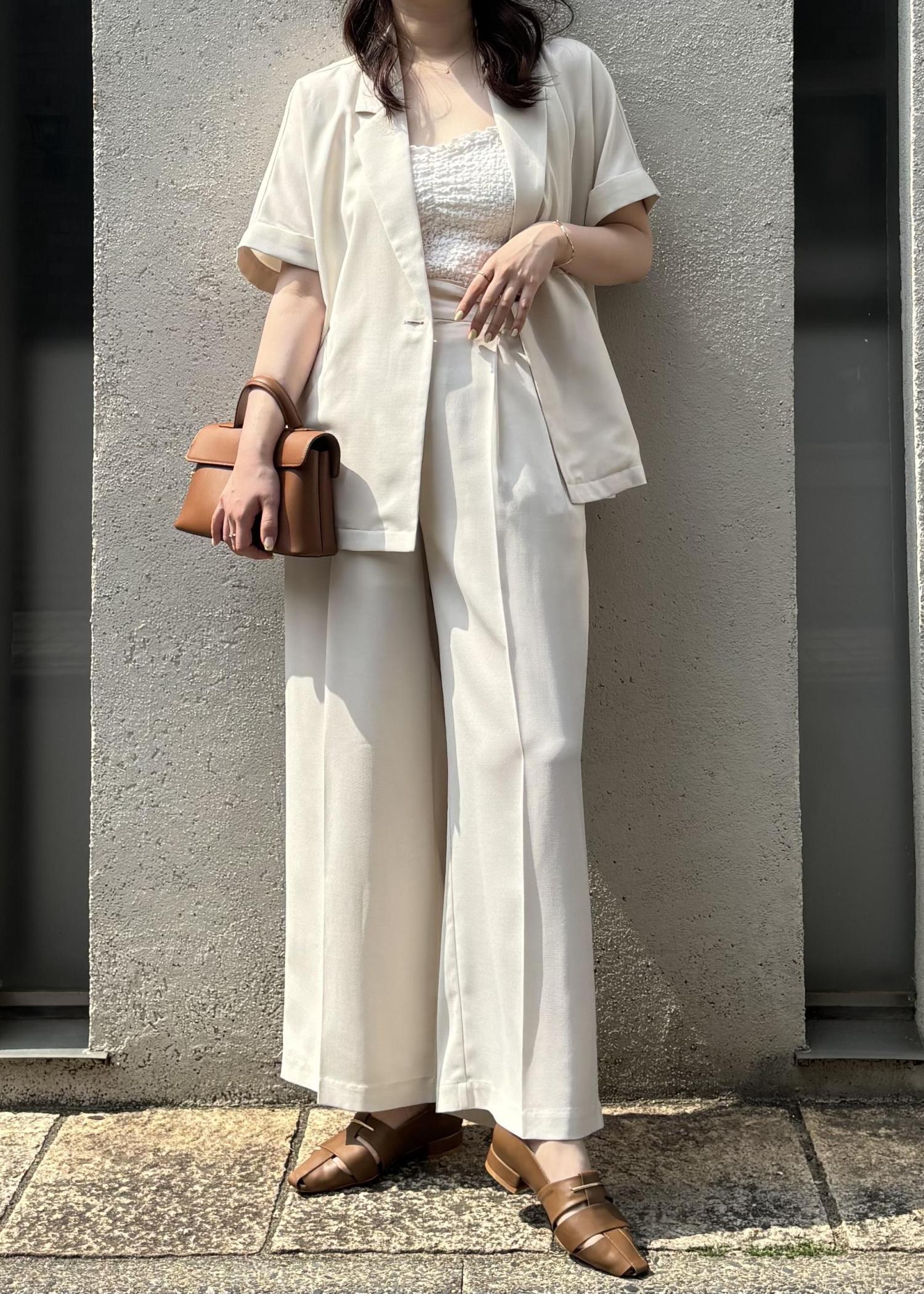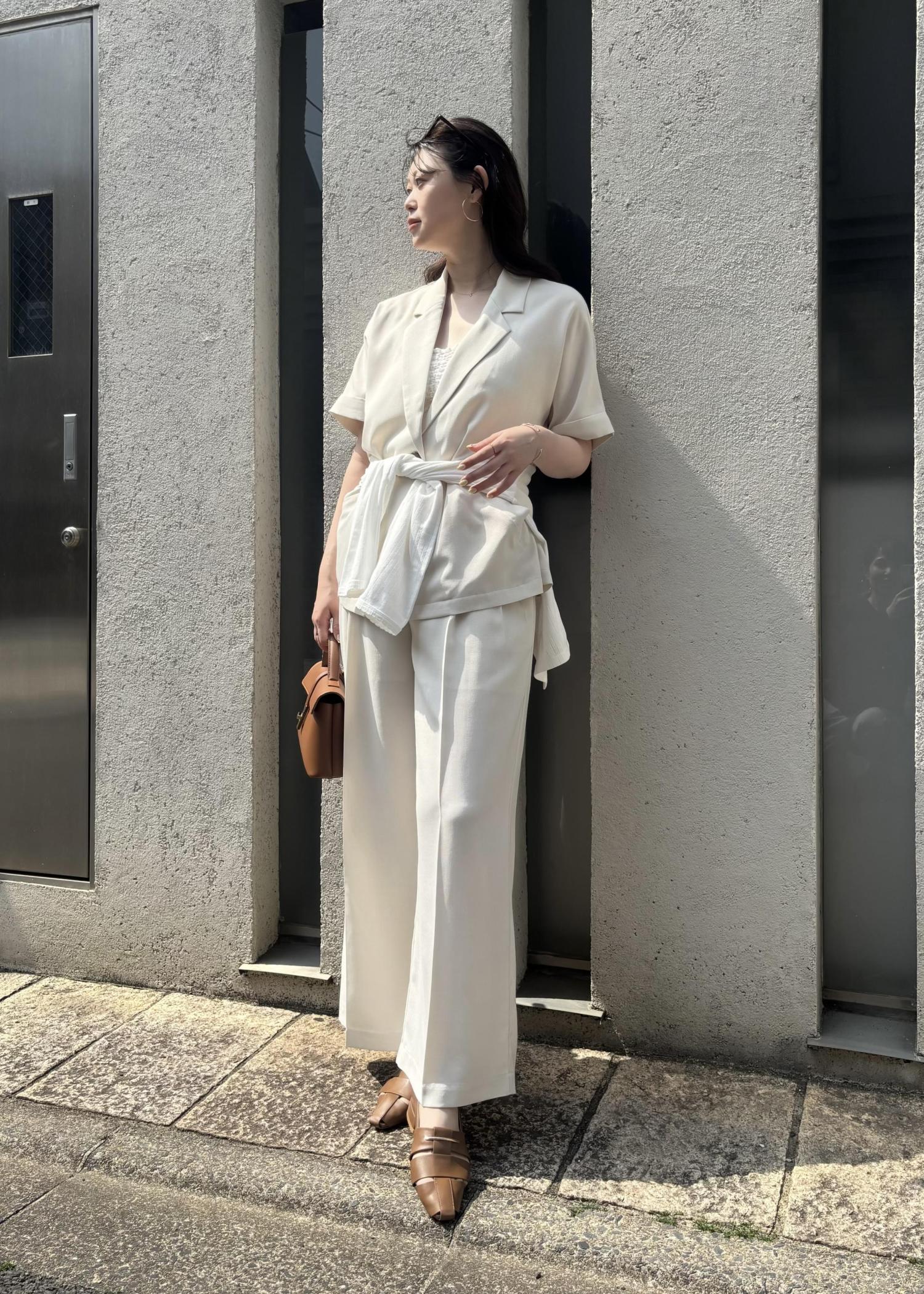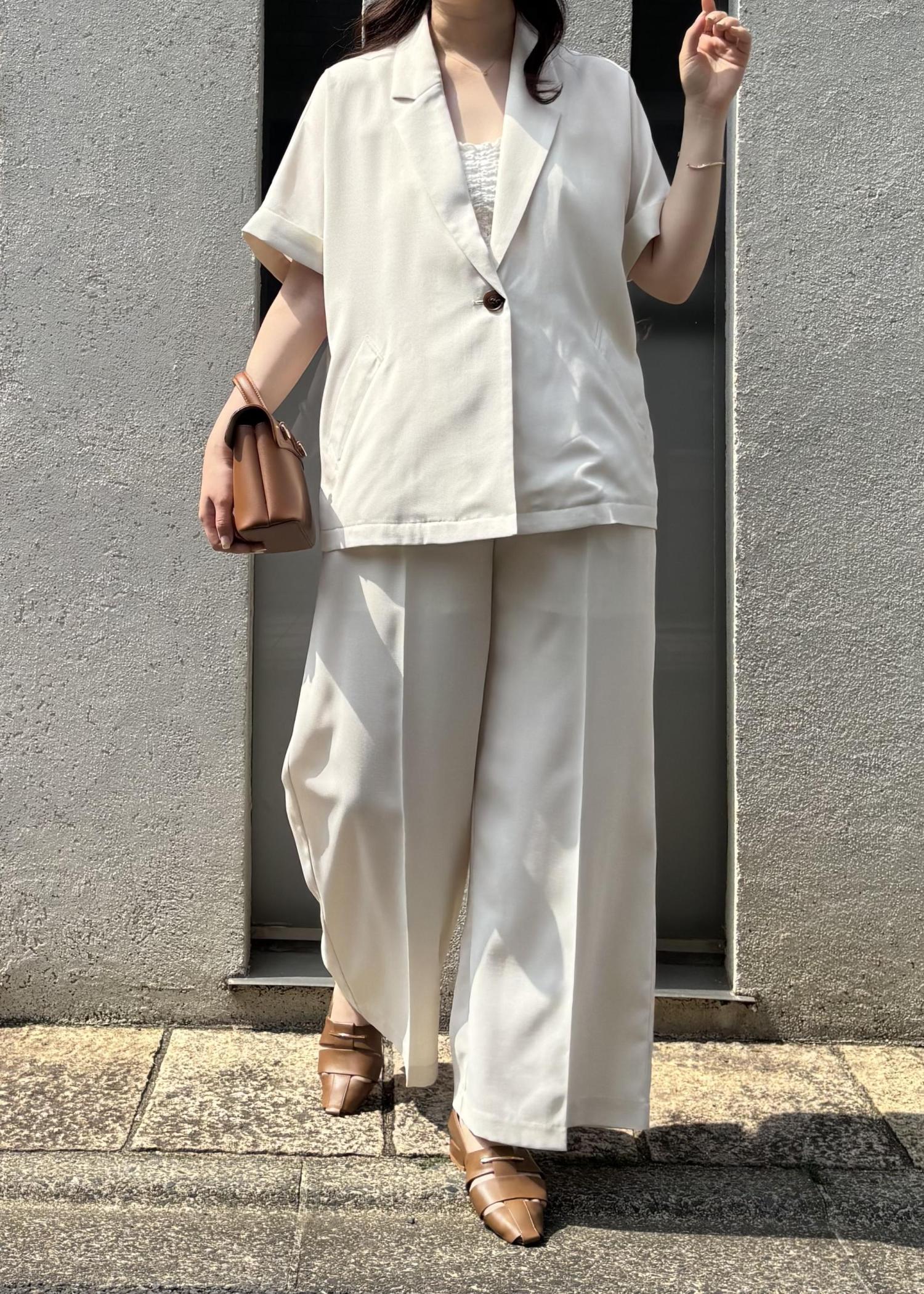 ジャケット×パンツのセットアップで、きちんと感がありつつも夏らしい抜け感をプラスし、お出かけやちょっとしたお食事シーンにもぴったりな、大人の余裕を感じるコーデにしてみました。