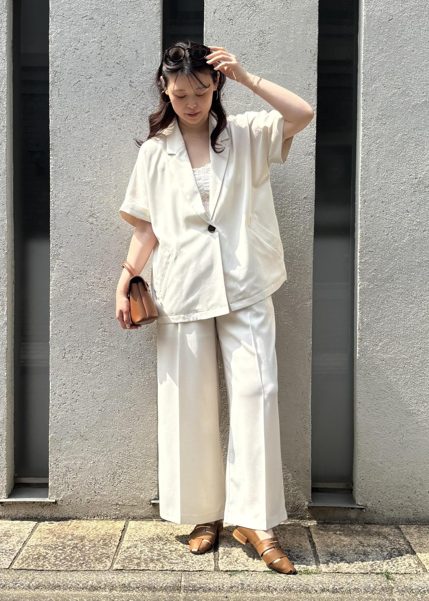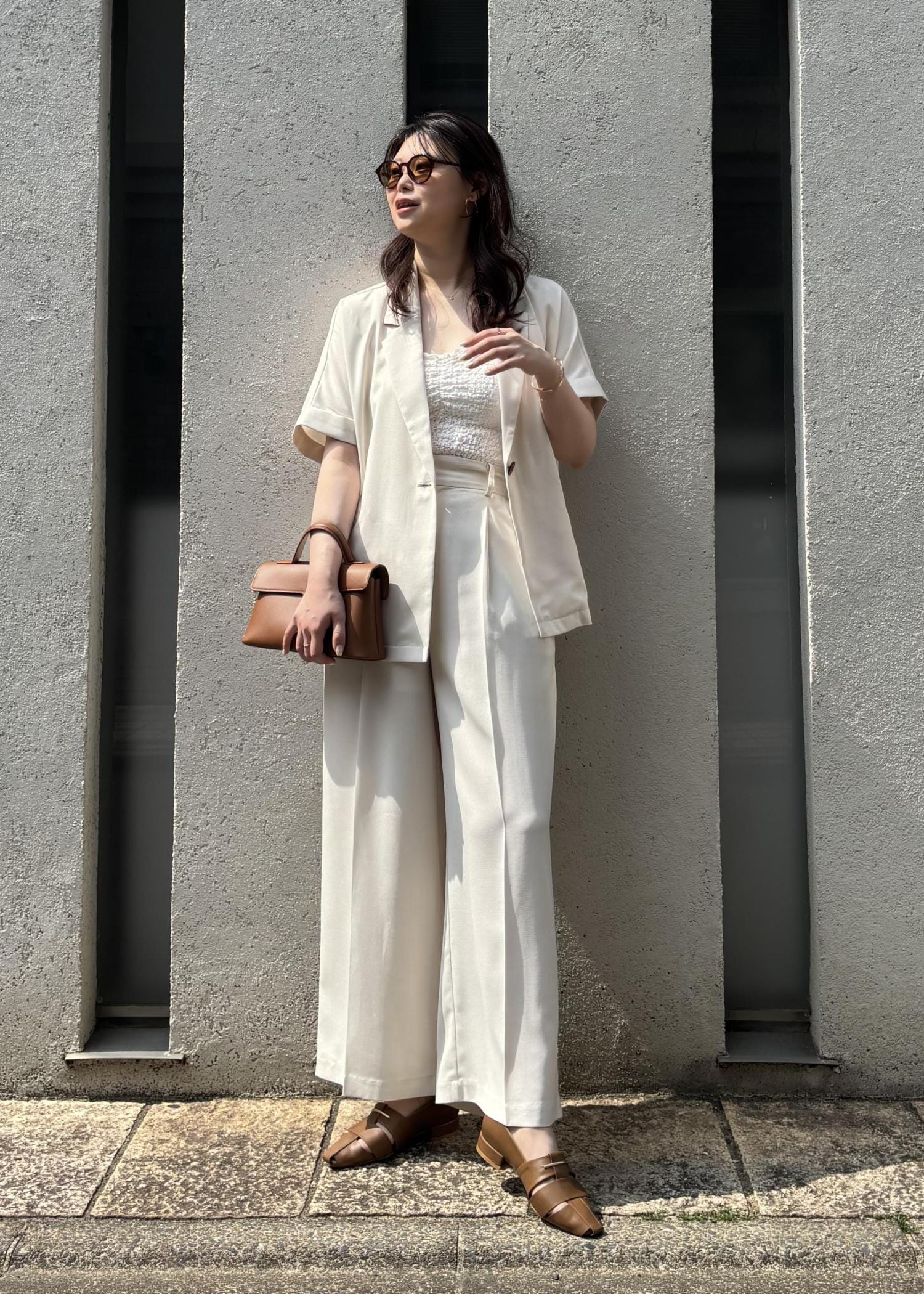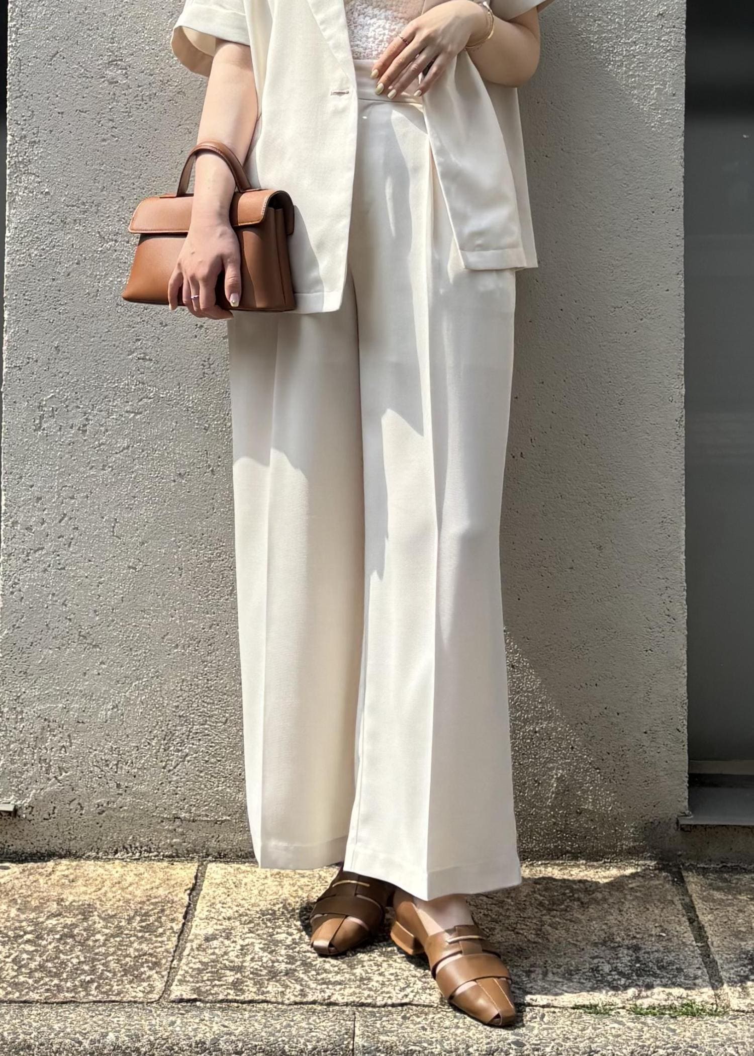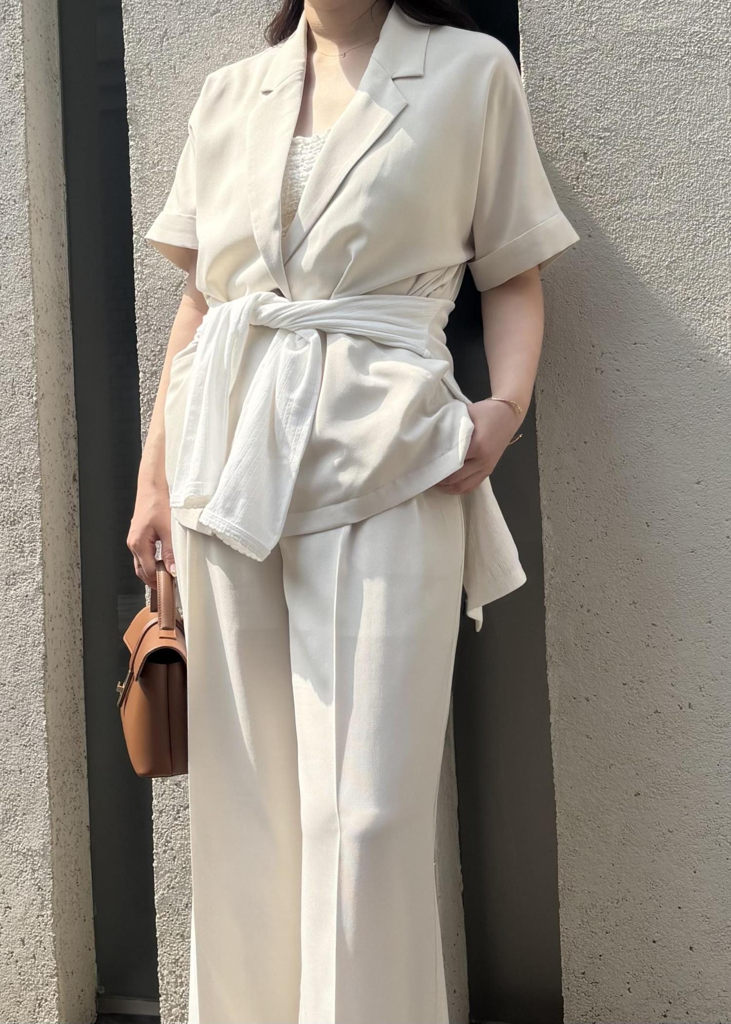 ジャケット×パンツのセットアップで、きちんと感がありつつも夏らしい抜け感をプラスし、お出かけやちょっとしたお食事シーンにもぴったりな、大人の余裕を感じるコーデにしてみました。