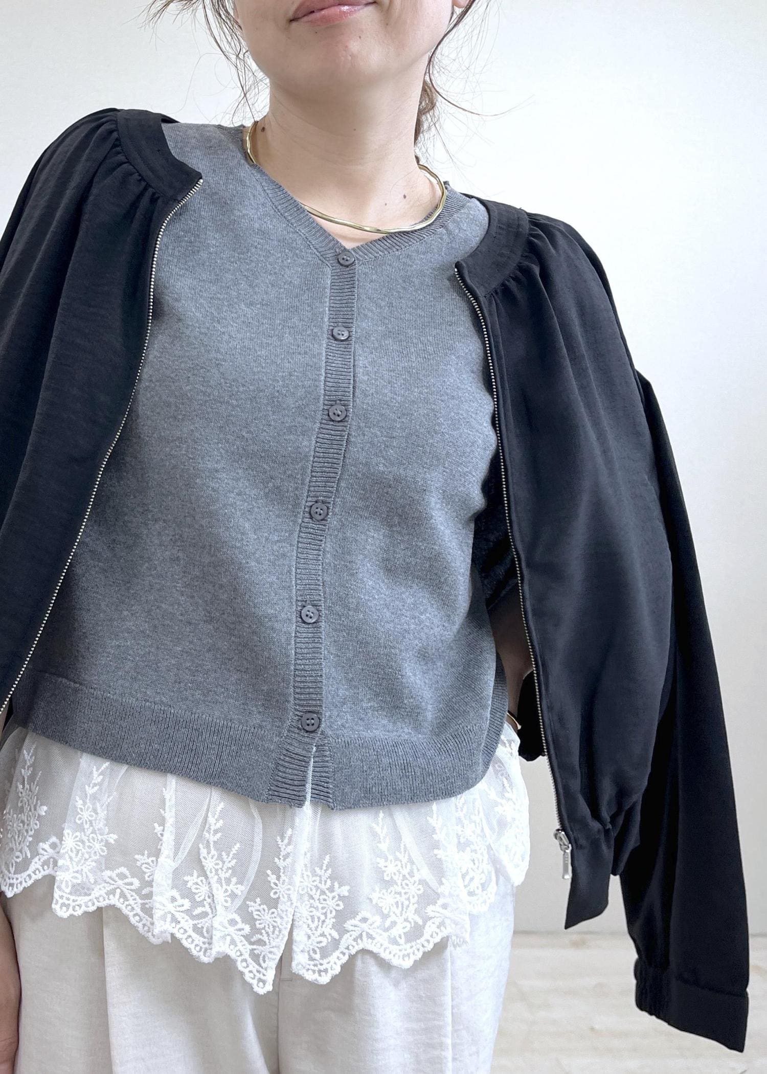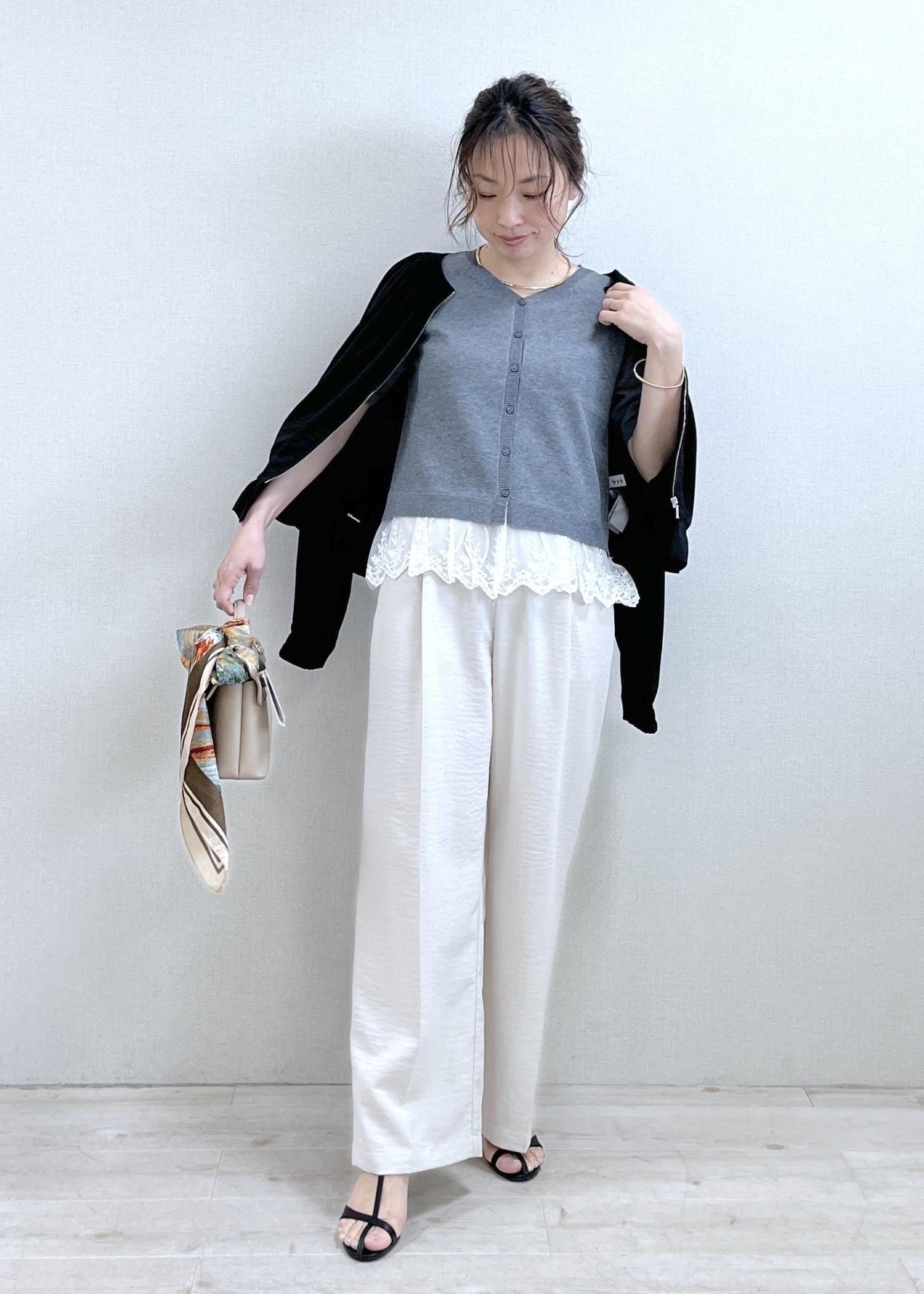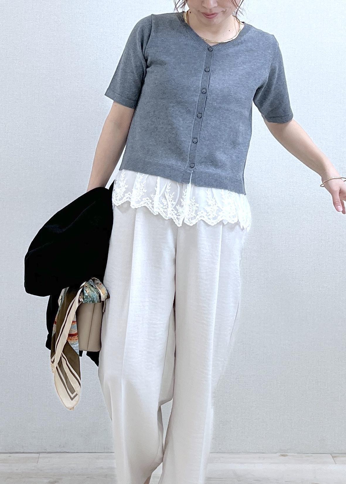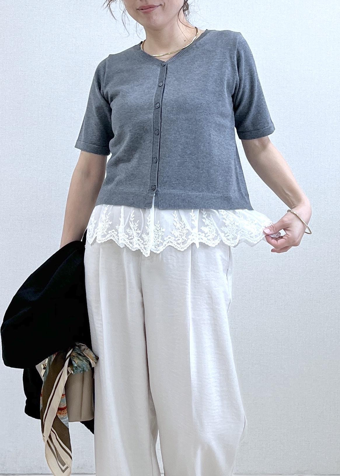 NEW!VISレースヘムVネックカーディガンライトグレー / F¥5,929レビュー152cmでFサイズ着用し、着丈は腰にかかるくらいの丈。サラッとした涼しい素材感の薄手のニットカーデです。羽織としてもお召しいただけ、裾レースがドッキングされているのでそのまま着ていただくだけで、着映えも◎ややすっきりしたシルエットのカーデでサイズ感もコンパクトでした。
