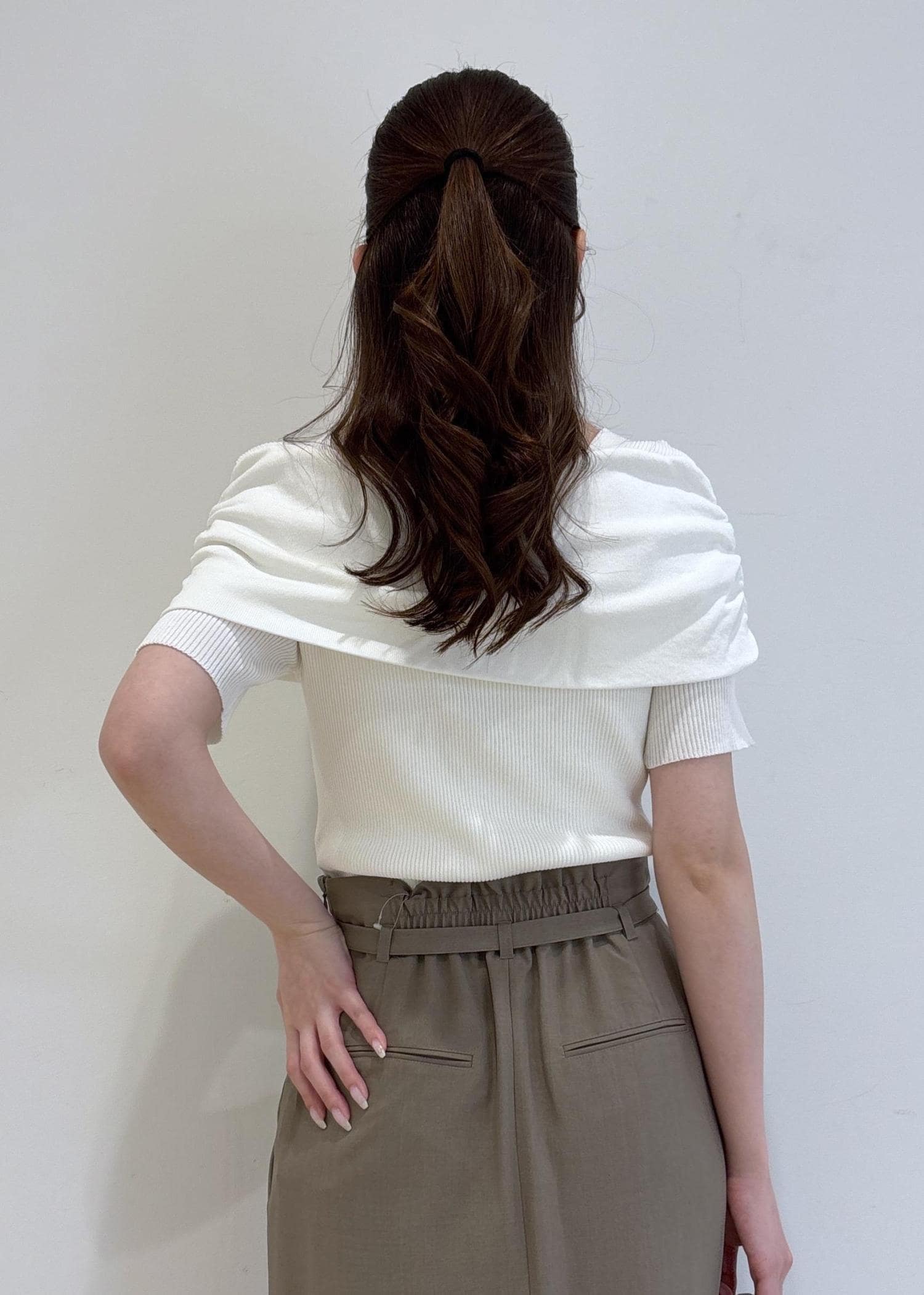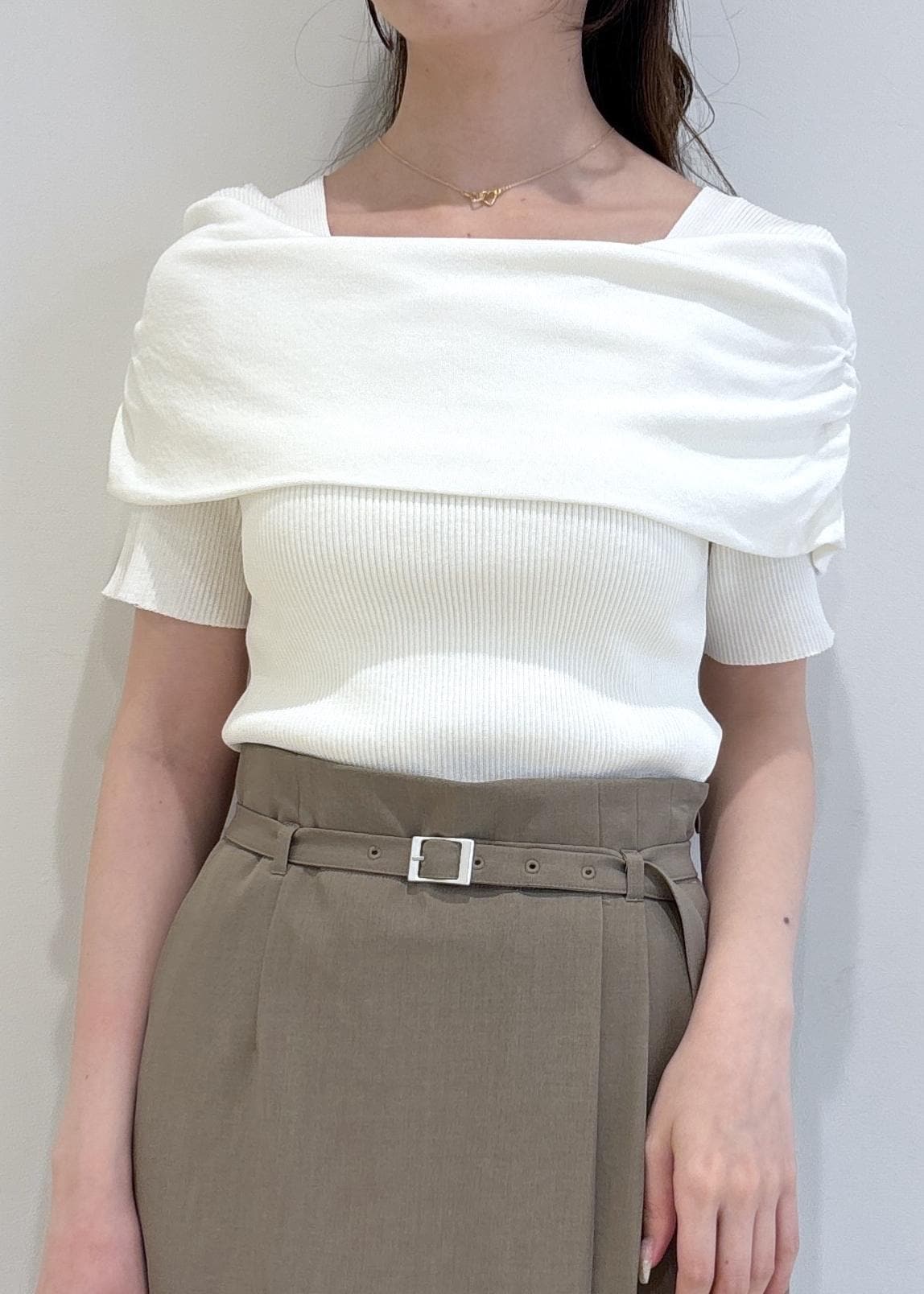 トップスは首回りが開きすぎなく、デコルテが綺麗に見えて抜け感があります。チェーンが細めのネックレスを合わせるのがオススメです♪
