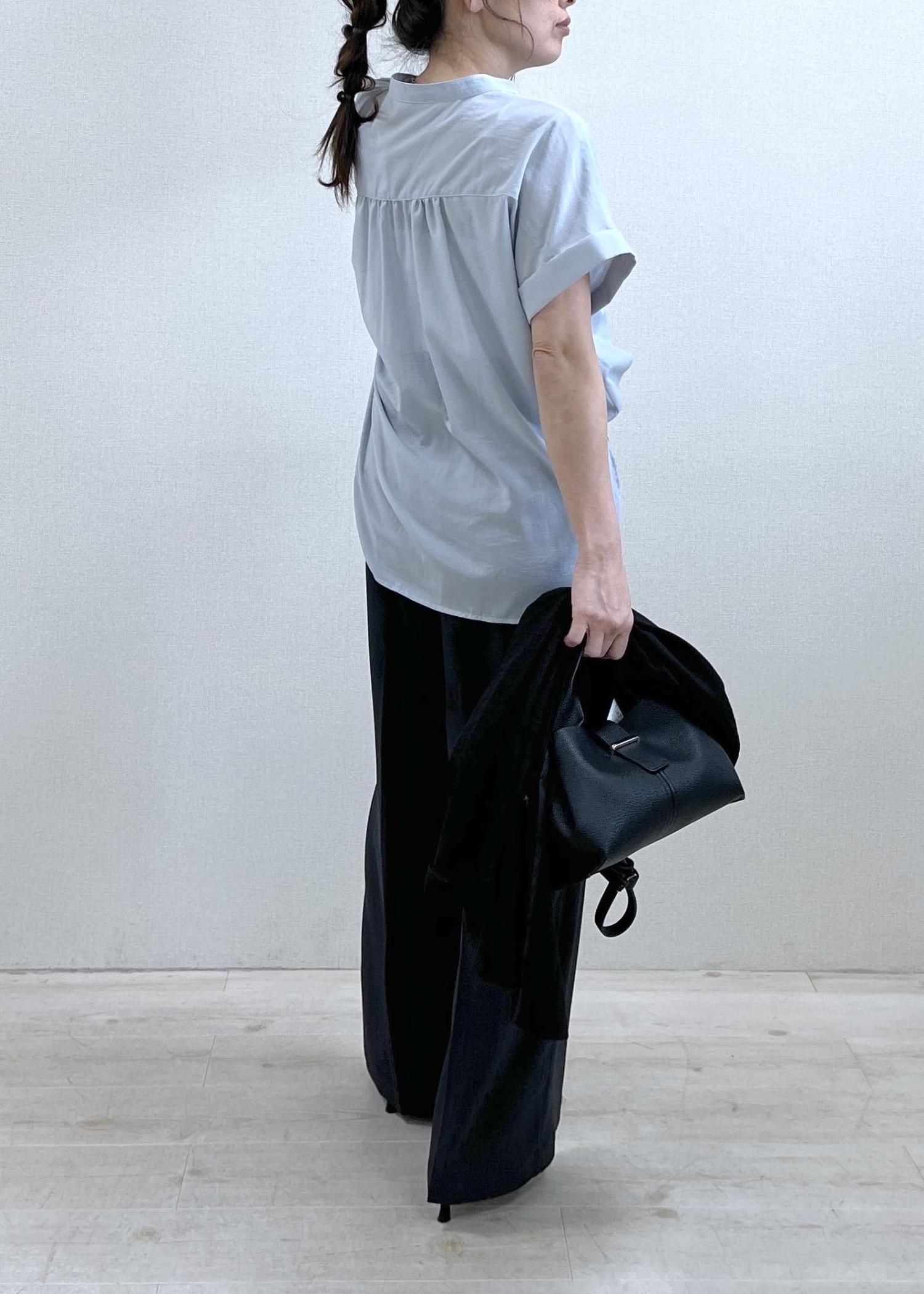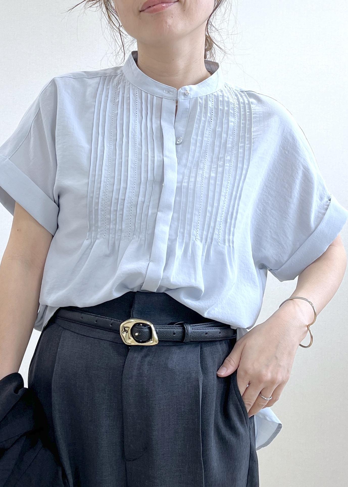 VIS気流染めピコピンタック半袖ブラウス/接触冷感サックス / F¥5,489レビューFサイズ着用し、着丈はお尻が隠れる丈。ややゆったりサイズの毎年定番ブラウスです。ややシアー感があり涼しげにお召しいただけます。ピンタックデザインで胸周りすっきり見え!シンプルながらもアクセントのあるデザインです。ON.OFF兼用で使用できるアイテムで、合わせ次第でガラッと見え方も変えられるのも嬉しいポイントです。