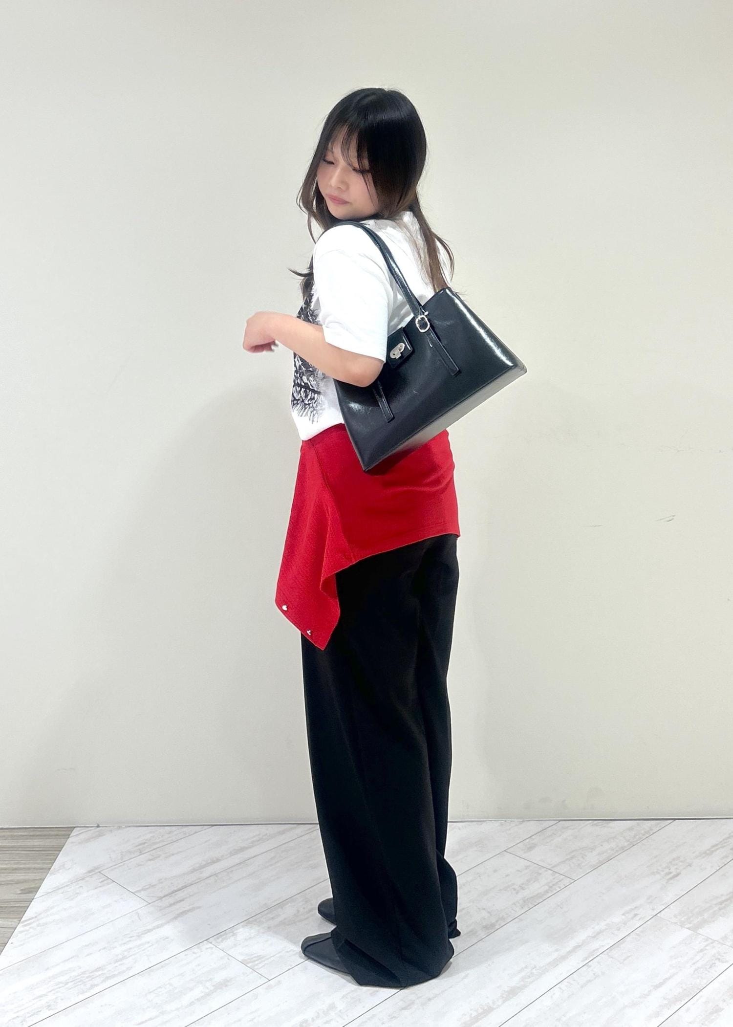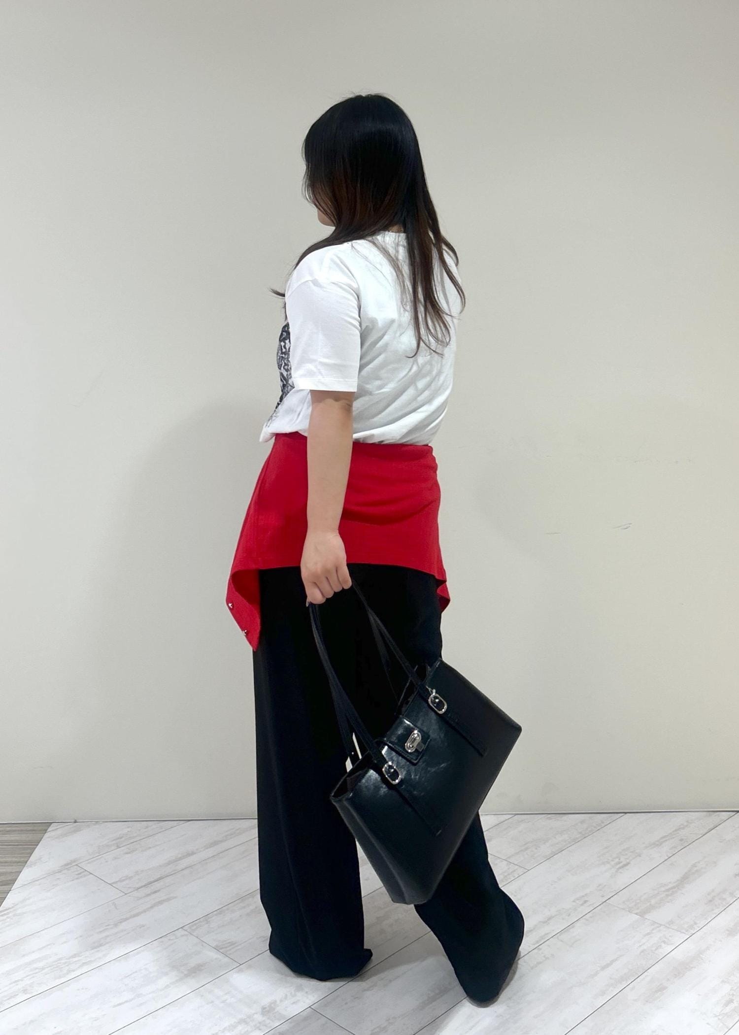 いつもモノトーンコーデが多い私ですが、赤のカーディガンを腰に巻いてポイントを入れてみました❤️