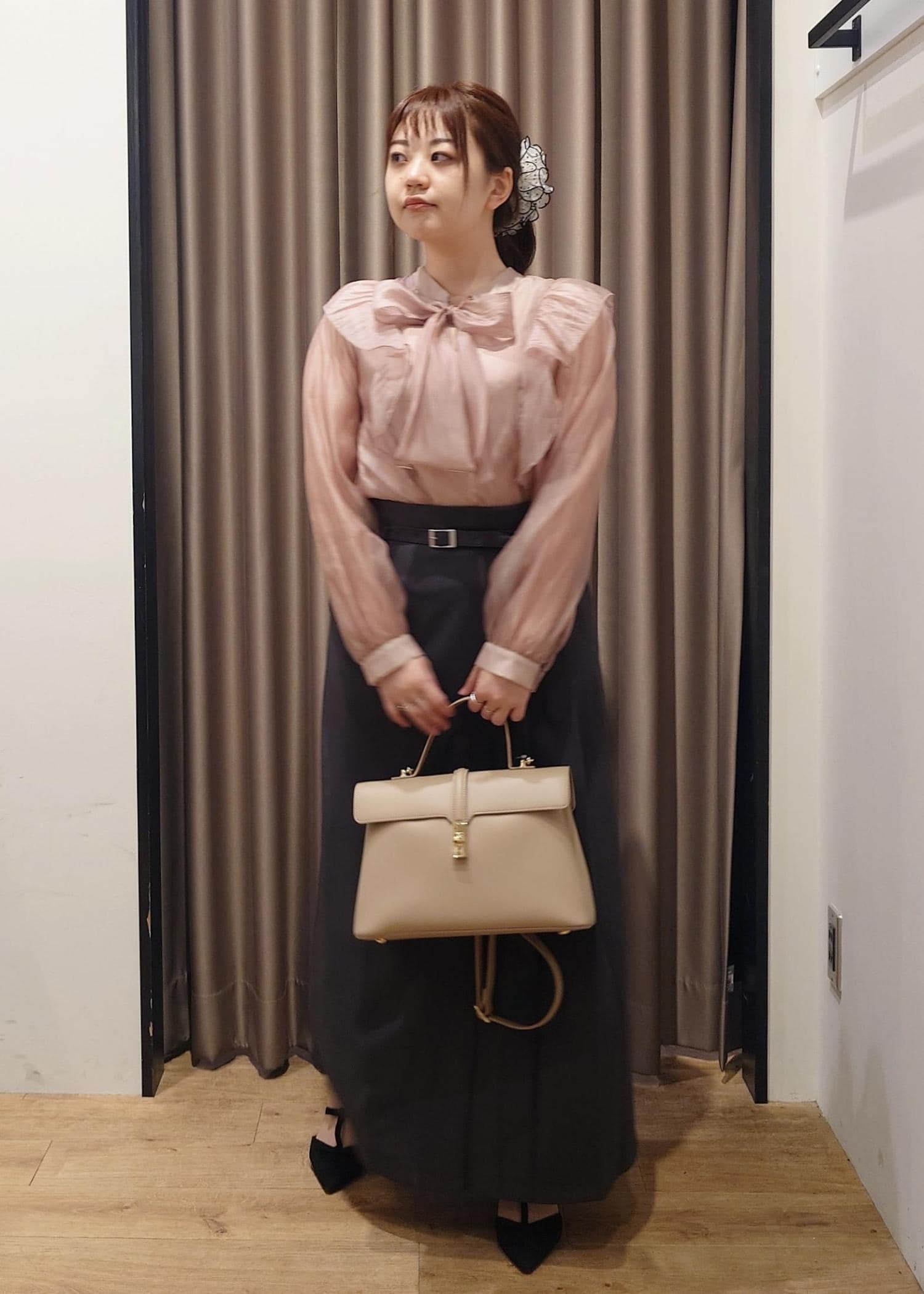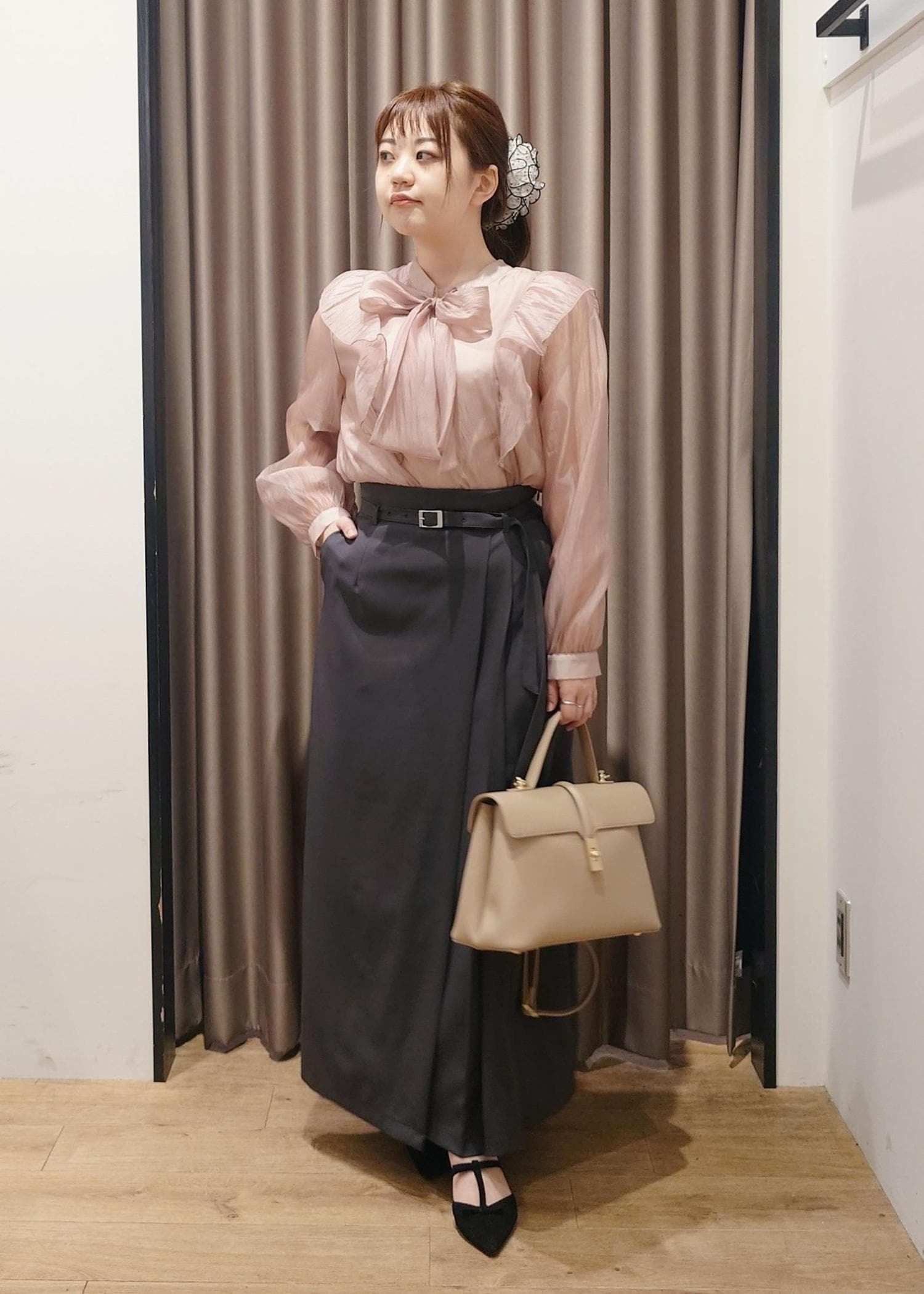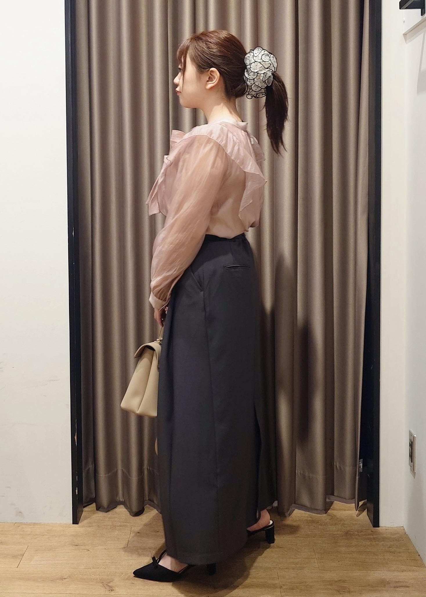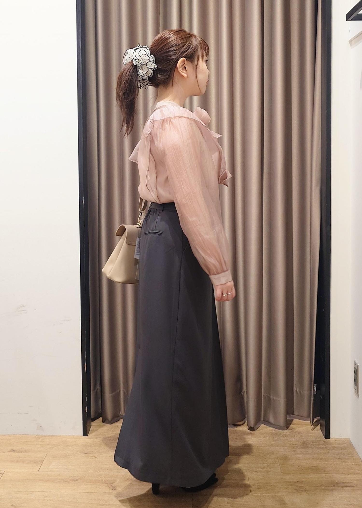 トップスにボリュームがあるので、アイラインのスカートで落ち着いた雰囲気も取り入れました。