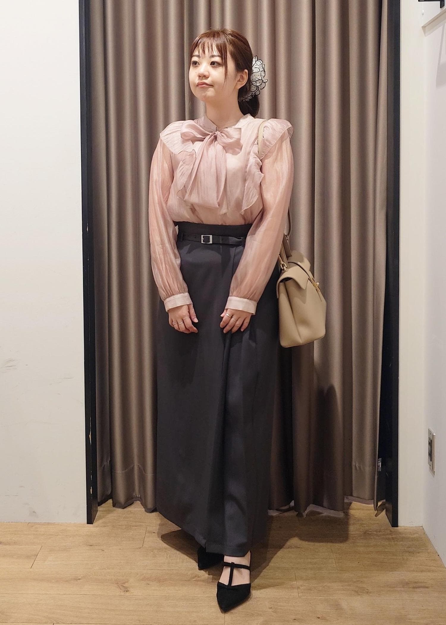ピンクのボウタイブラウスが可愛いフェミニンワークスタイル。