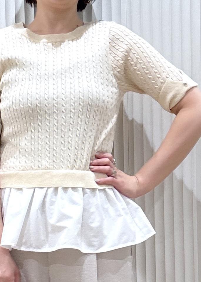 VISレイヤードケーブルハーフスリーブニットベージュ / F¥5,929レビューケーブル部分がジャストサイズでおばさん体型の私は二の腕やボディラインが気になりました。