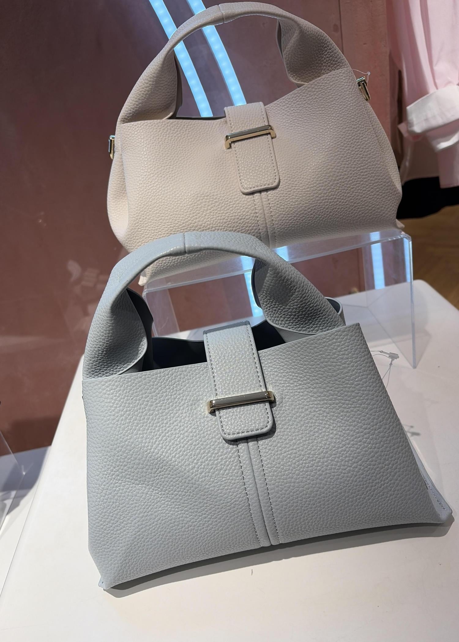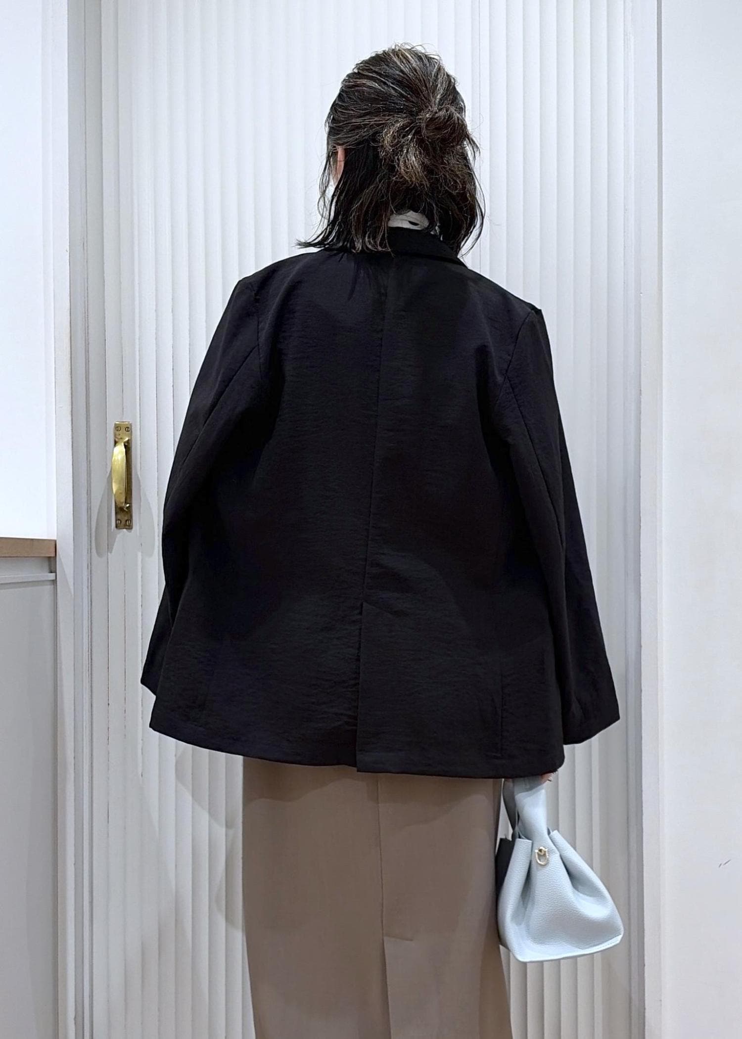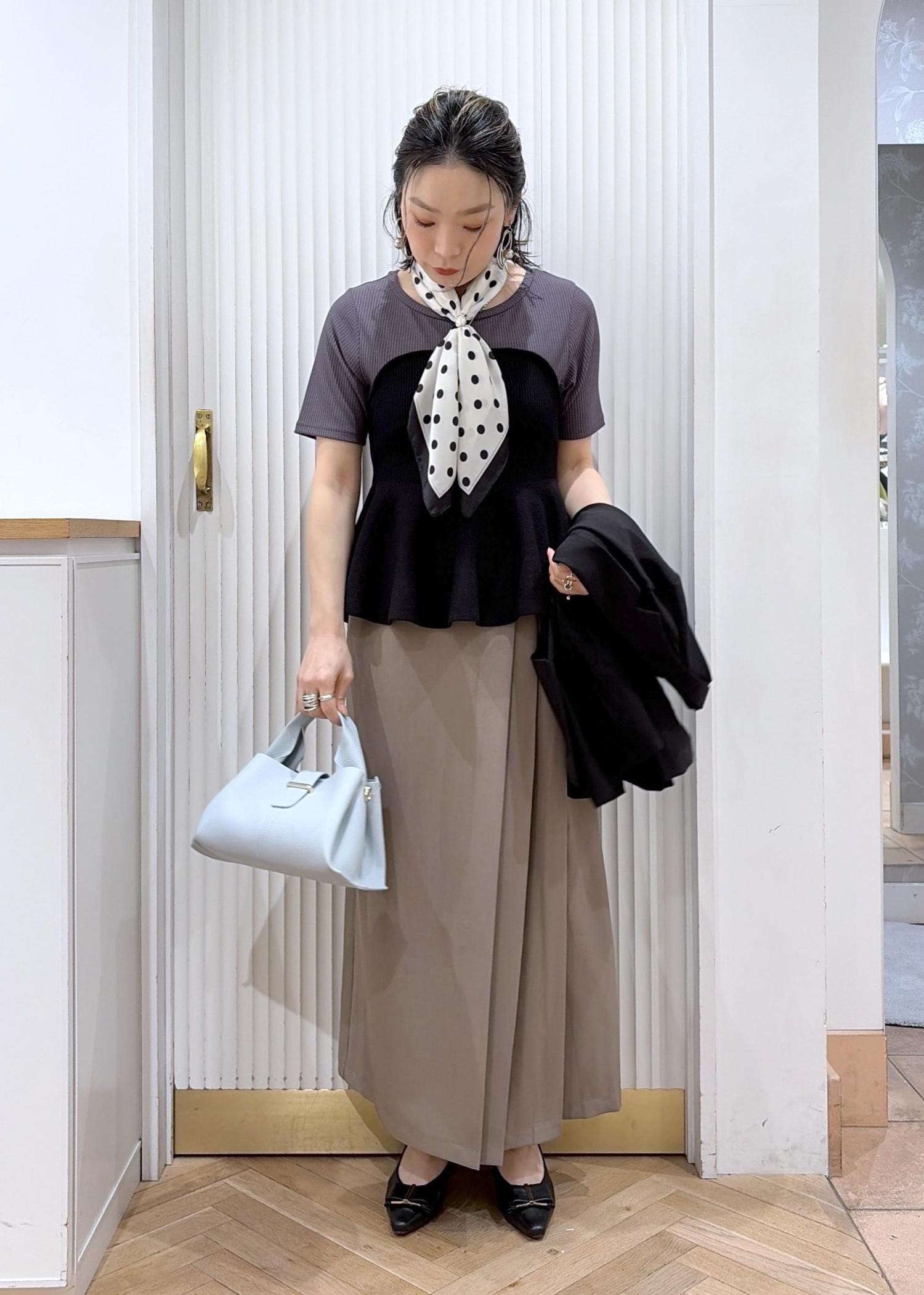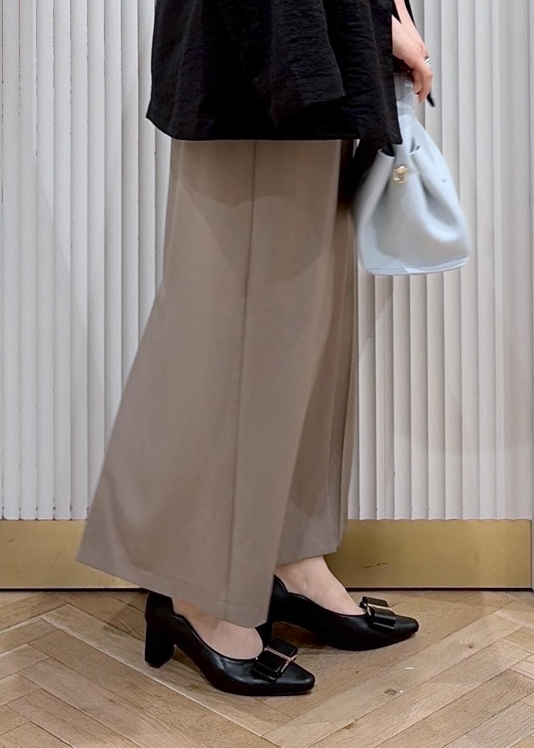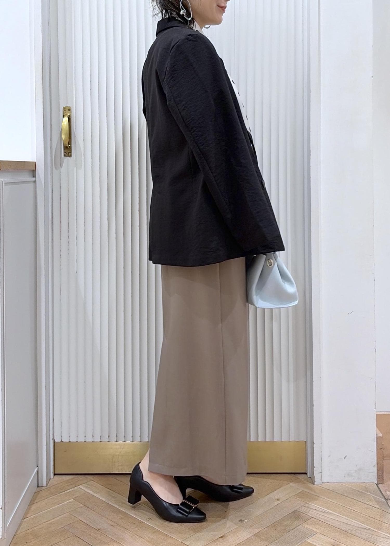 淡いブルーのバッグで軽さを足して、全体をやわらかい印象に。