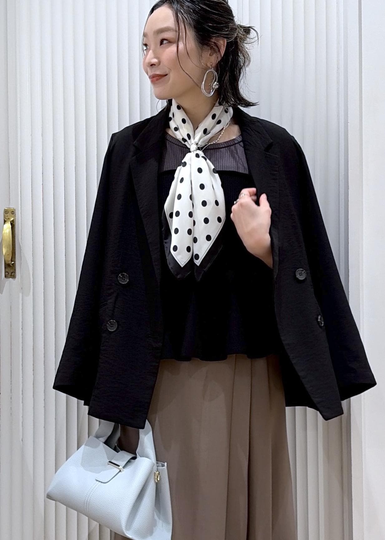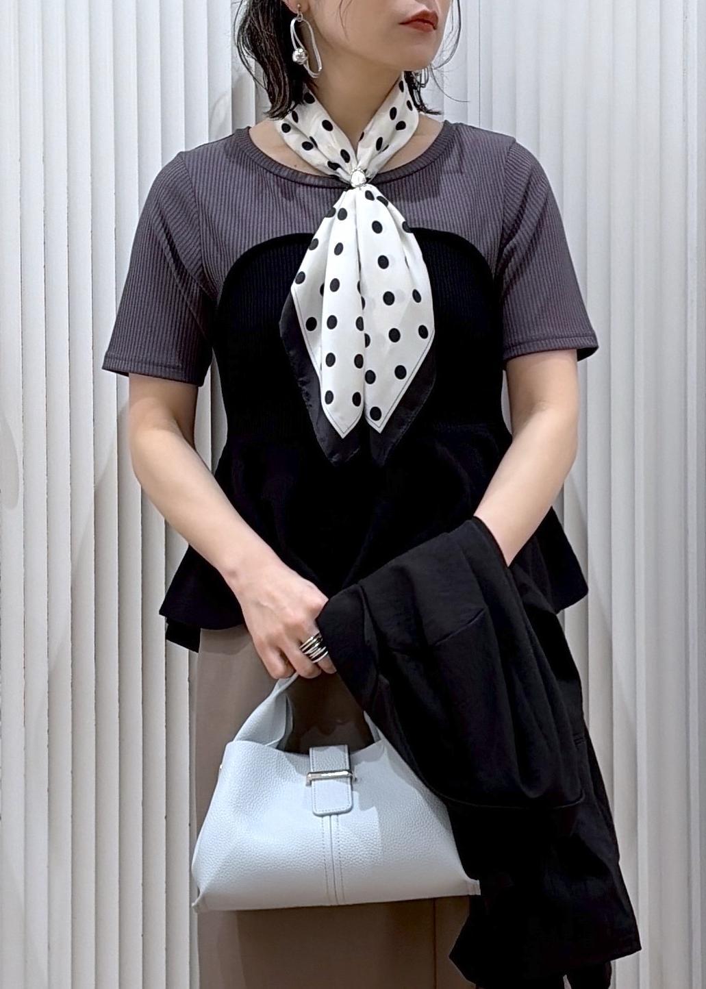 ドットのスカーフで顔まわりにポイントをつけています。
