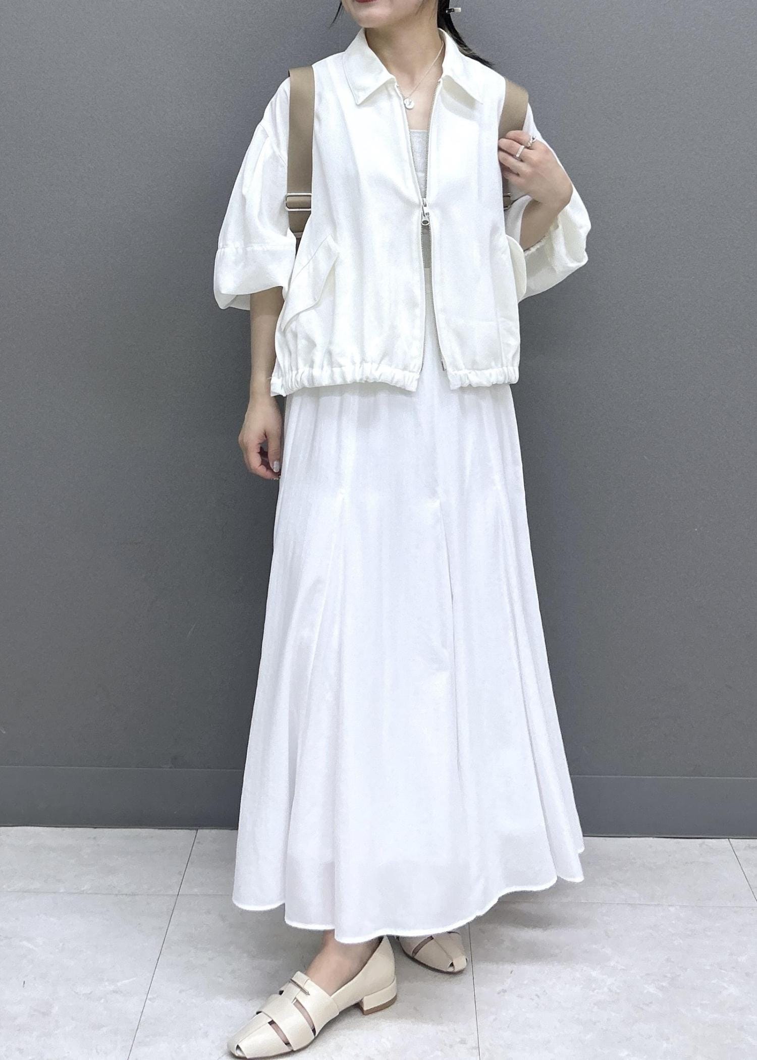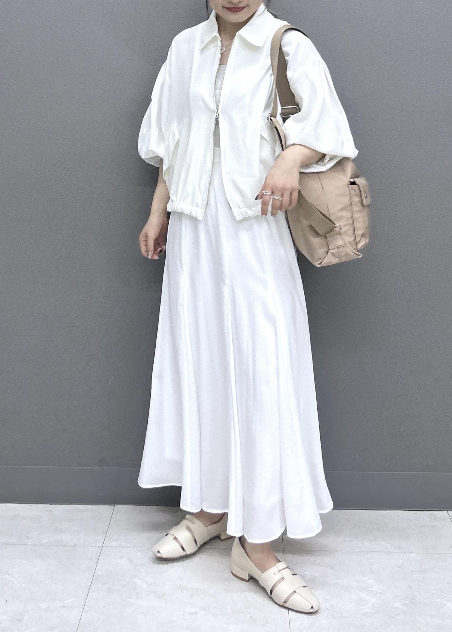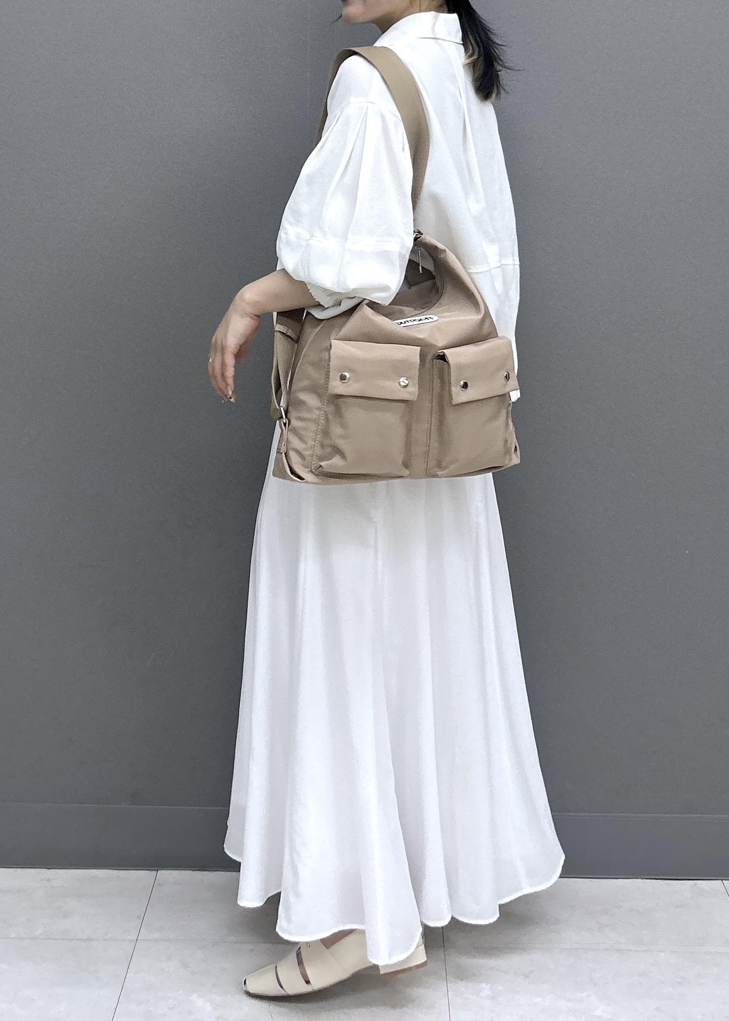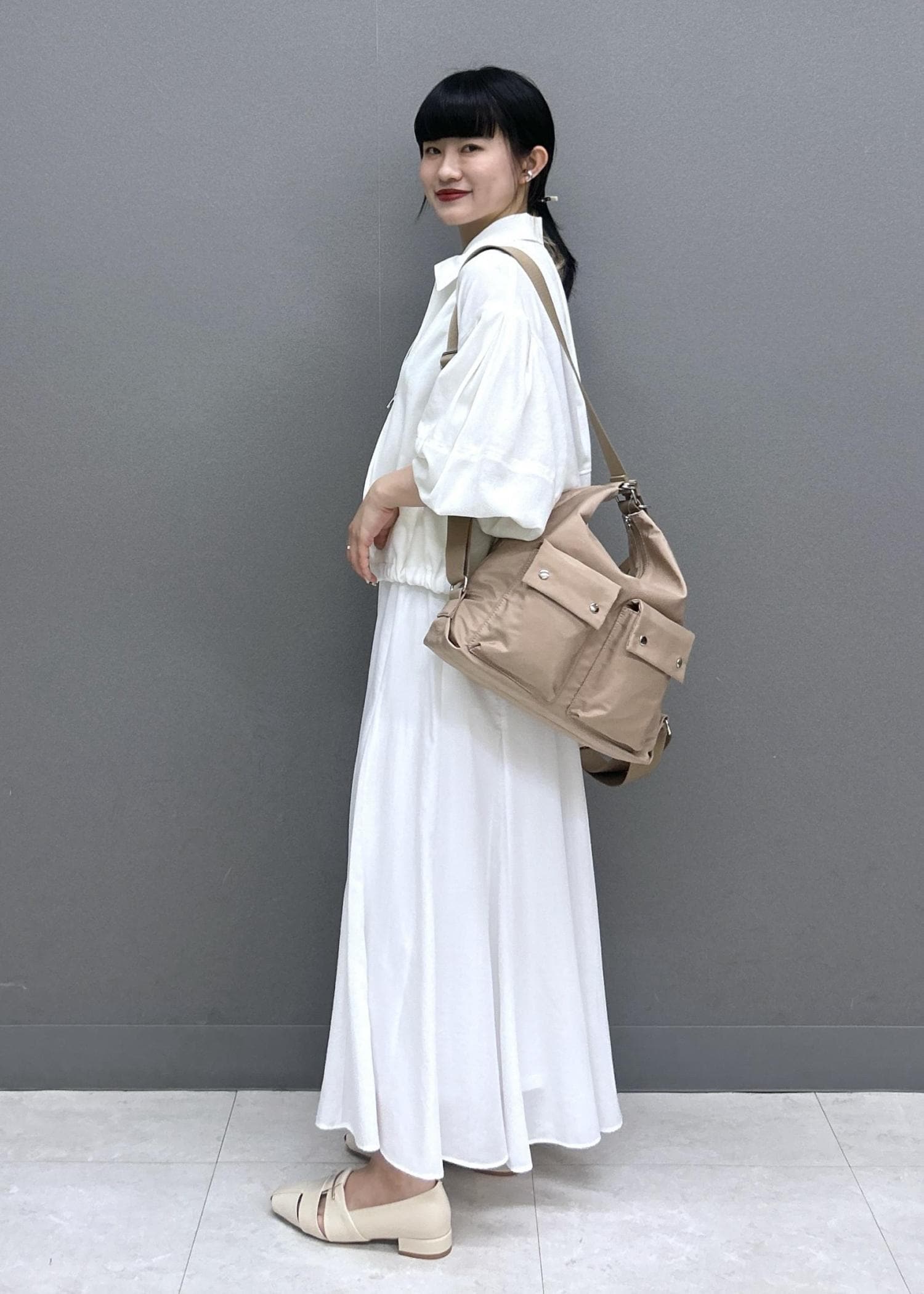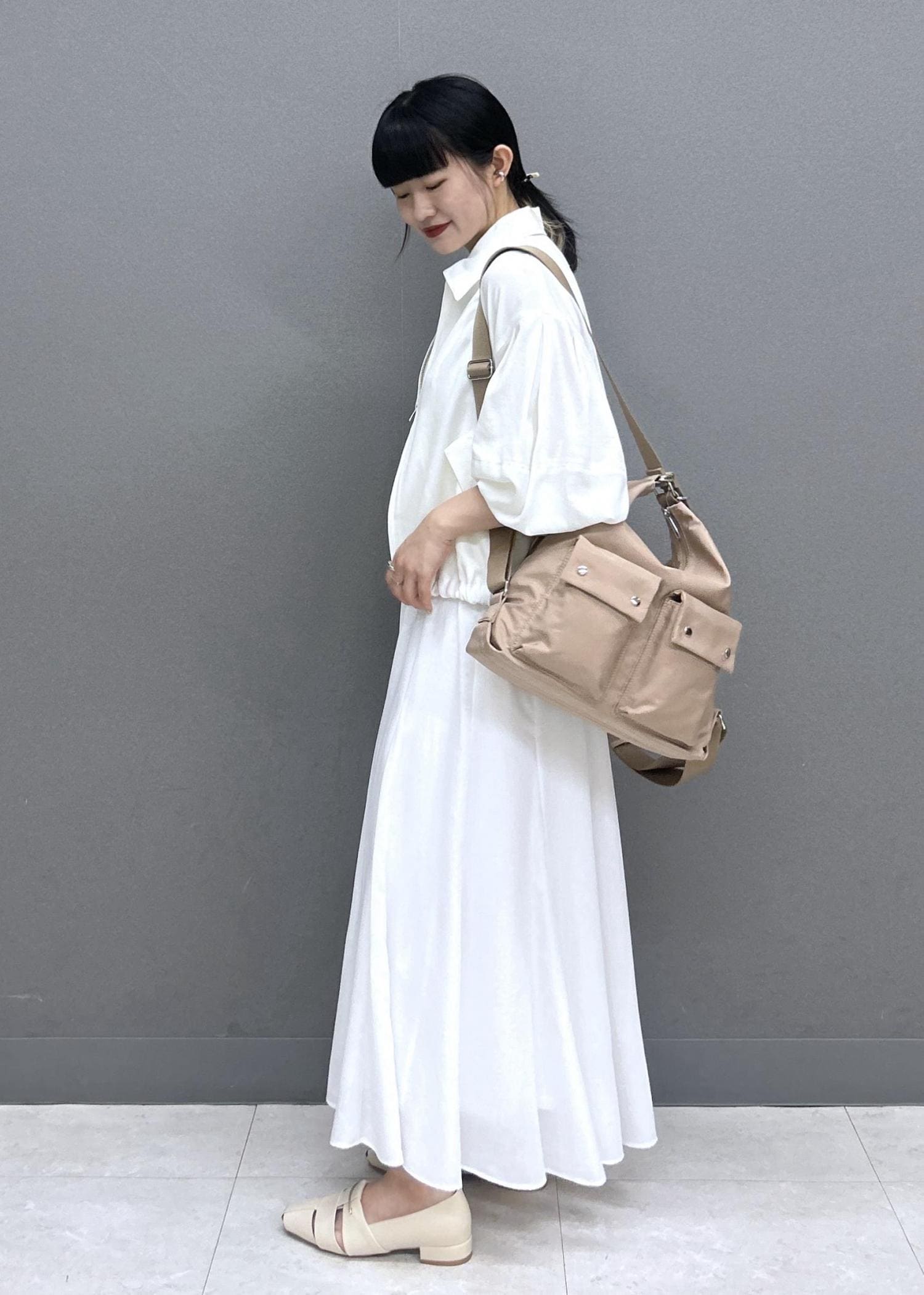 春らしいホワイトスタイリングには、バッグもベージュで柔らかい印象に◎