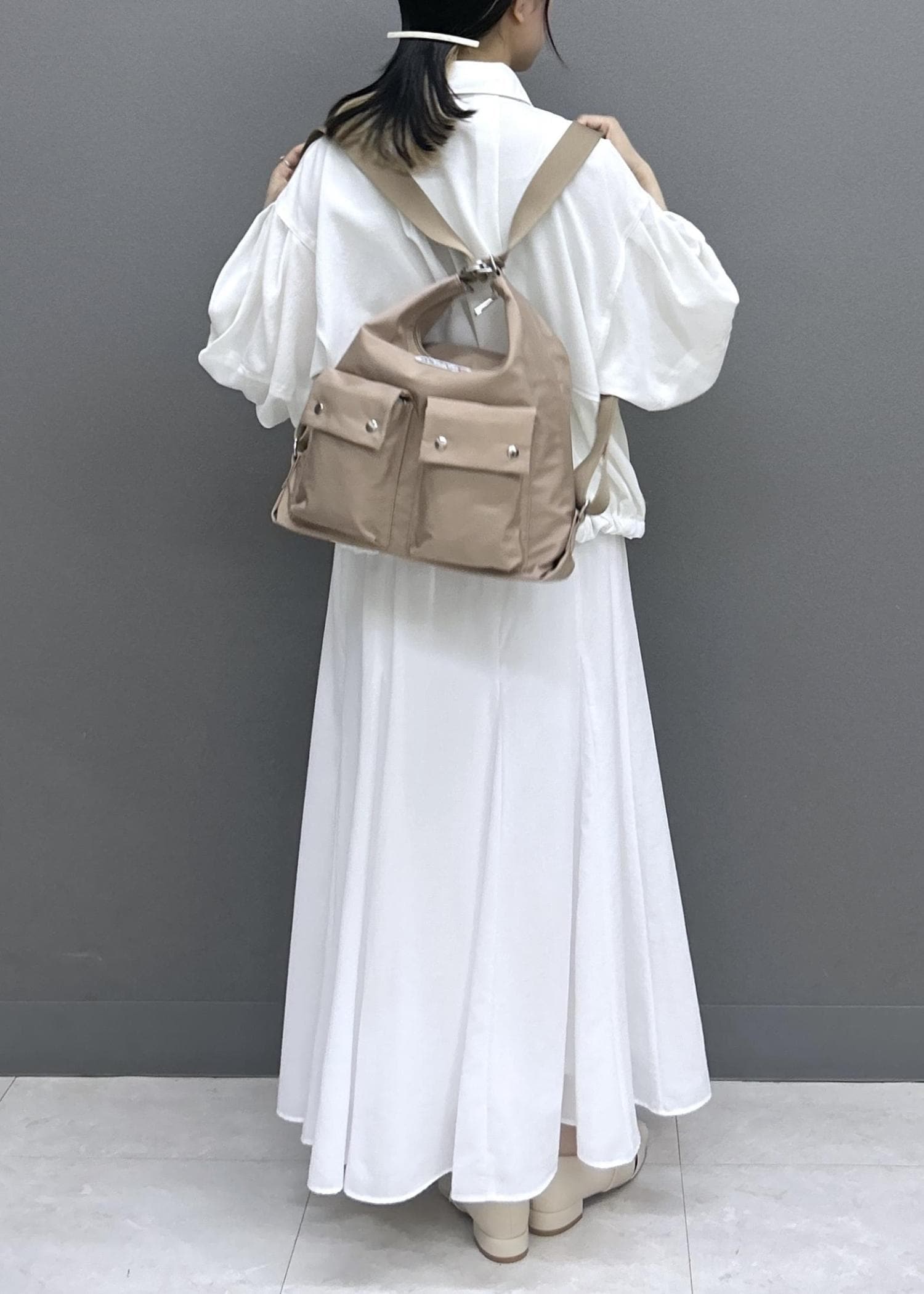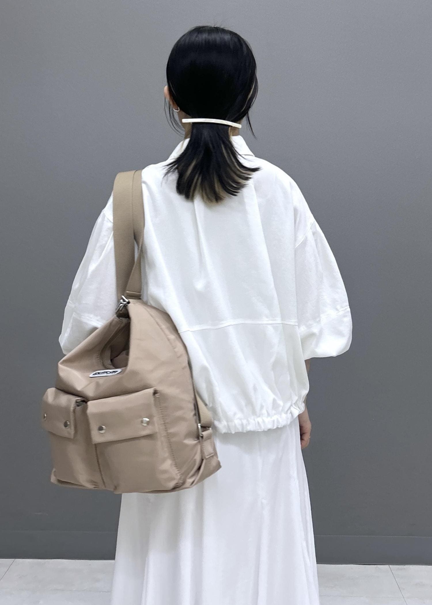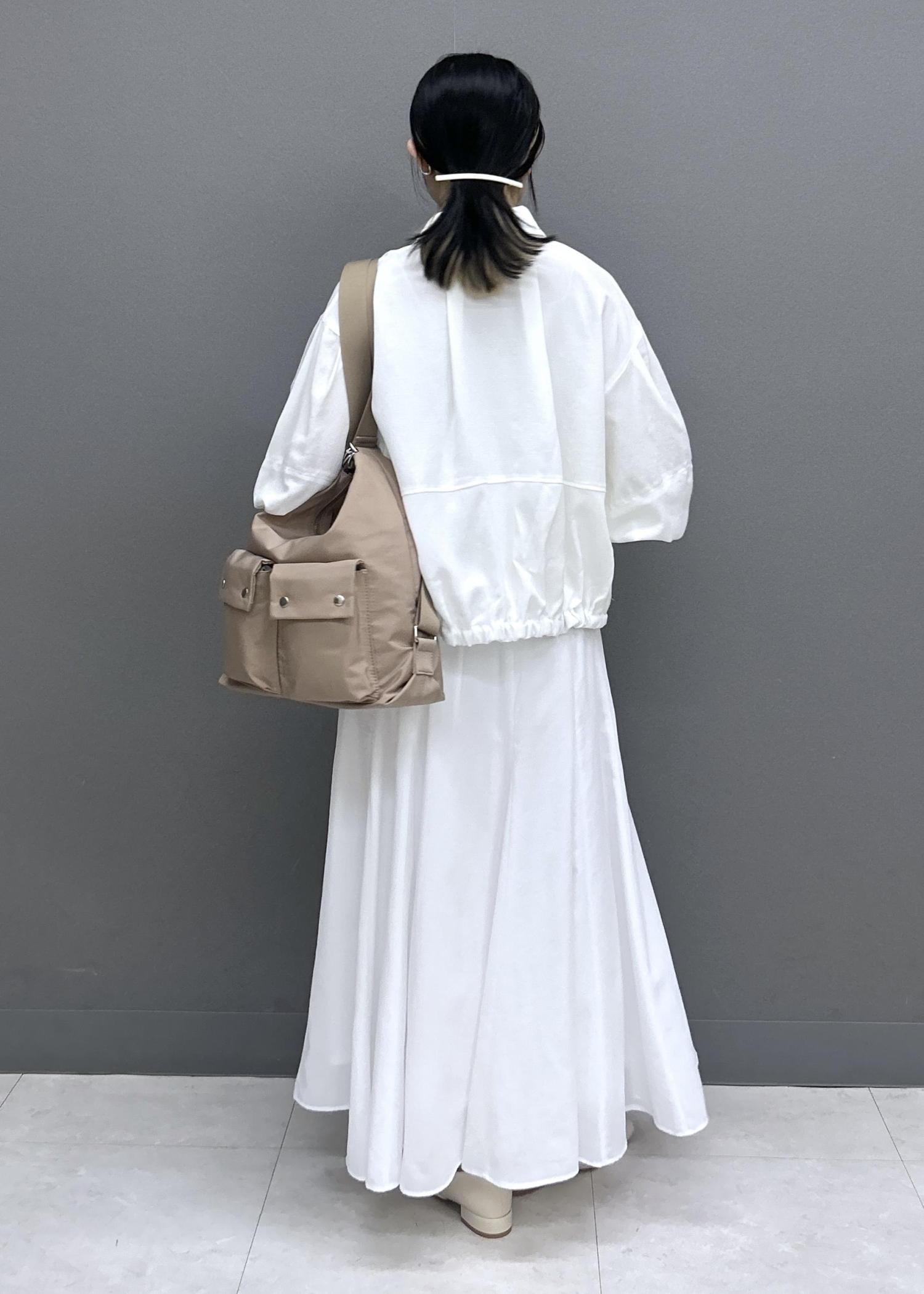ブルゾンやナイロン素材のバッグはカジュアルなイメージがありますが、スカートあわせでフェミニンなスタイルにもマッチします。
