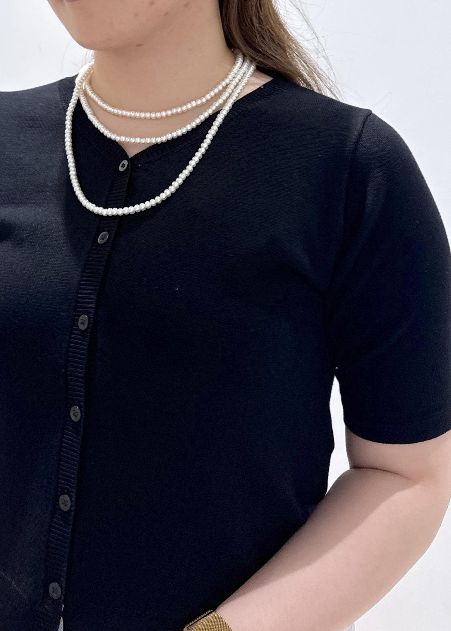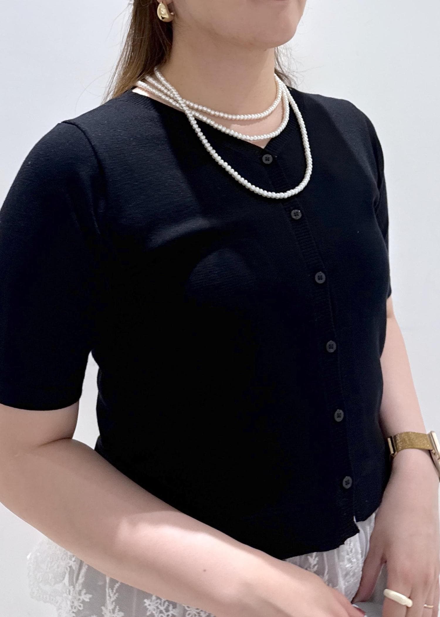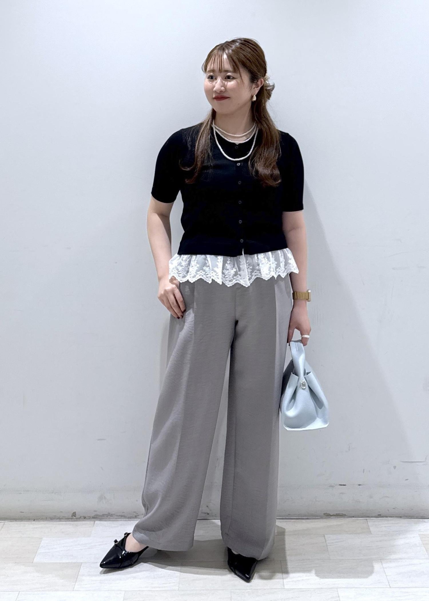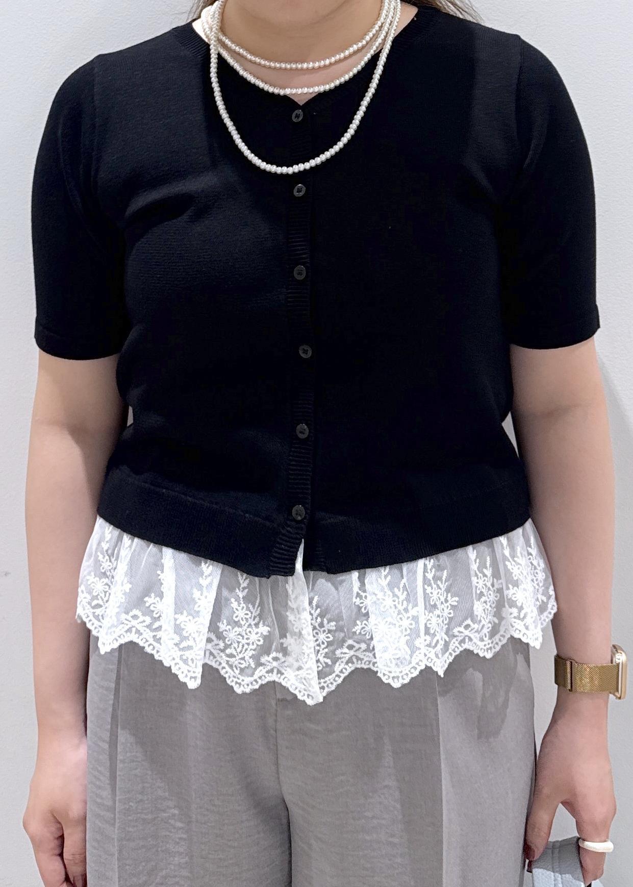 下にレースがドッキングされているVネックカーディガンです!一枚でまるで重ね着しているかのように見えるので、これから暑くなる季節オススメですよ♪