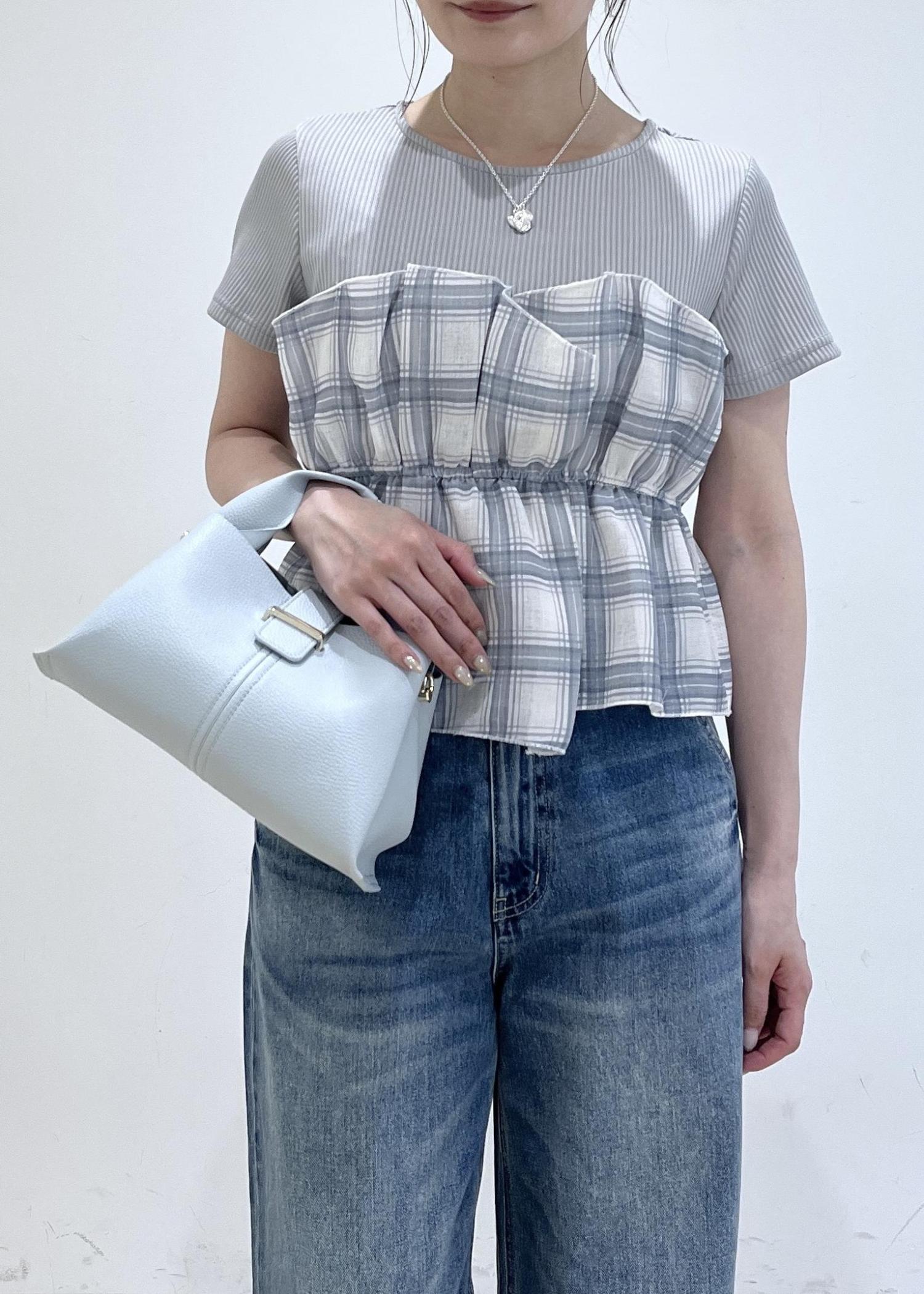 チェック&無地ビスチェドッキング半袖プルオーバー/イージーケア