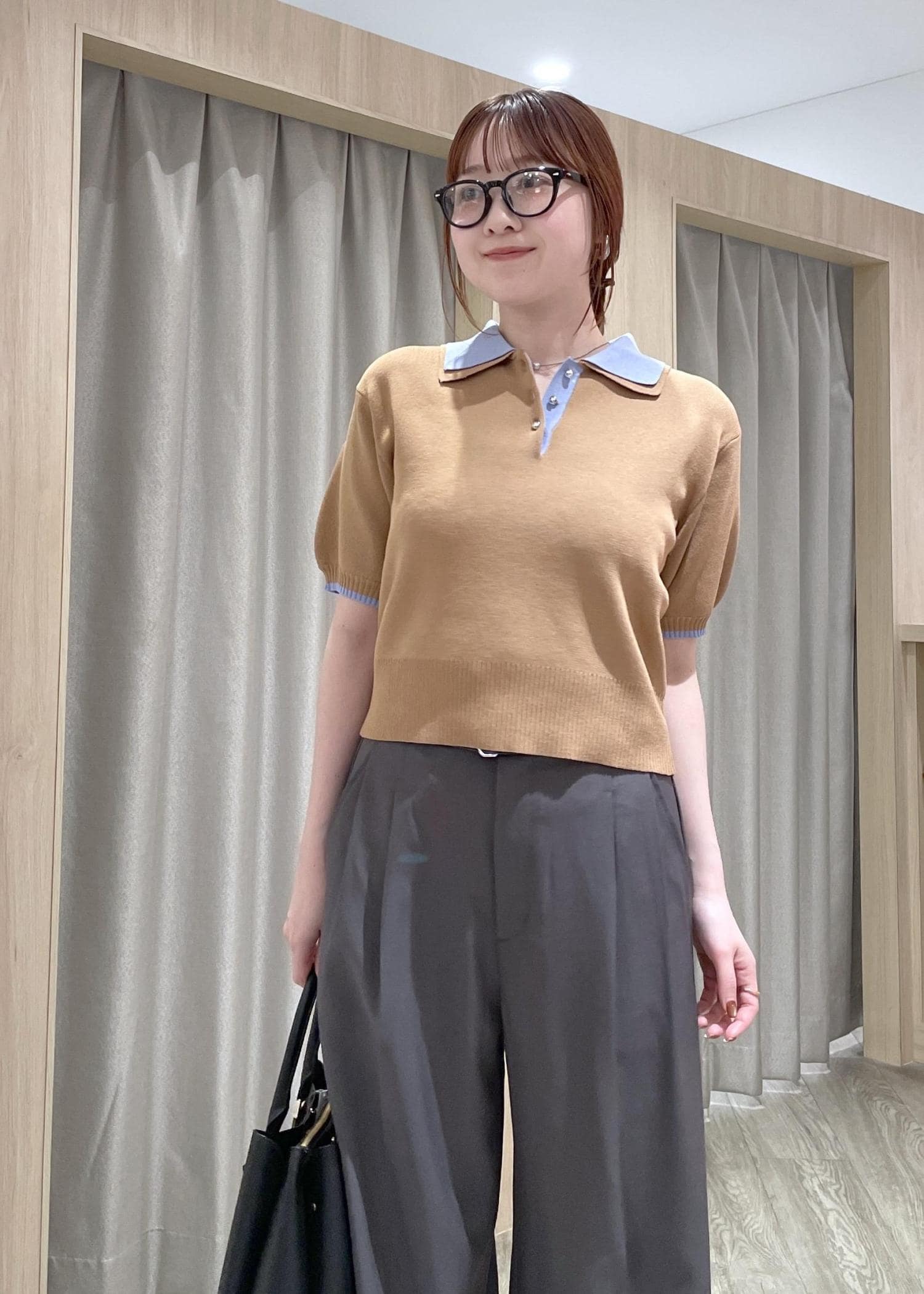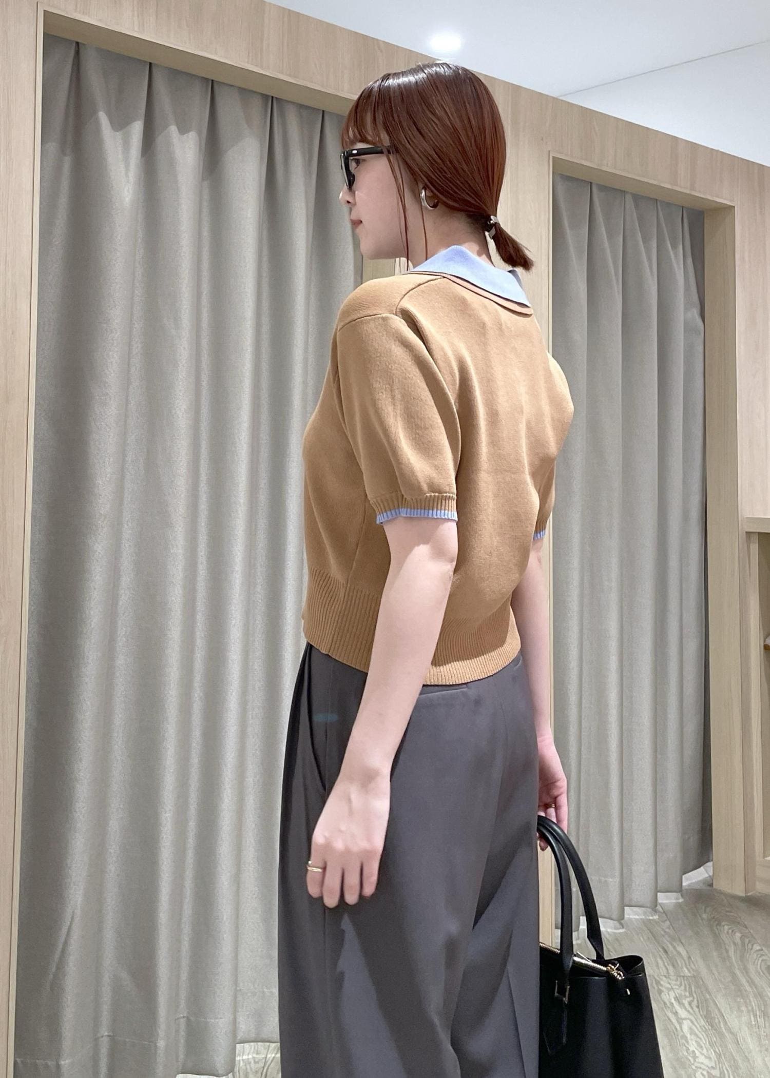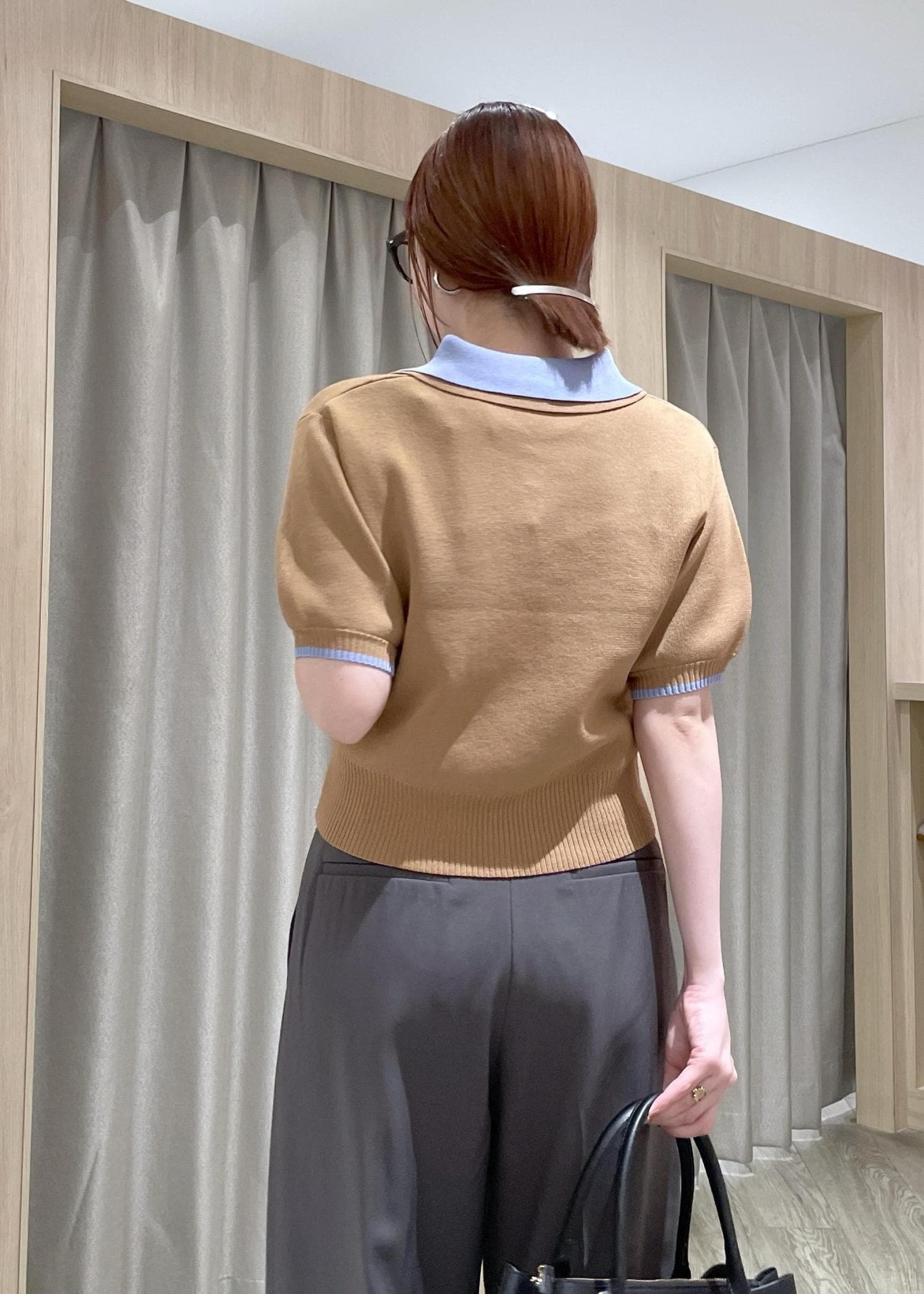 VISダブルカラー半袖ポロニットトップス/イージーケア・WEB限定カラーキャメル / F¥5,489レビュー身長159cmで腰にややかかる着丈、コンパクトですが短すぎない丈感でボトムも選ばず合わせやすいです◎骨ストでトップスは着膨れ感が気になりますが、釦を開けて着るとよりスッキリ見えが叶いました!パフ袖で気になる二の腕カバーもしてくれます。