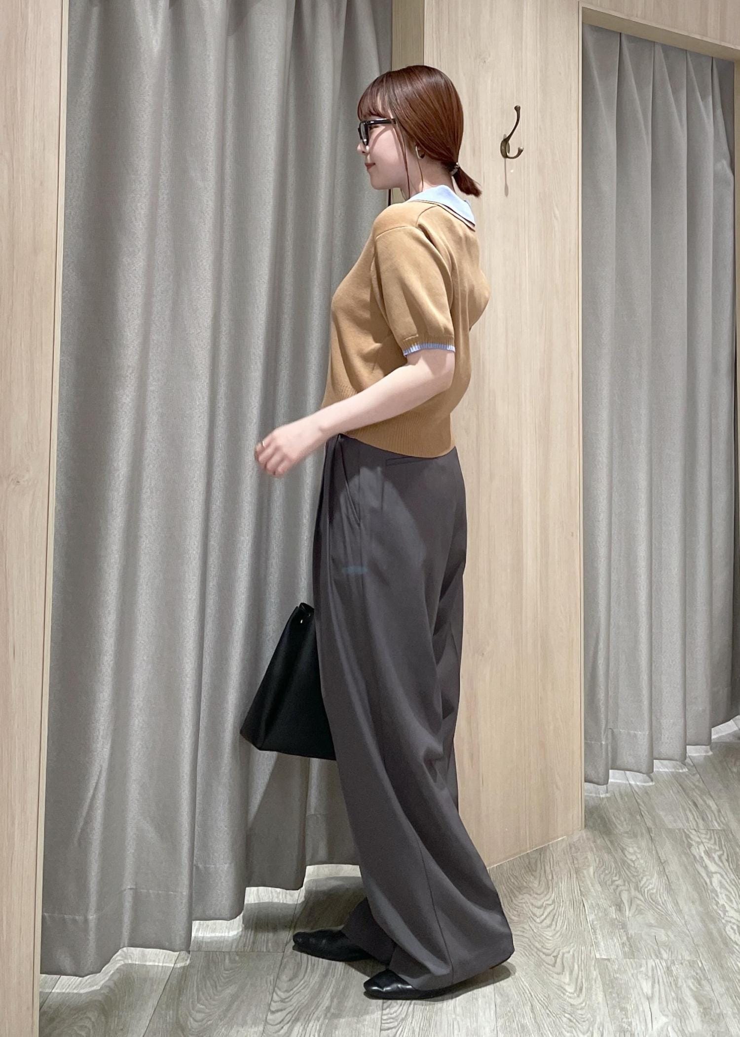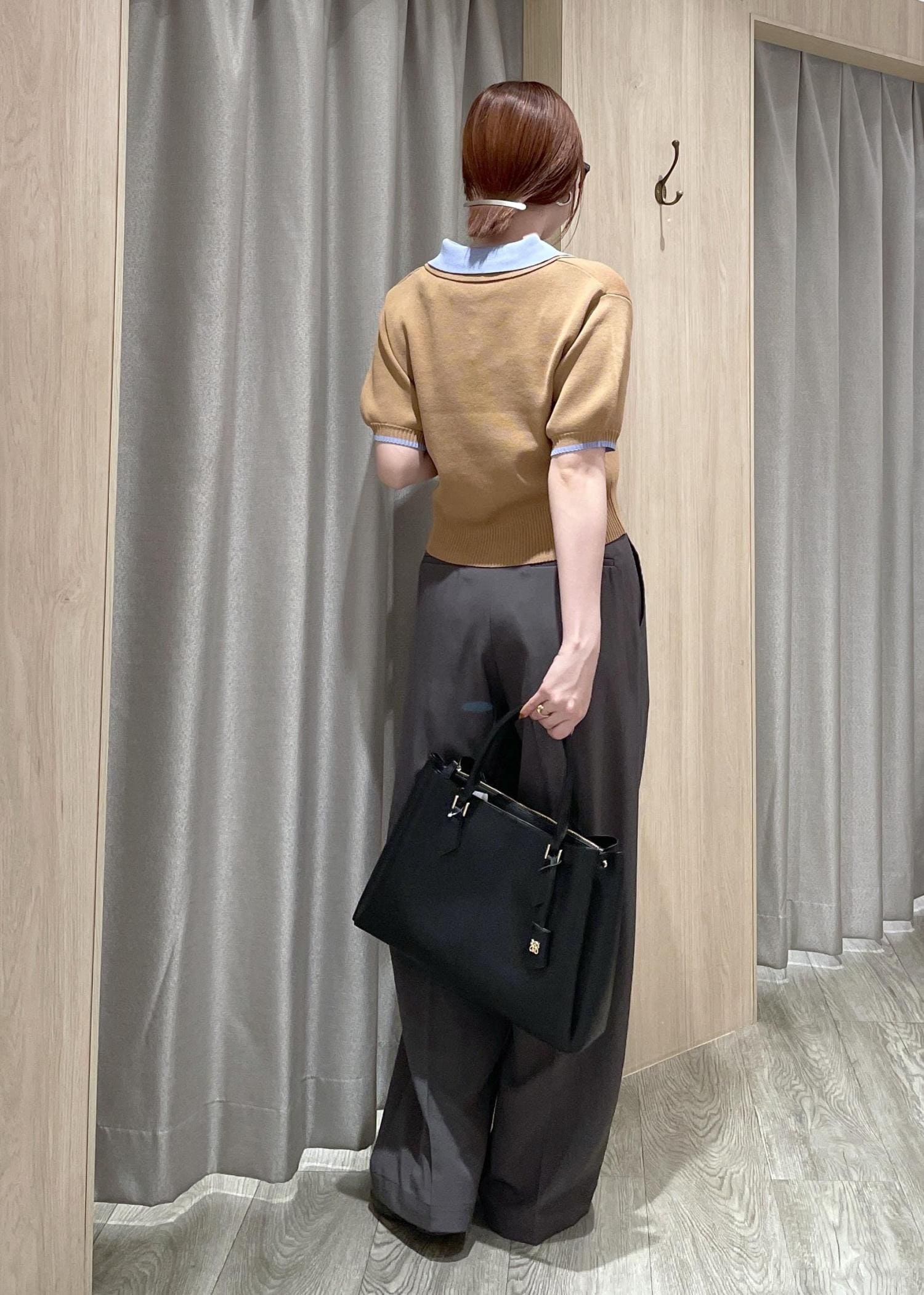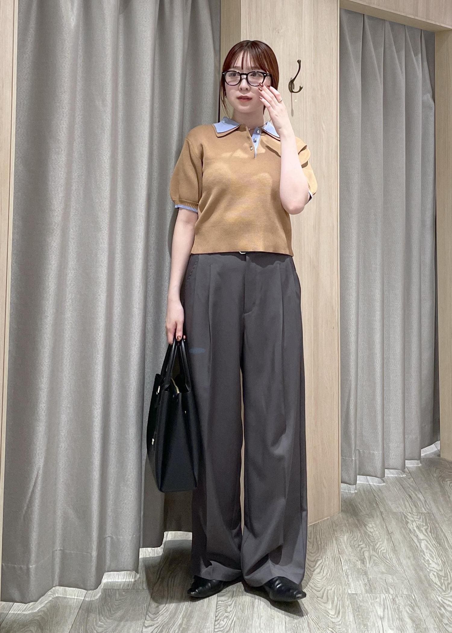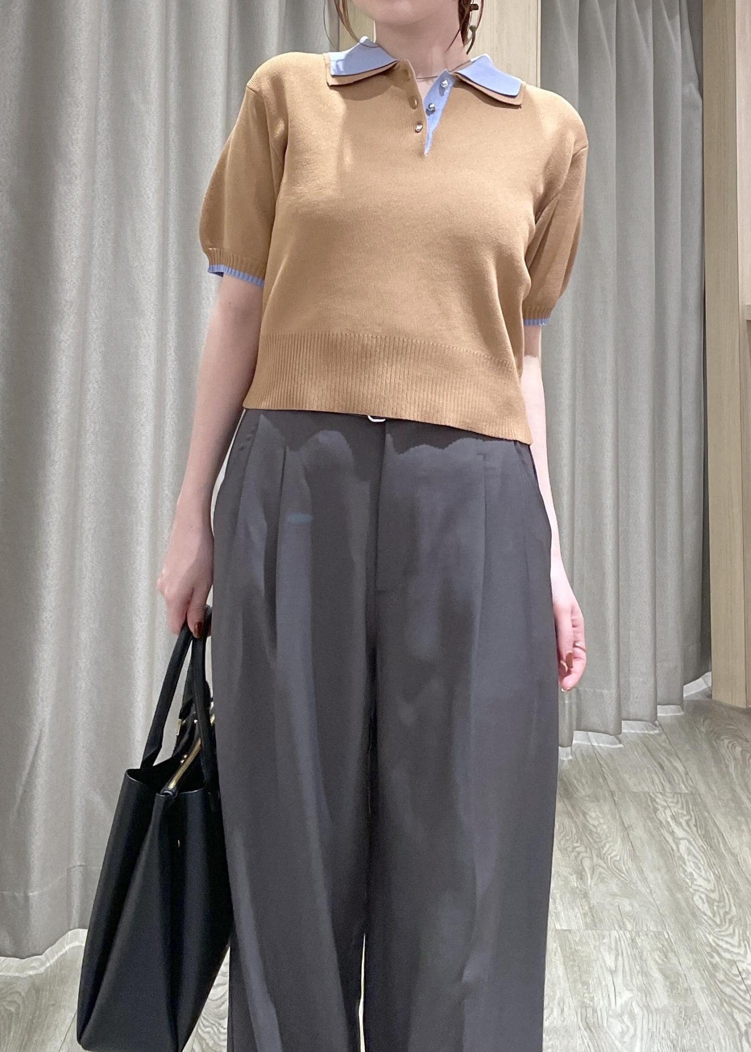VISダブルカラー半袖ポロニットトップス/イージーケア・WEB限定カラーキャメル / F¥5,489レビュー身長159cmで腰にややかかる着丈、コンパクトですが短すぎない丈感でボトムも選ばず合わせやすいです◎骨ストでトップスは着膨れ感が気になりますが、釦を開けて着るとよりスッキリ見えが叶いました!パフ袖で気になる二の腕カバーもしてくれます。