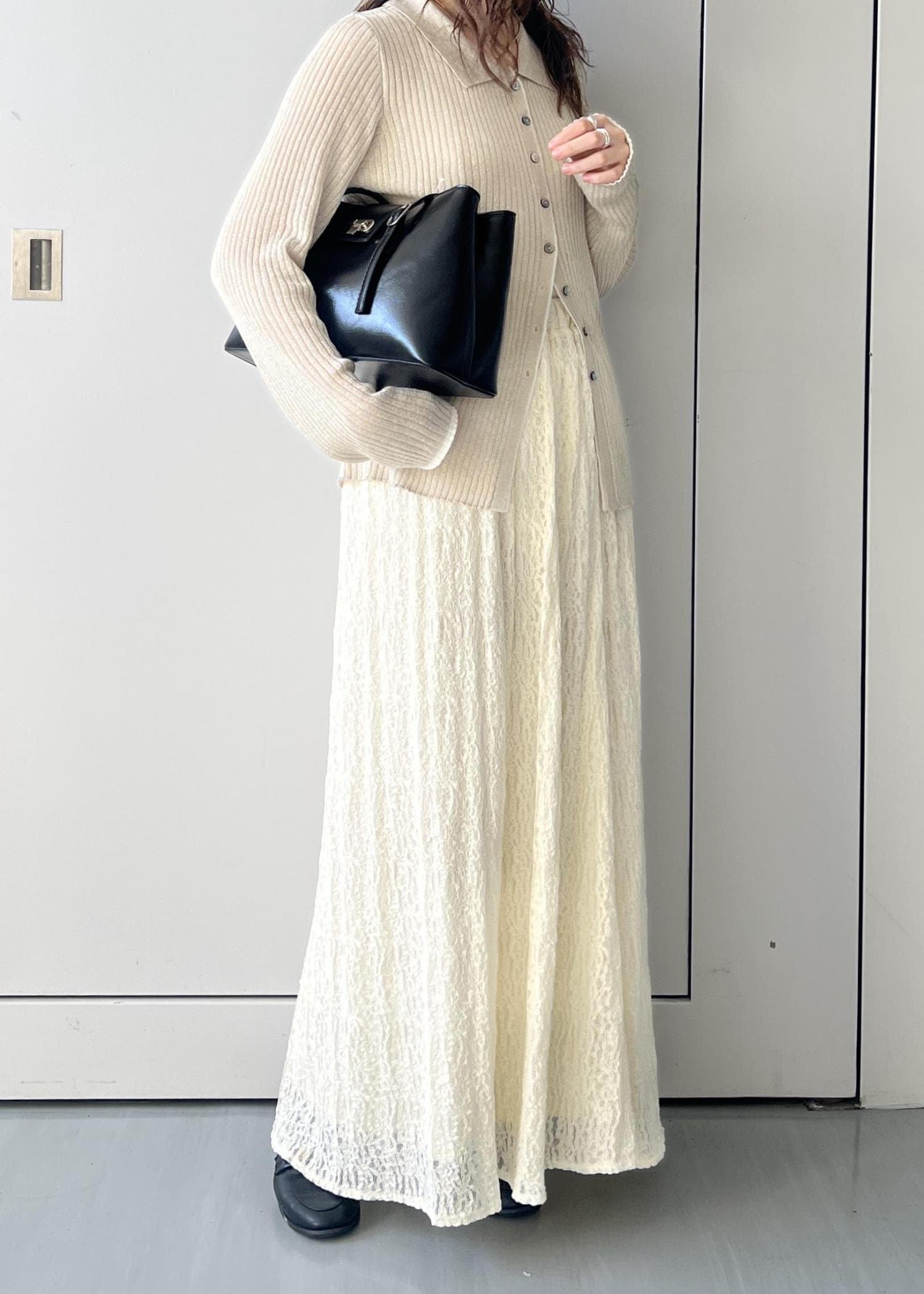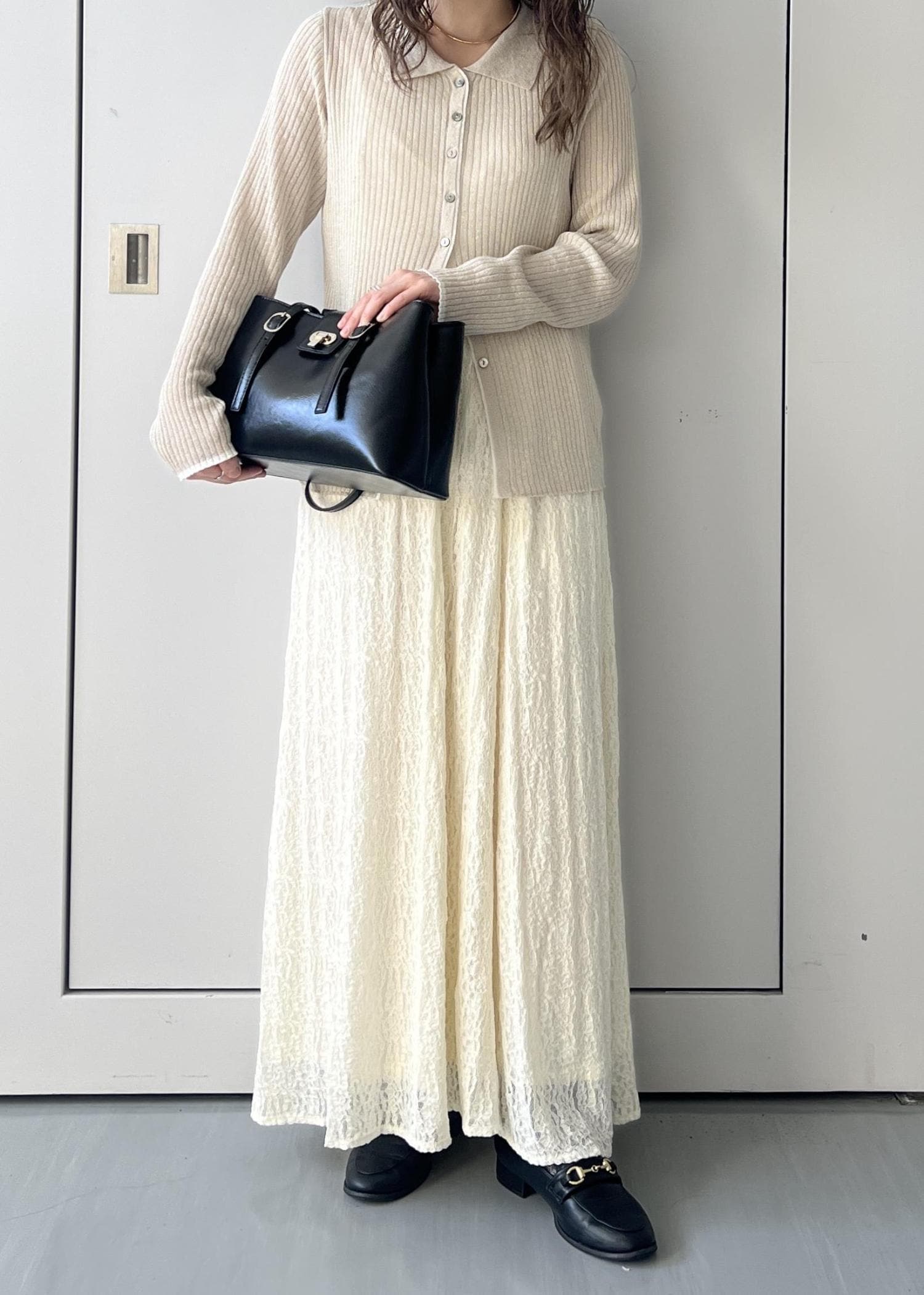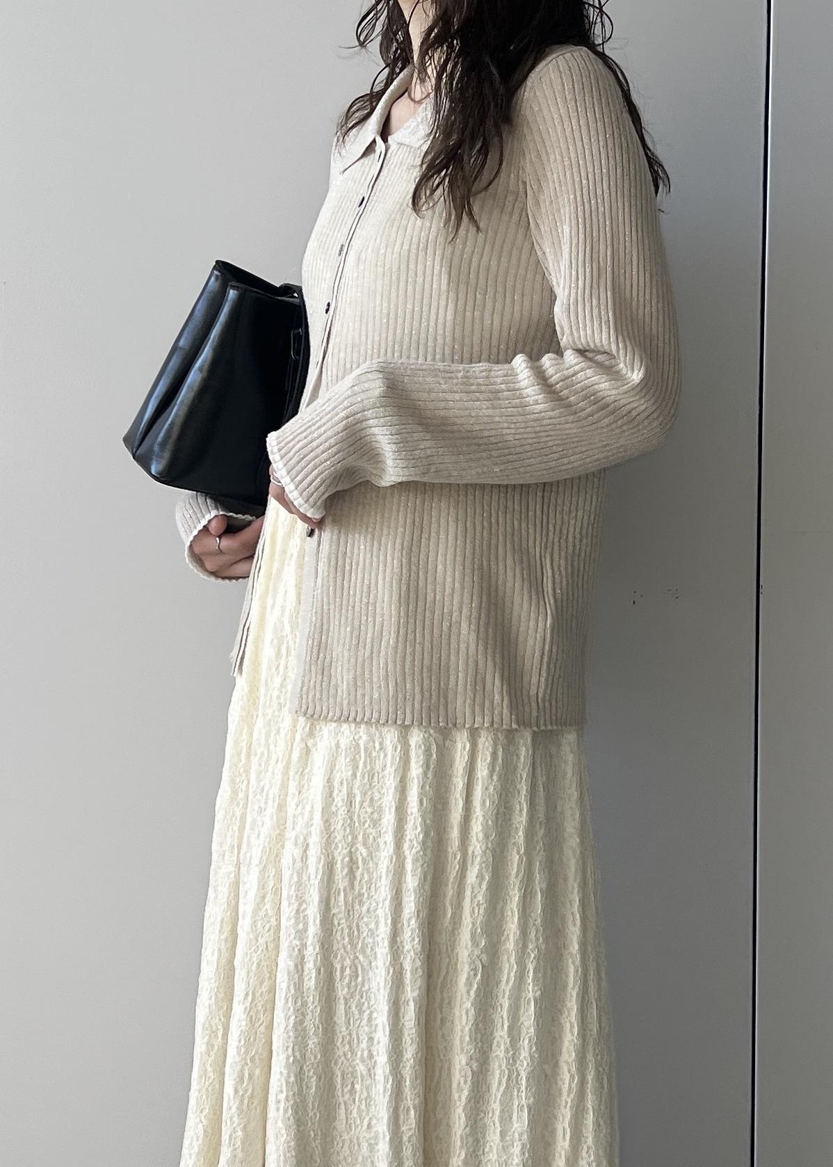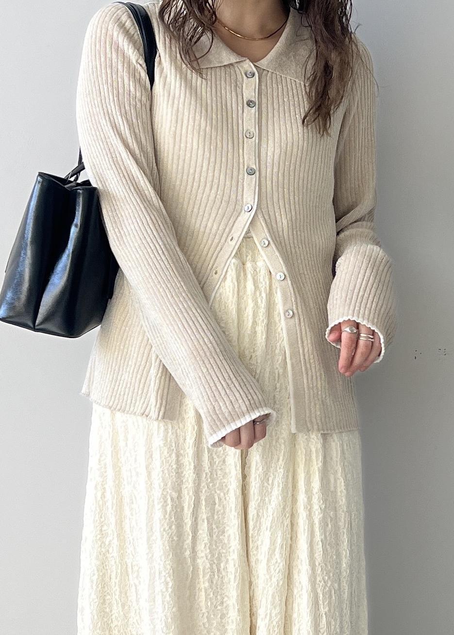 VISポロ襟配色シアーリブカーディガン/イージーケアベージュ / F¥6,589レビュー152cmでお尻周りが隠れる着丈。伸縮性があり細見えして着れます✨ ラメ糸が入っているニット素材はチクチク感なく涼しげに着用できます。