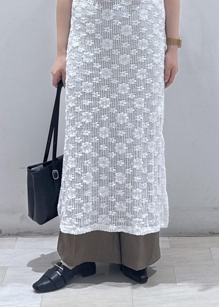 身長157cm/Mサイズ着用していますが、裾がくるぶしぐらいのやや長めの着丈。程よいワイドパンツのシルエットが脚を長く綺麗に見せてくれます。メッシュ素材なので軽くて涼しく、またシワ感も気にならないので履きやすいです。セットアップで購入しましたが、どのテイストにも使いやすいのでオススメですよ♪