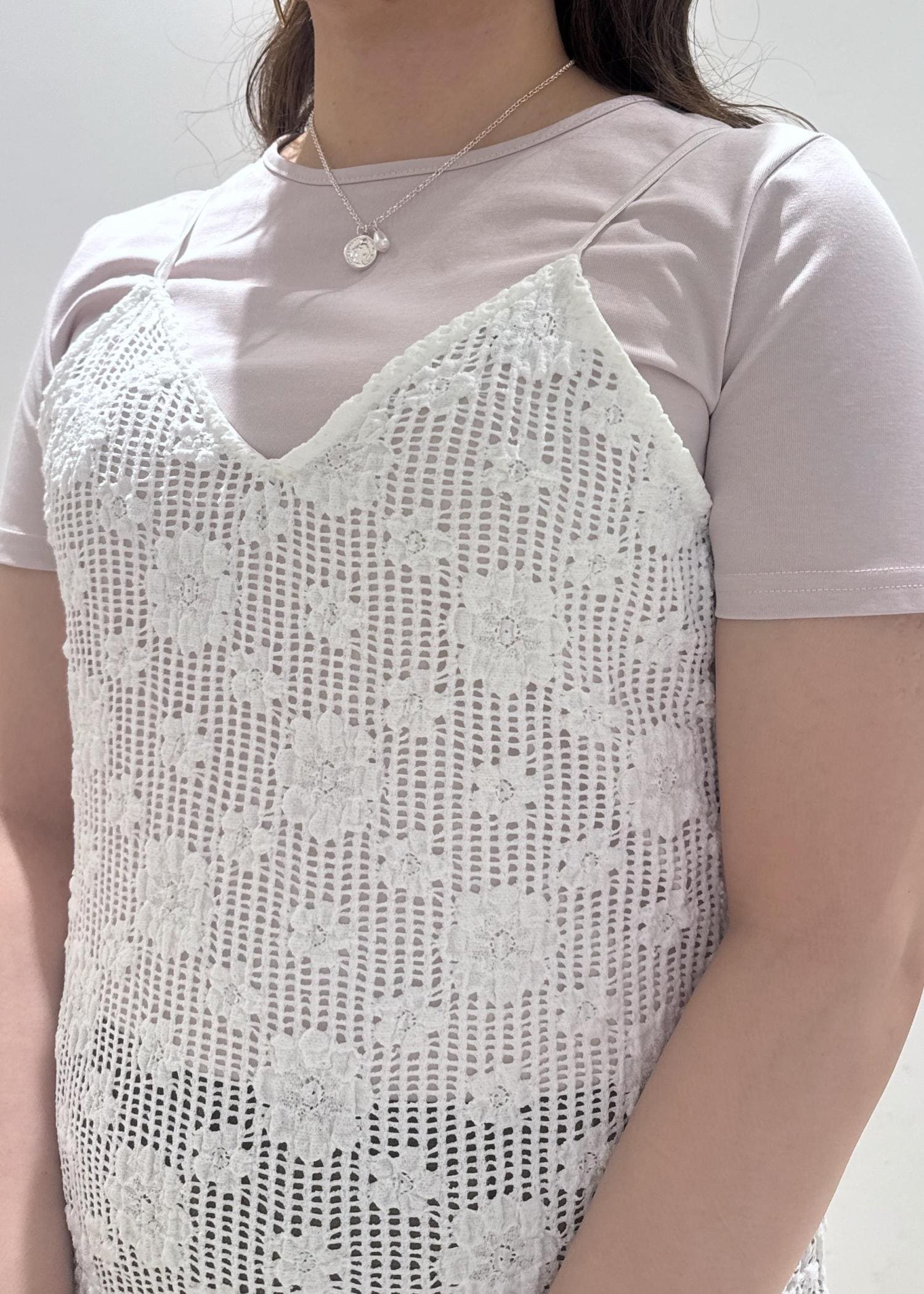 レイヤードに使えるレースキャミソールワンピース⭐︎ロングではありますが身長157cmで脛あたりぐらいの着丈。スリットが入っているので動きやすくなっています。身長が低い方は肩紐のアジャスターで長さが調節出来るのでぜひしてみてください⭐︎綿素材の涼しいワンピースなのでぜひTシャツやカップ付きのワンピースなどにカジュアルなスタイリングでオススメです。