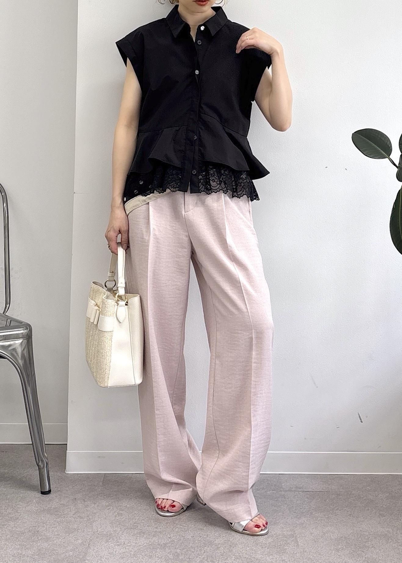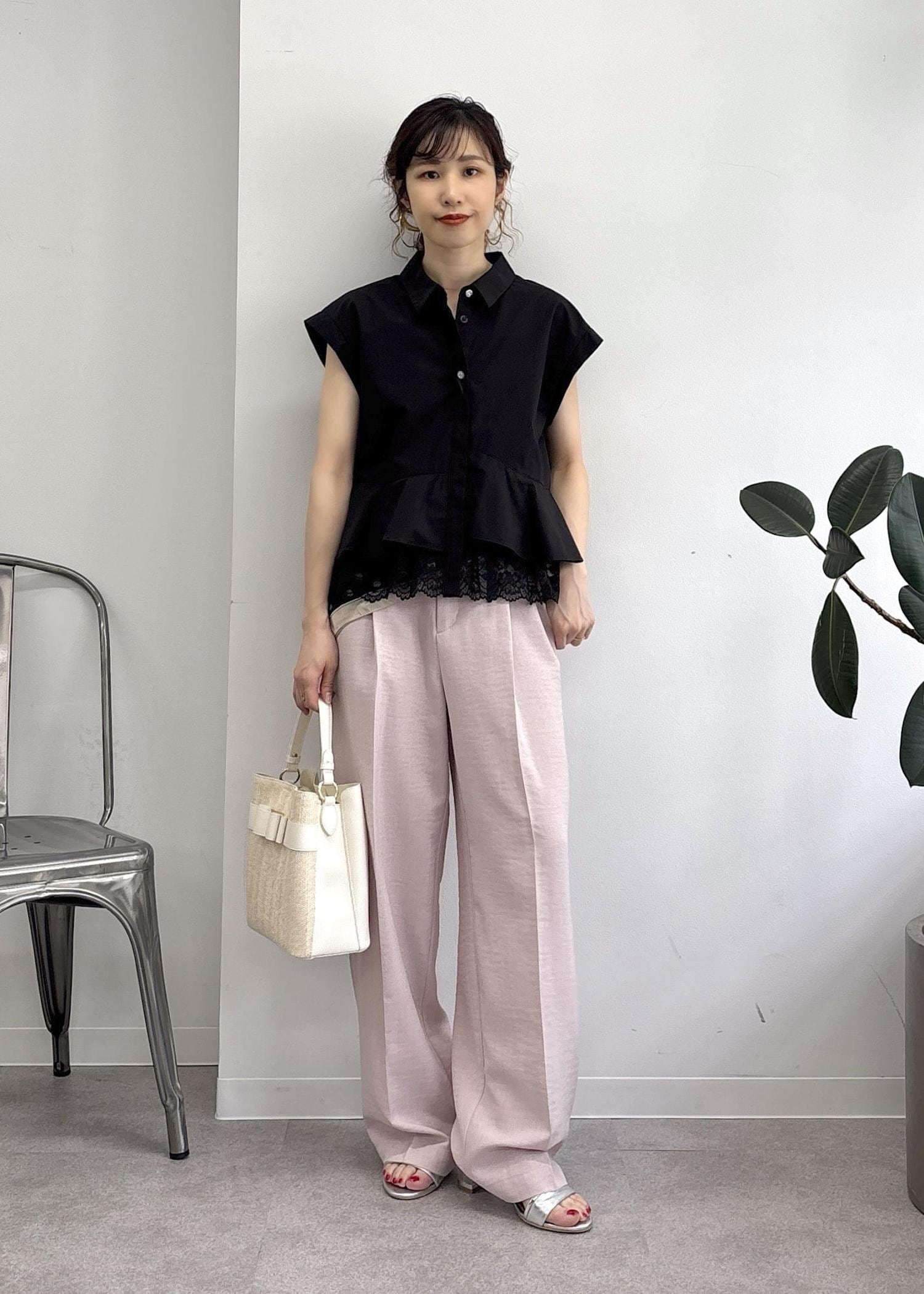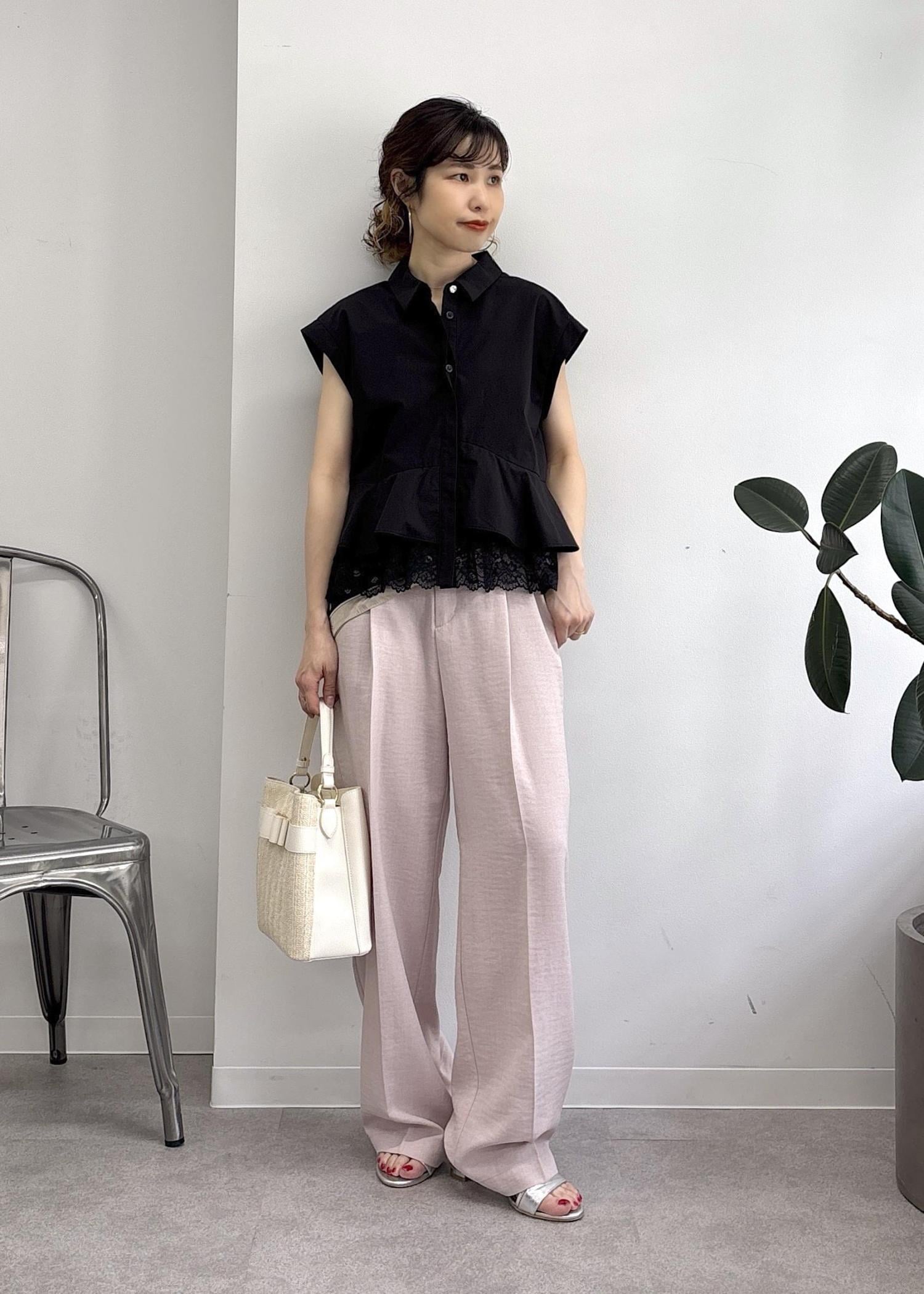 アシンメトリーな切り替えが大人可愛いシャツと大人気美easyシリーズのピンクと合わせた大人カジュアルスタイル♪シャツは裾にフリルが施されている為、ブラックカラーも大人っぽく、でもピンクのパンツで女性らしく。そんなサマーダークカラー合わせが夏にオススメです。