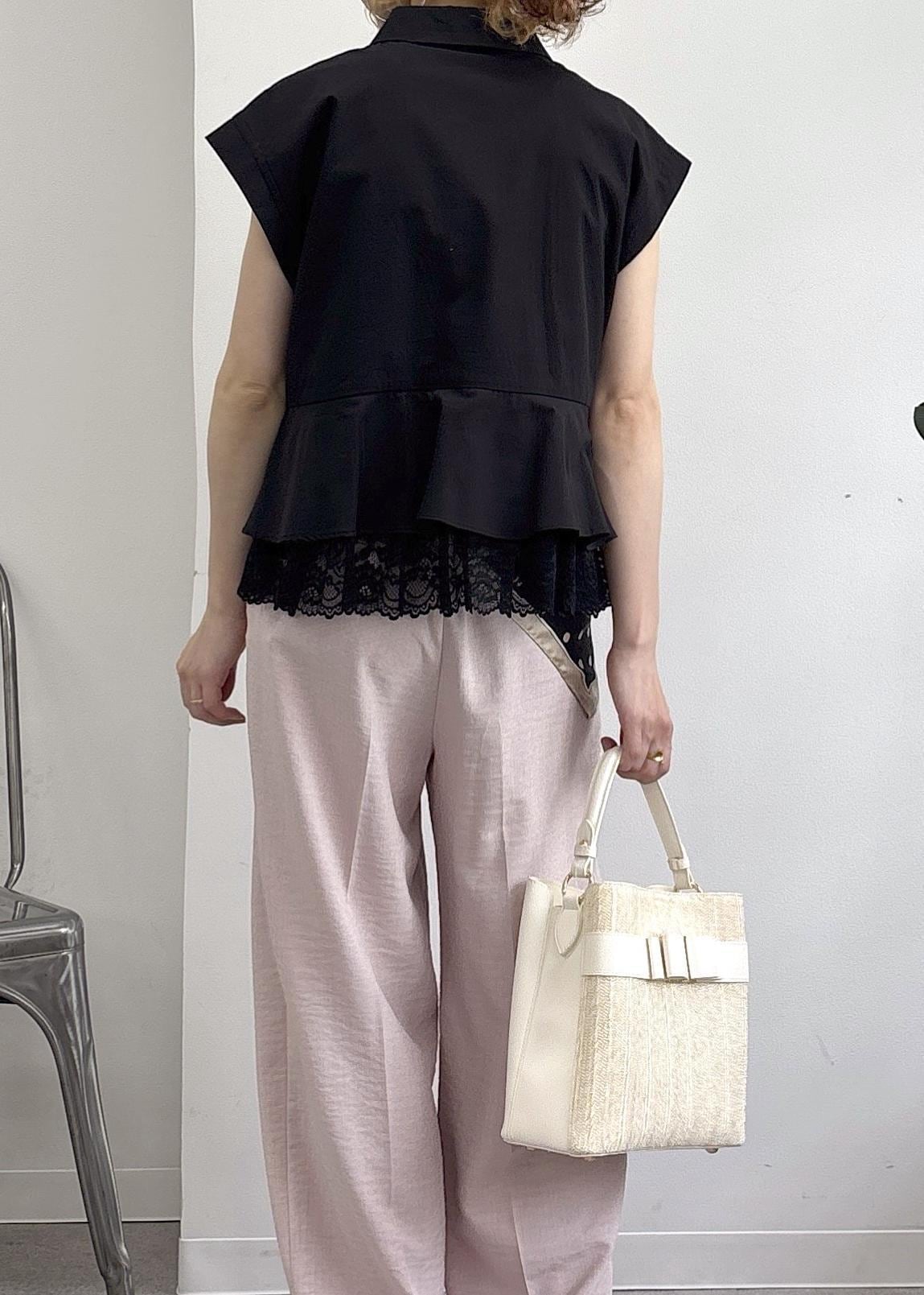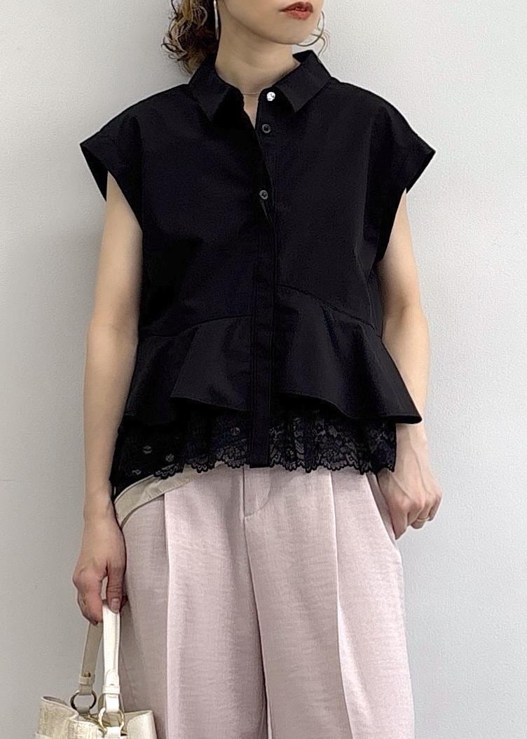 予約VIS裾レース切替 襟付きフレンチスリーブブラウス/接触冷感・イージーケアブラック / F¥5,929レビューレースヘムが今年らしい大人可愛いシャツ♪ドッキング仕様、レースがアクセントでトレンド感◎さらっとした着心地で締め付け感を感じない、けれど切り替えでスタイルup見えするデザインが夏着映えします。全体的に程よくゆとりがあり、着丈は腰くらいの長さでした。
