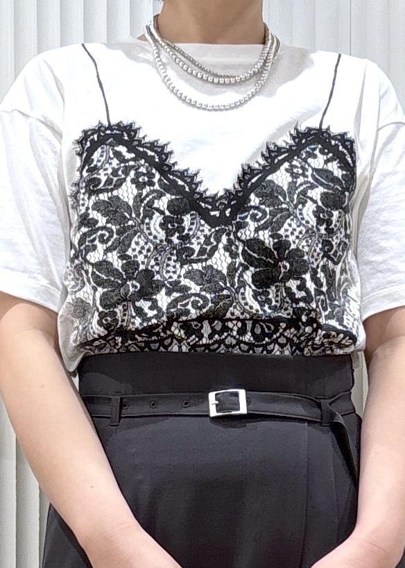 レースビスチェのプリントがされていて少しエッヂの効いたデザインでおしゃれ見えが叶います! -