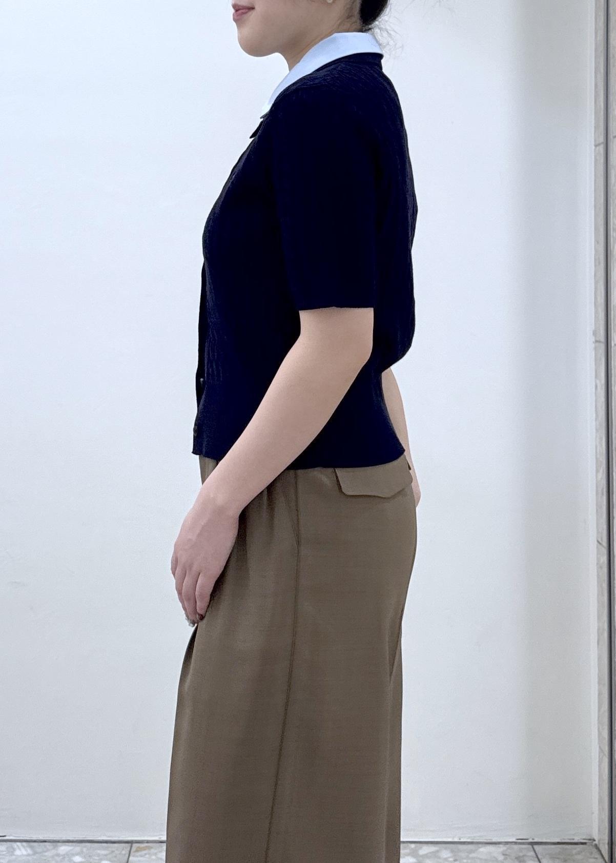 着丈は腰あたりの着丈で、パンツ、スカートどちらとも合わせやすいです!