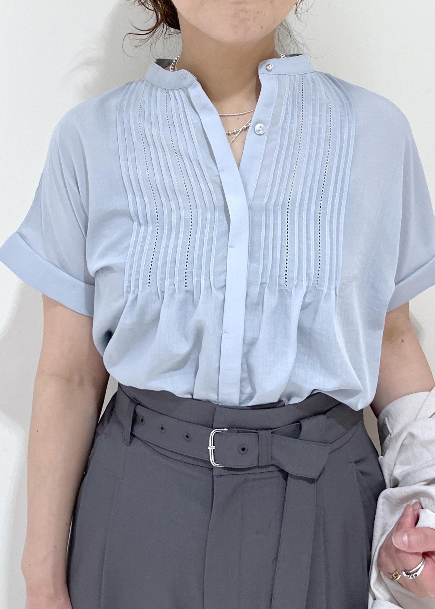 VIS気流染めピコピンタック半袖ブラウス/接触冷感サックス / F¥5,489レビューサラッとしたブラウスでシワになりにくいところか嬉しいポイント!