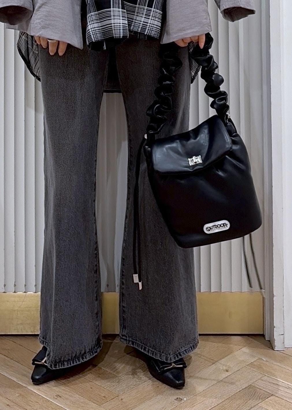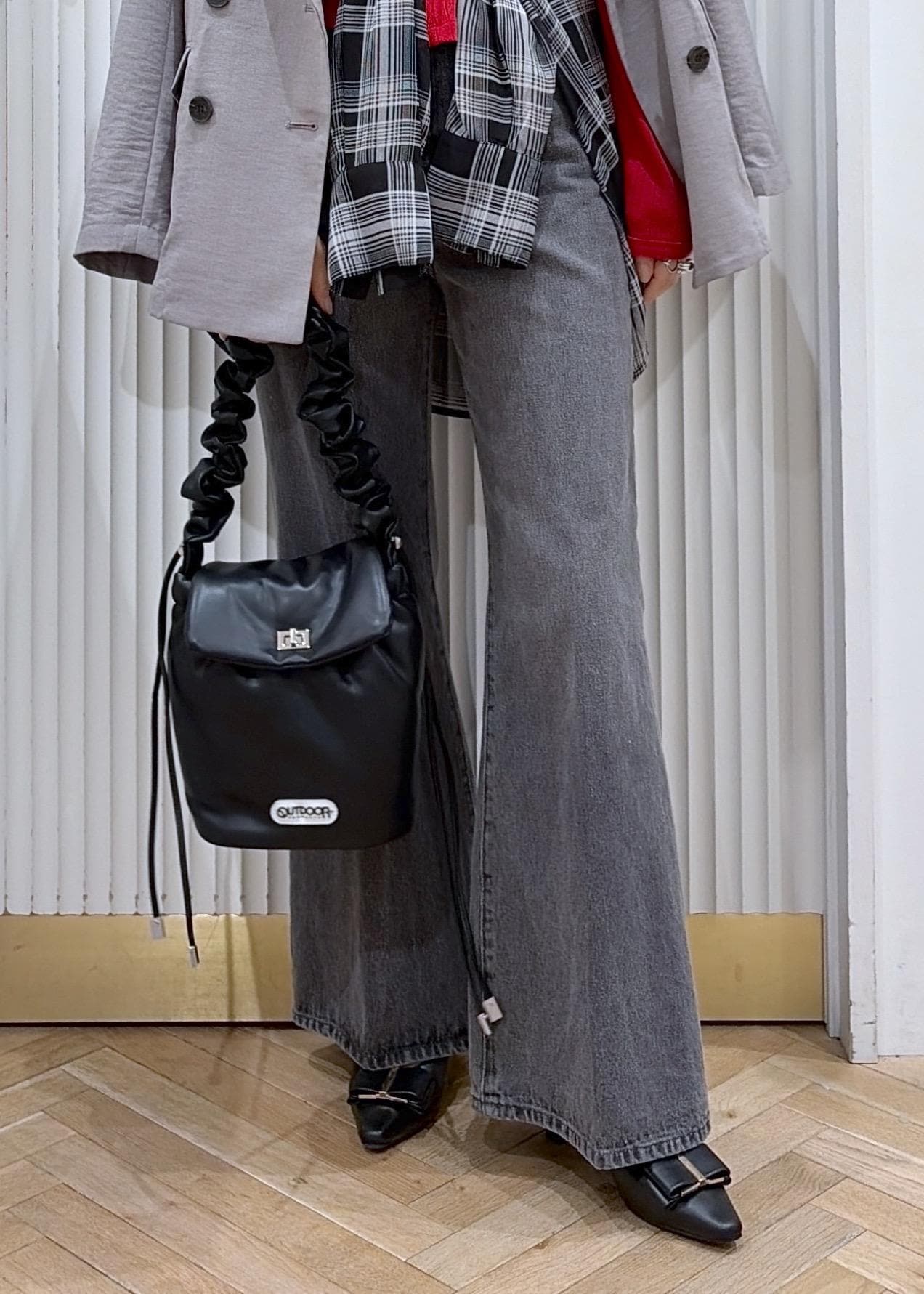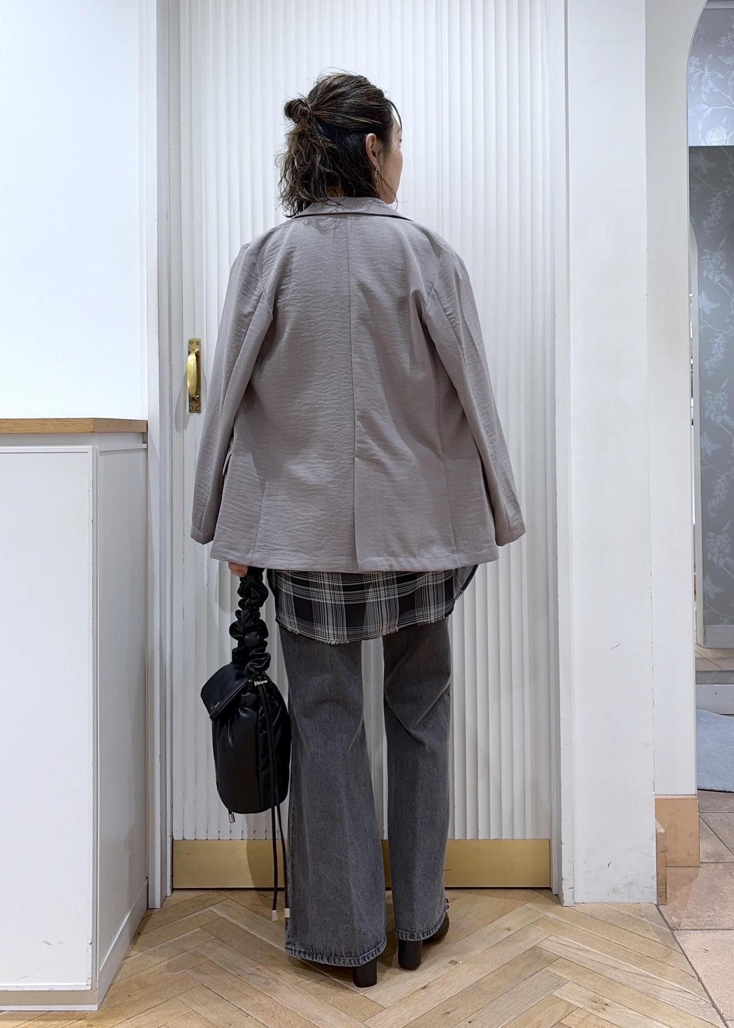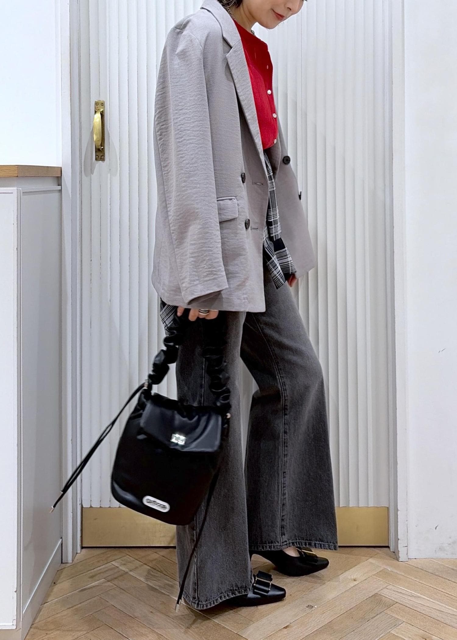 軽く肩掛けしたジャケットが抜け感をつくりつつ、ウォッシュのきいたブラックのフレアーデニムで程よくラフに。小物もブラックでまとめて、全体をすっきり整えた大人カジュアル。