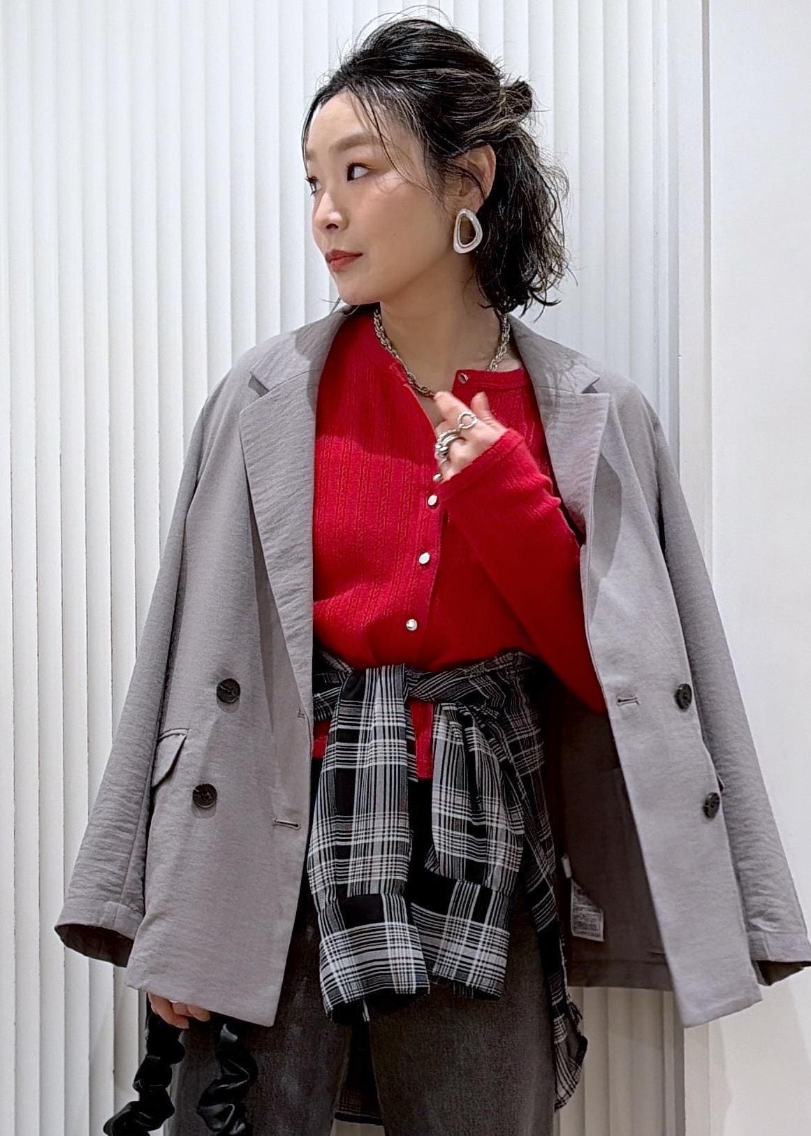 鮮やかな赤を主役に、グレーで引き締めたバランスのいいスタイリング。