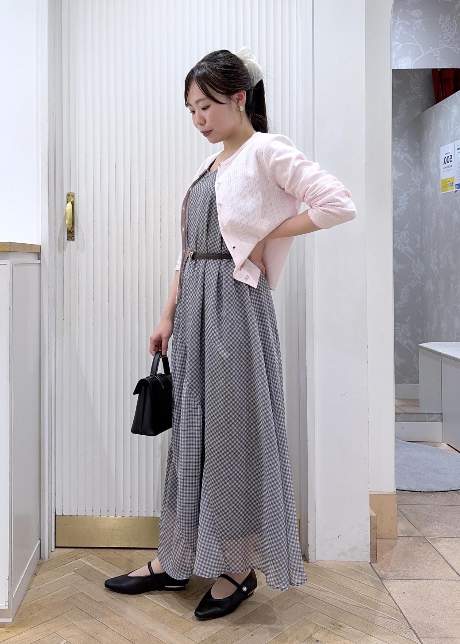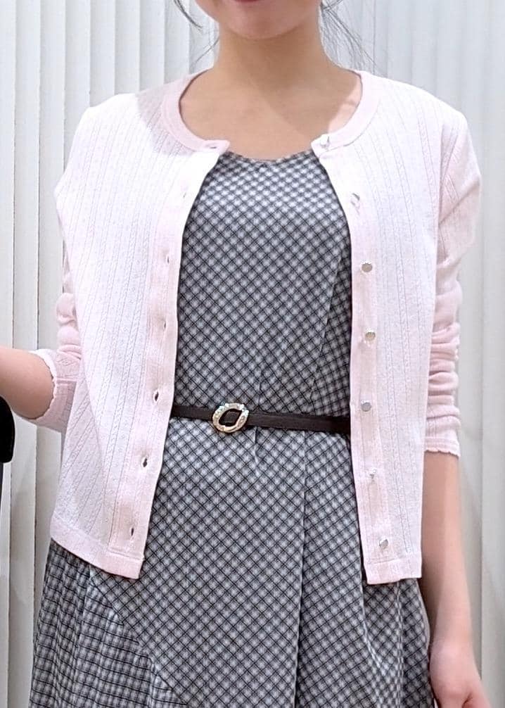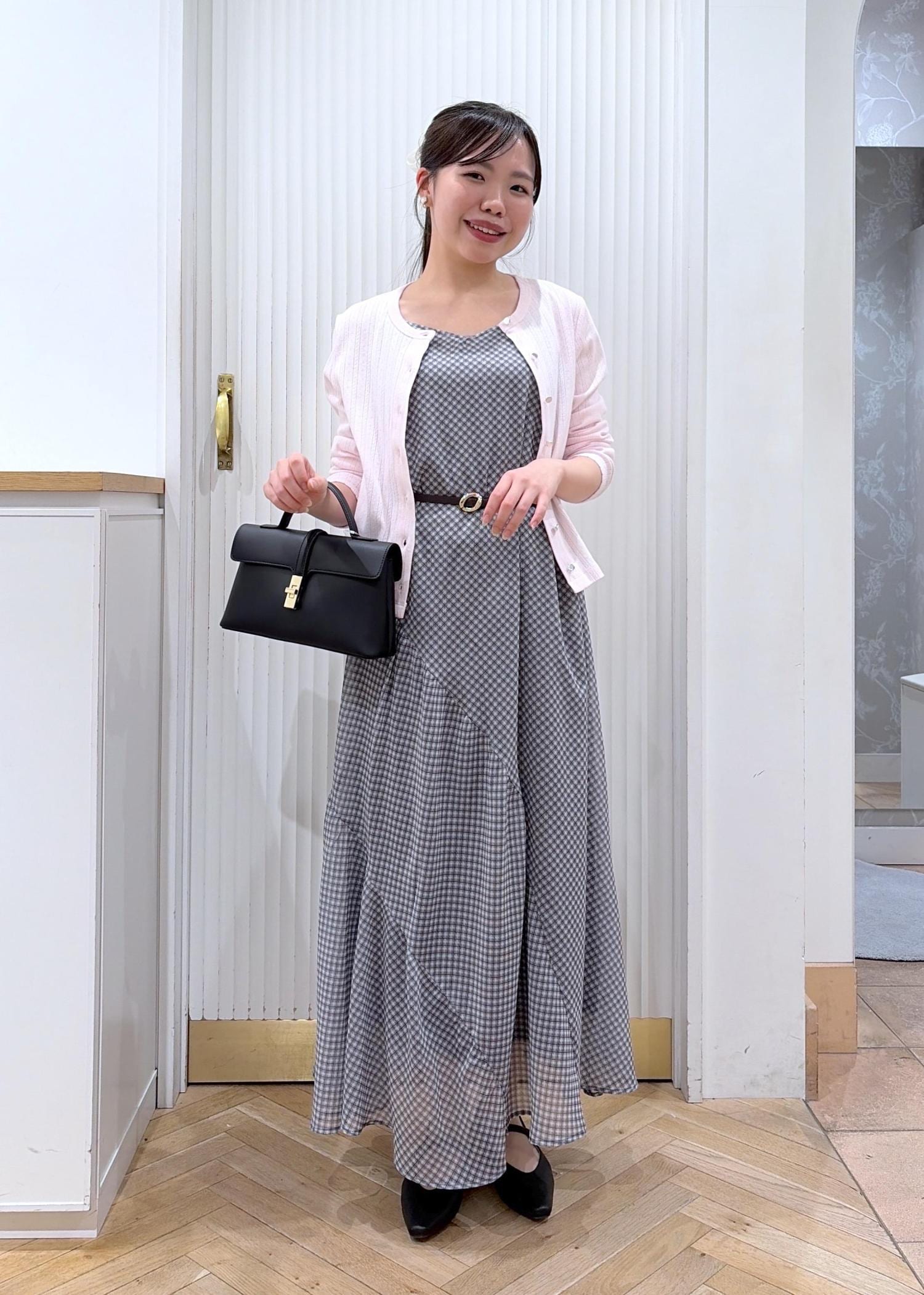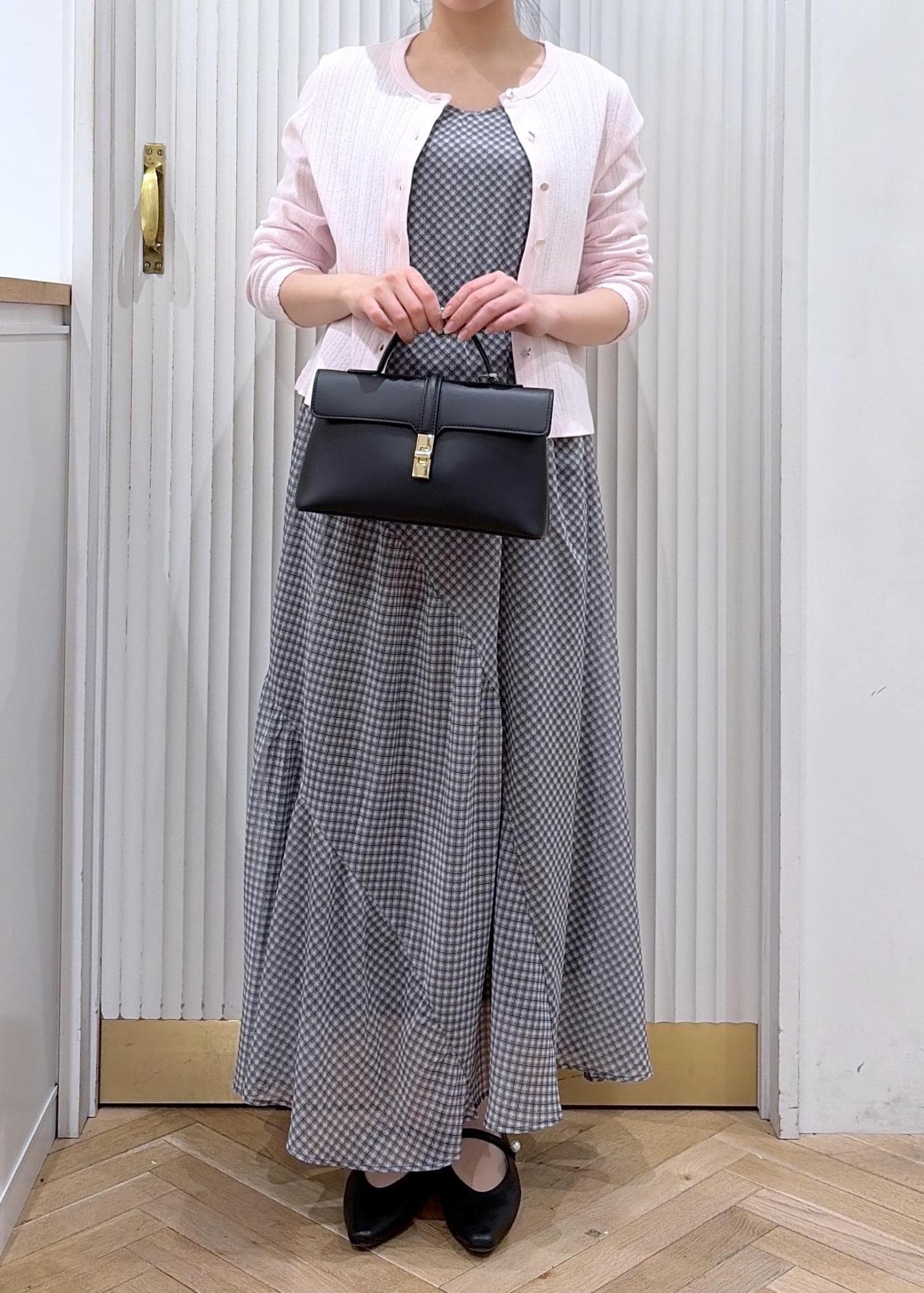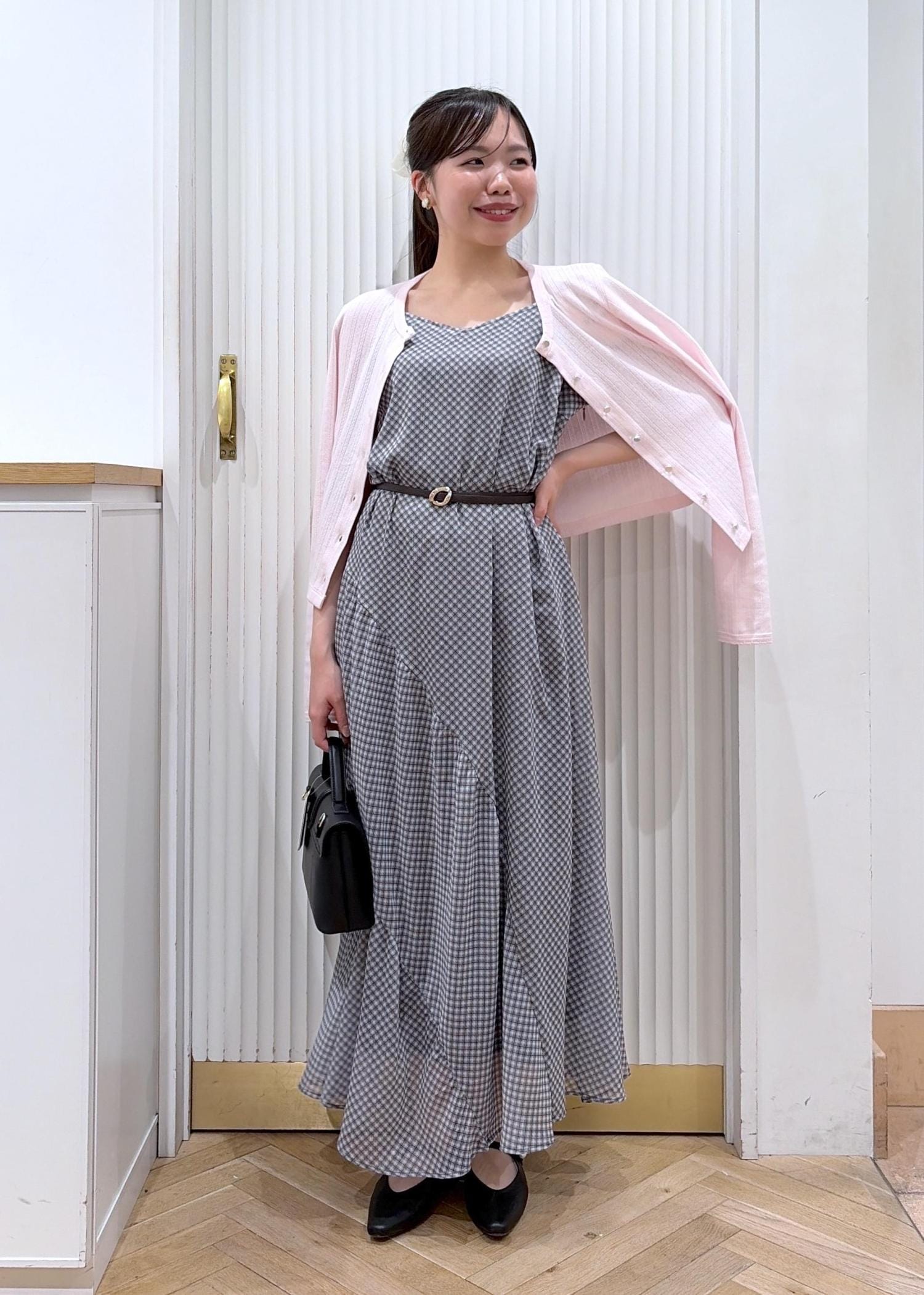 落ち着いたグレーのチェックワンピに、淡いピンクのカーディガンを合わせた大人ガーリーコーデ。