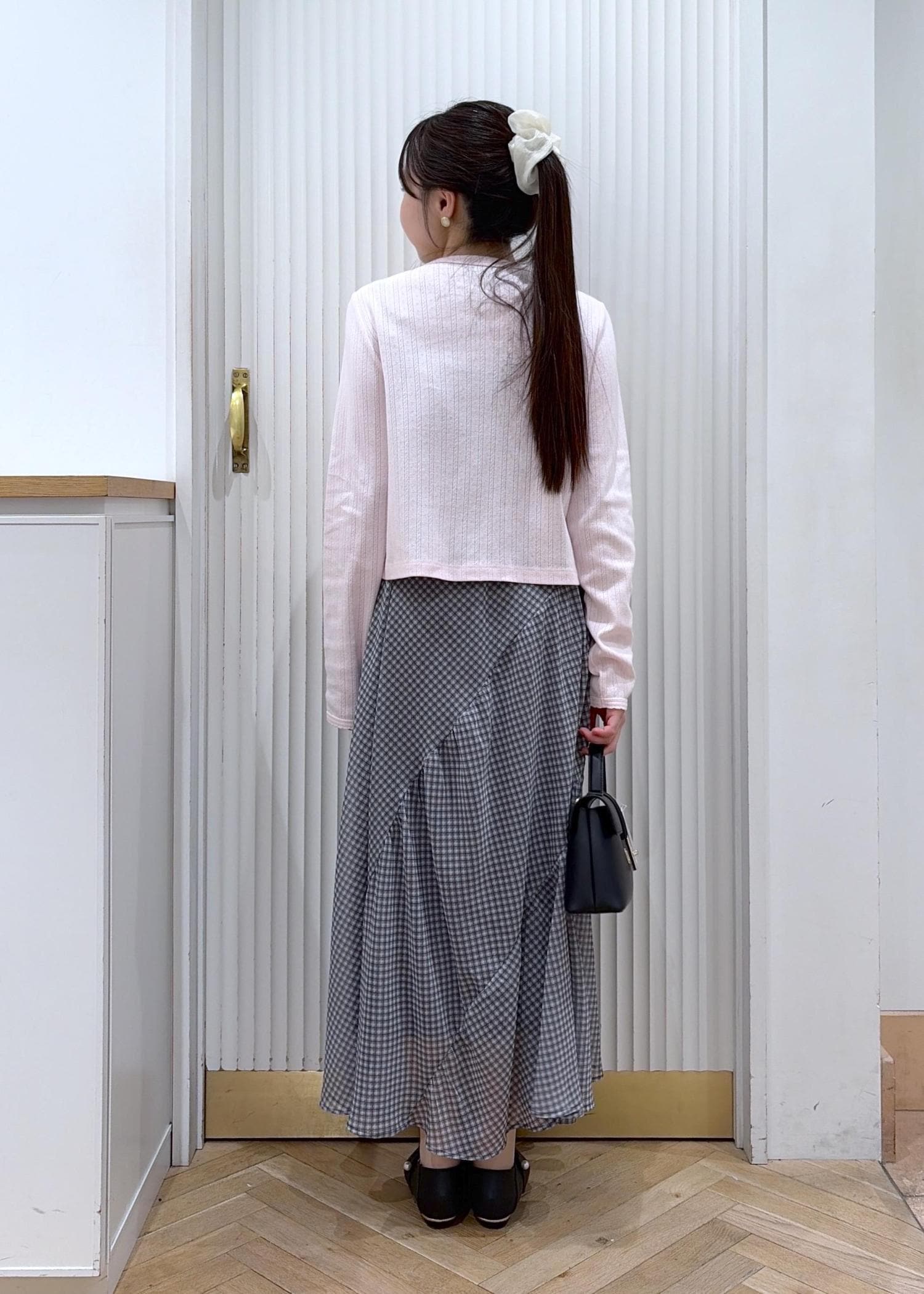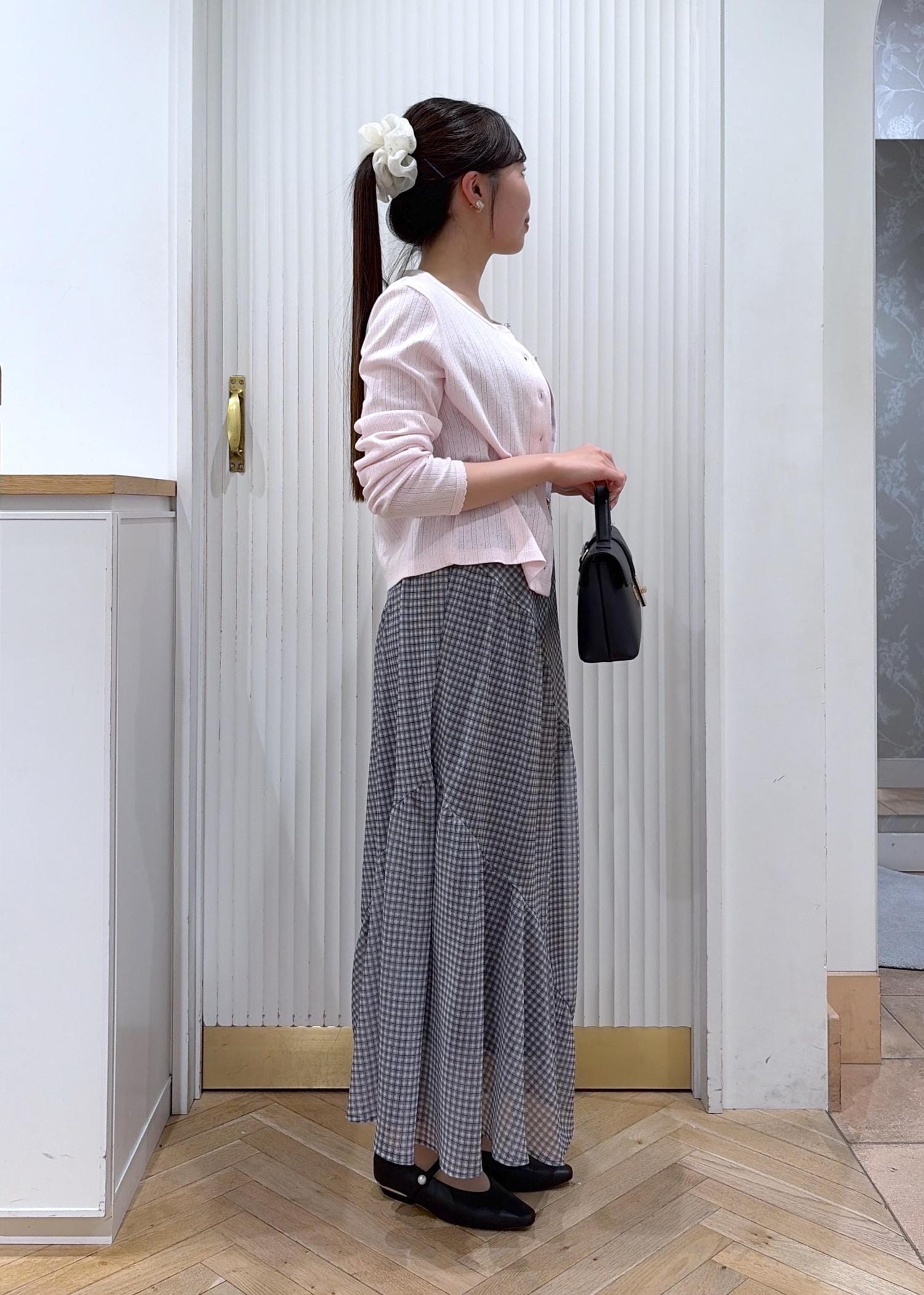 小物はブラックでまとめて、甘さの中にきちんと感をプラスしました。
