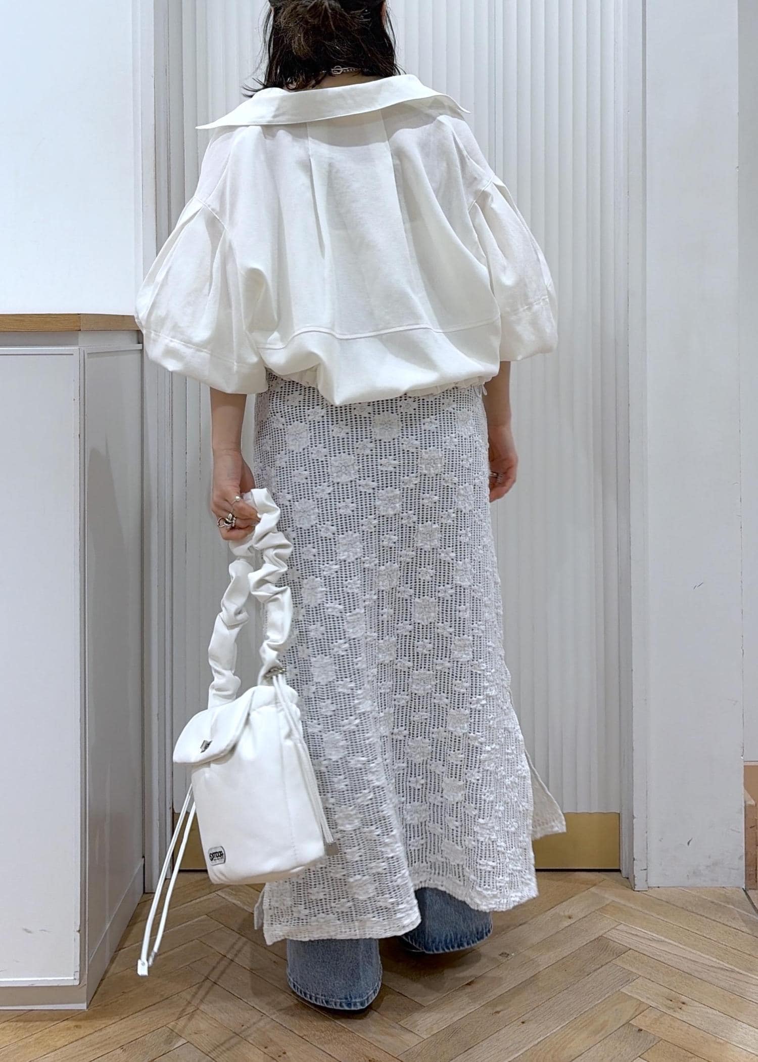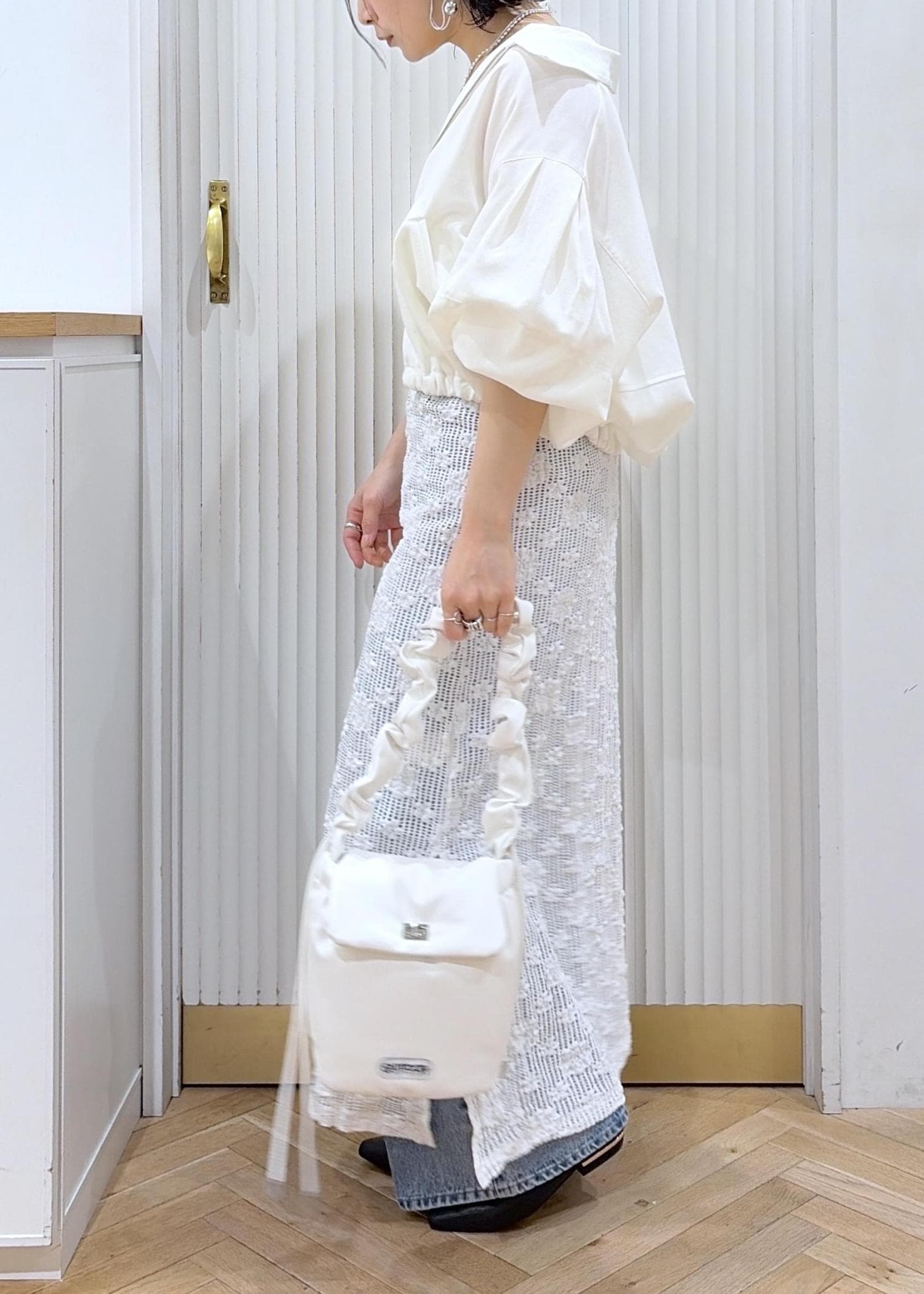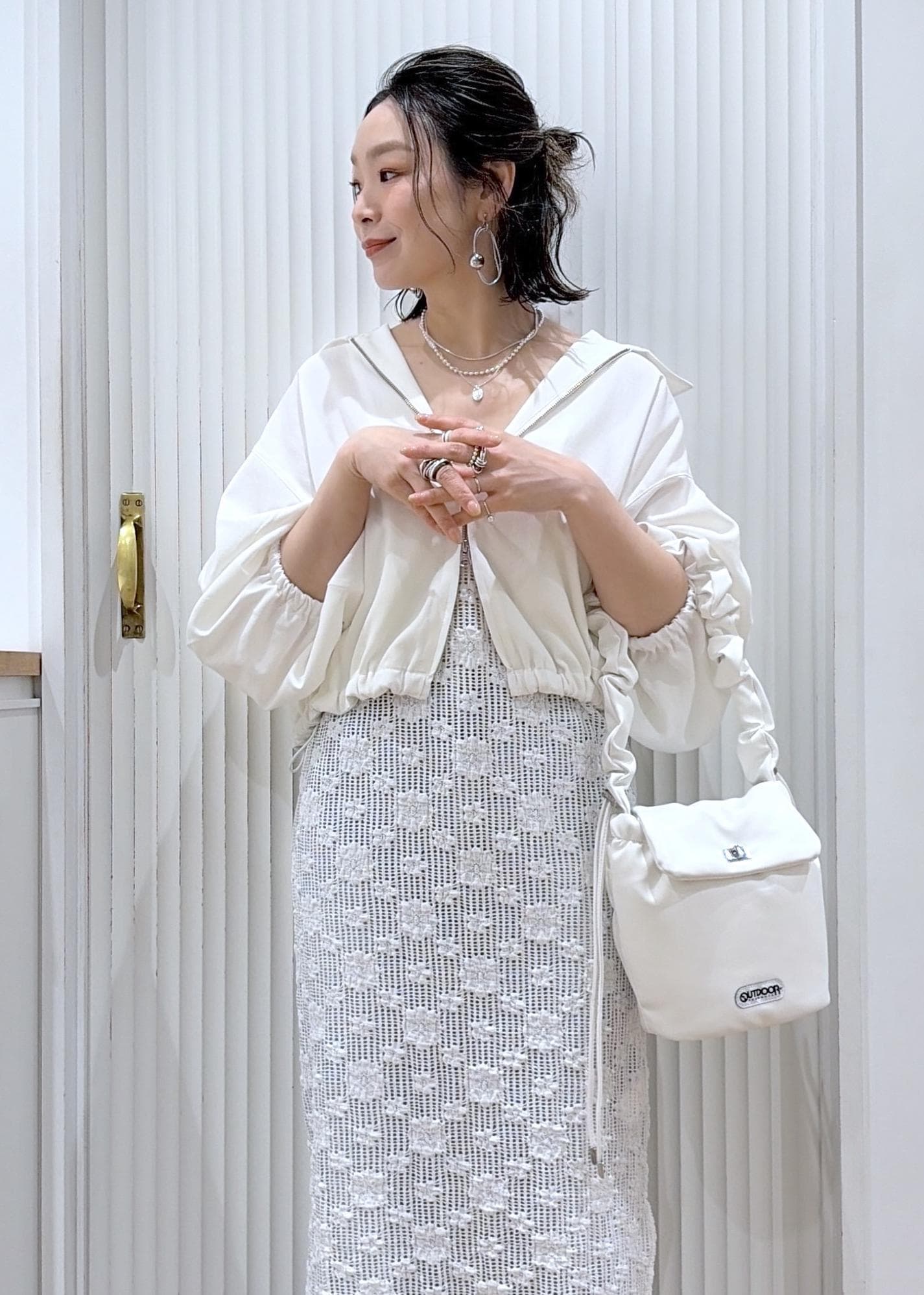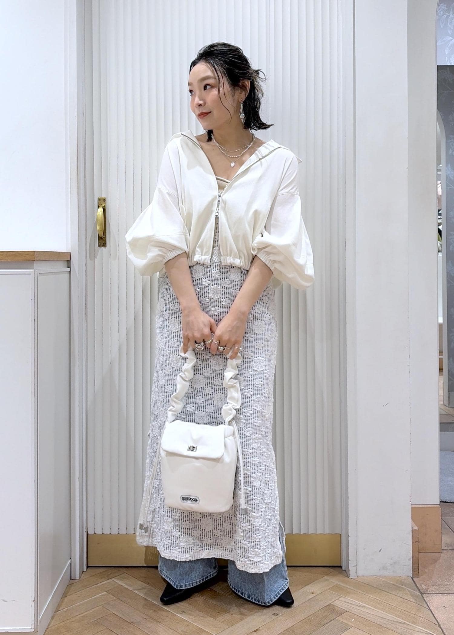 質感で奥行きを出しながら足元はシャープに締めて、甘さを程よくコントロール。白を基調にしながらも、バランスよく引き締まった印象に仕上げています。