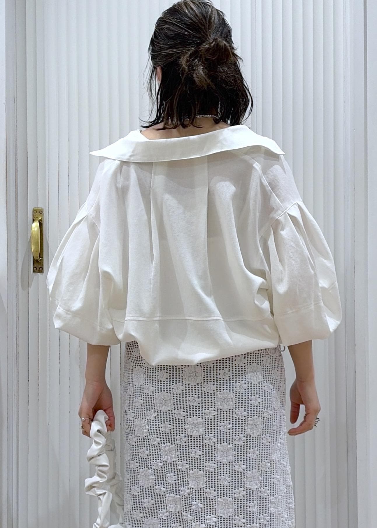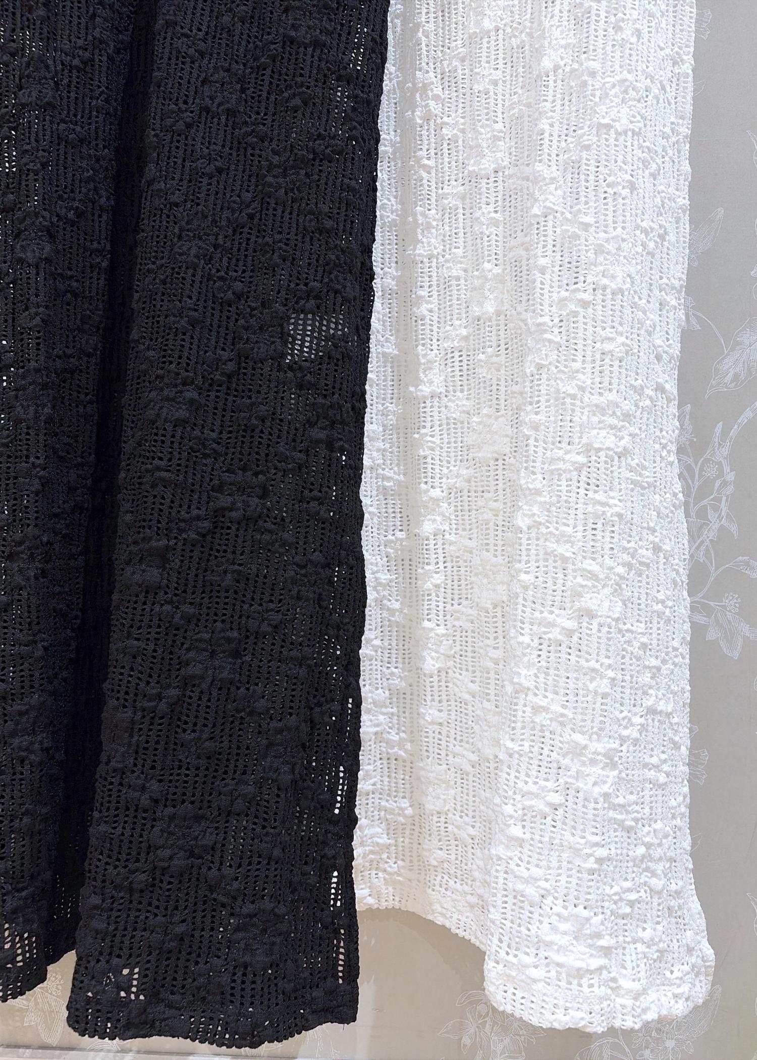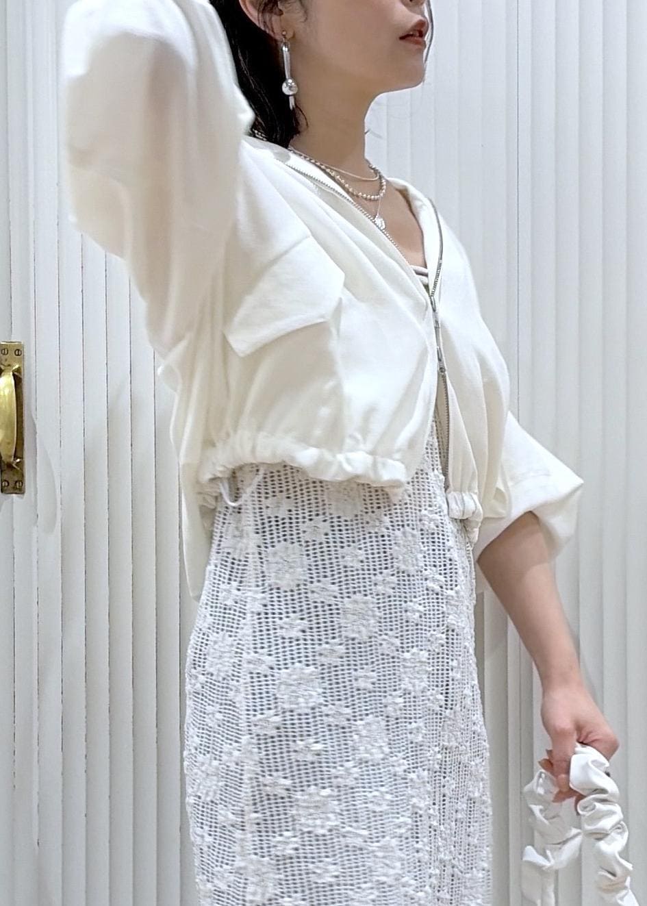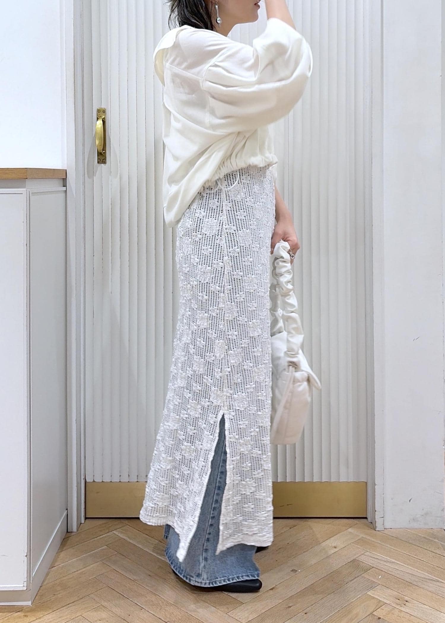 質感で奥行きを出しながら足元はシャープに締めて、甘さを程よくコントロール。白を基調にしながらも、バランスよく引き締まった印象に仕上げています。