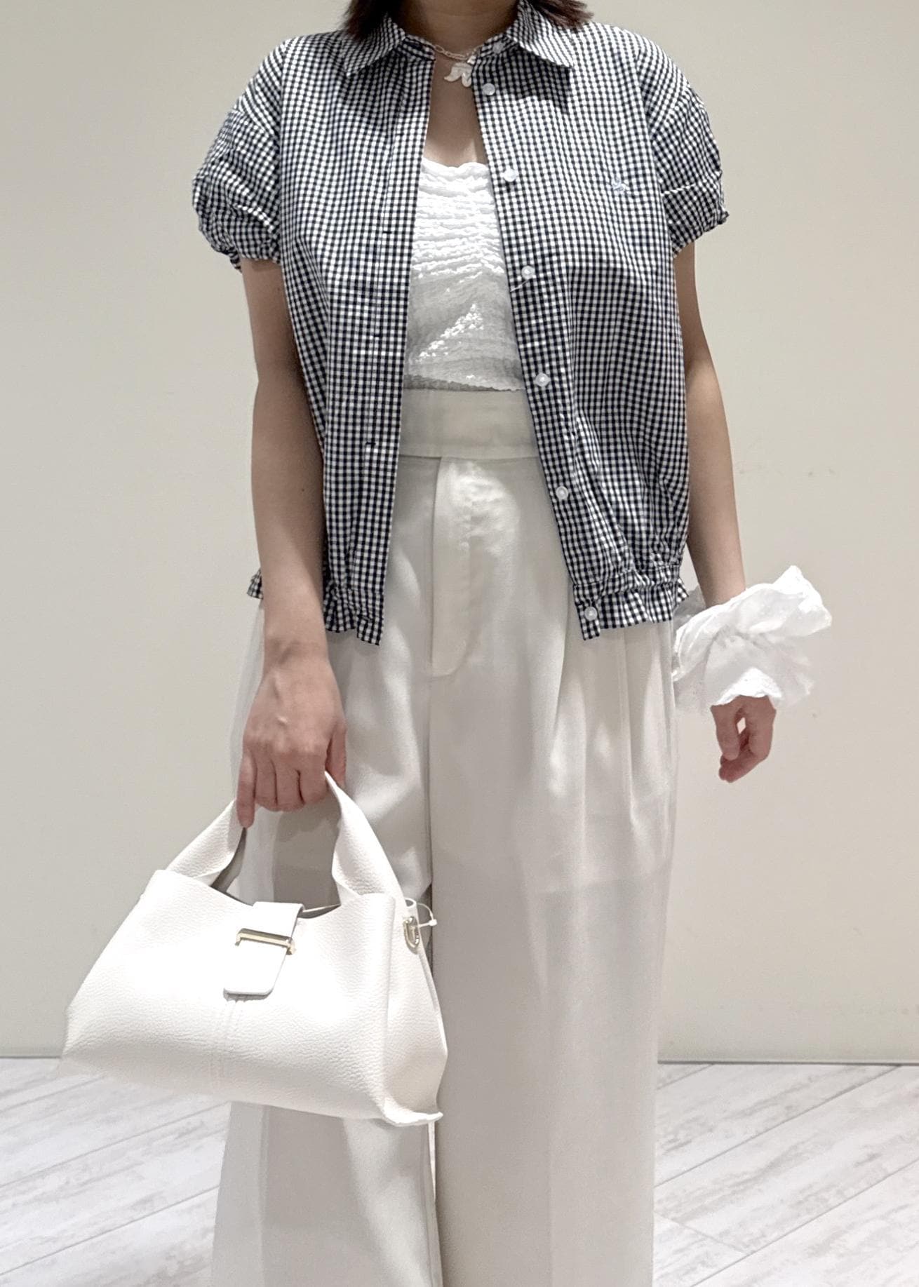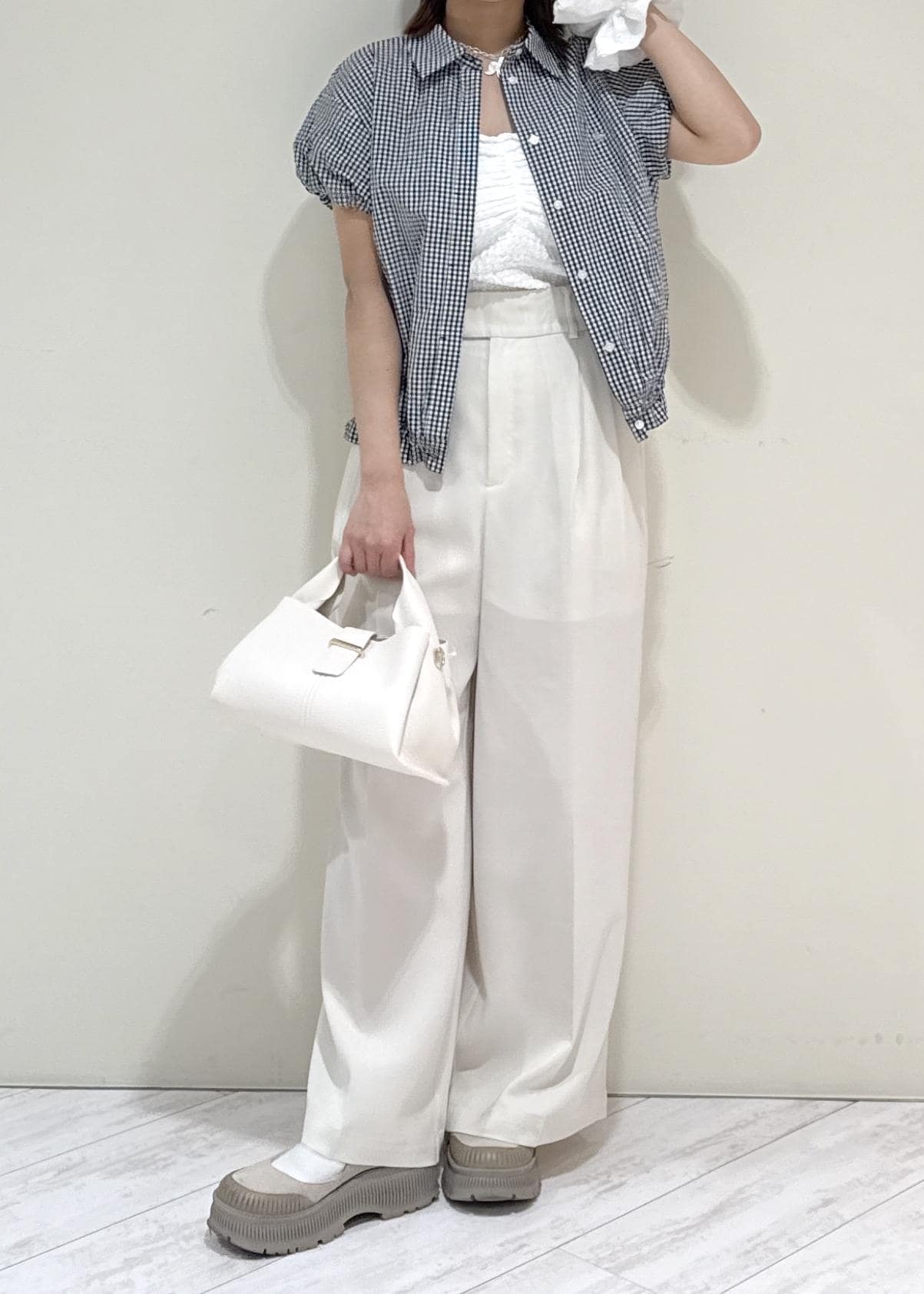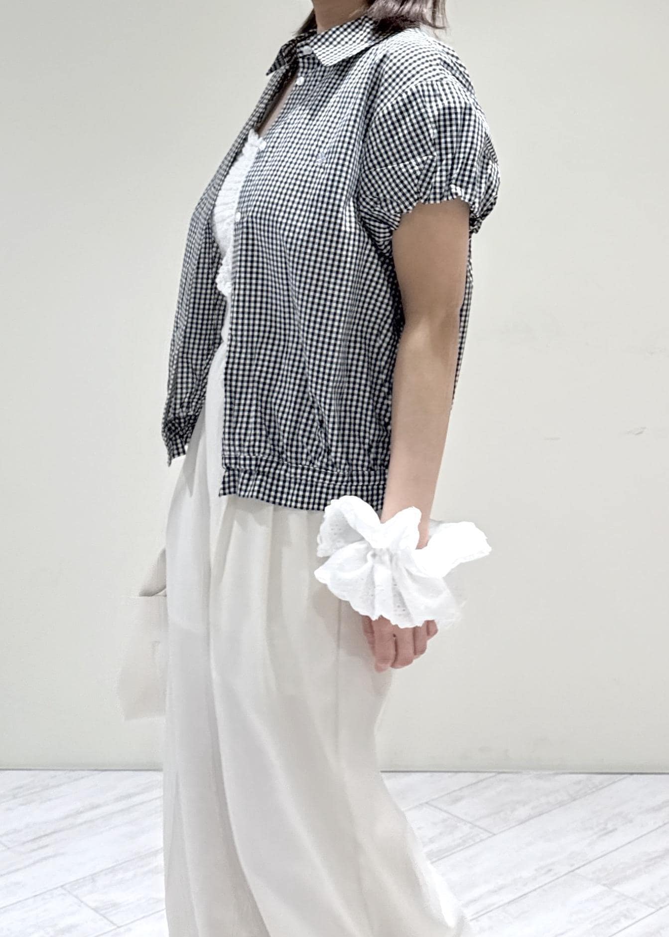 ギンガムチェックとレースのシュシュを合わせたフレンチガーリーで甘めのコーディネートですが、パンツスタイルにすることで、程よくかっこよさもプラスしました♩