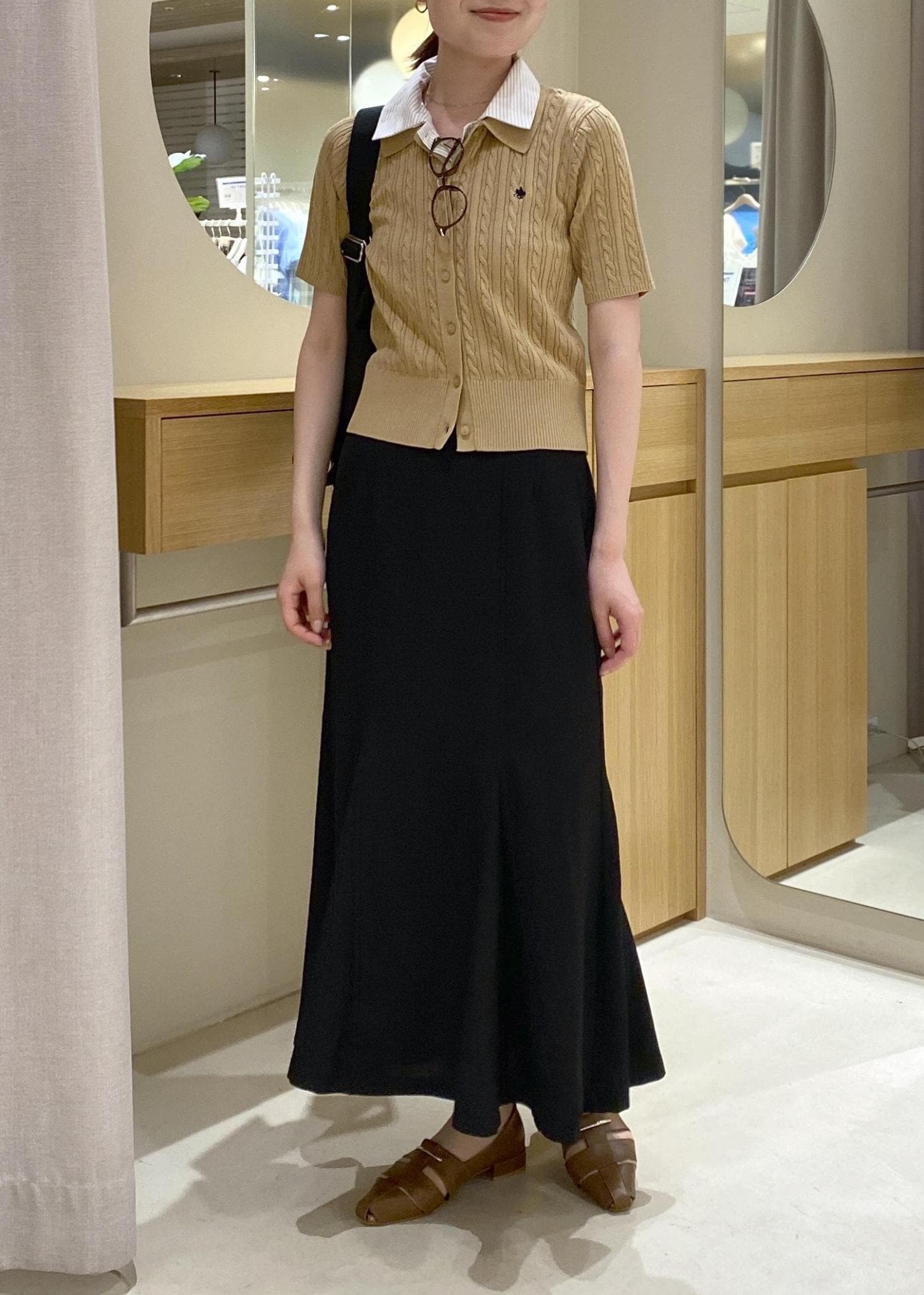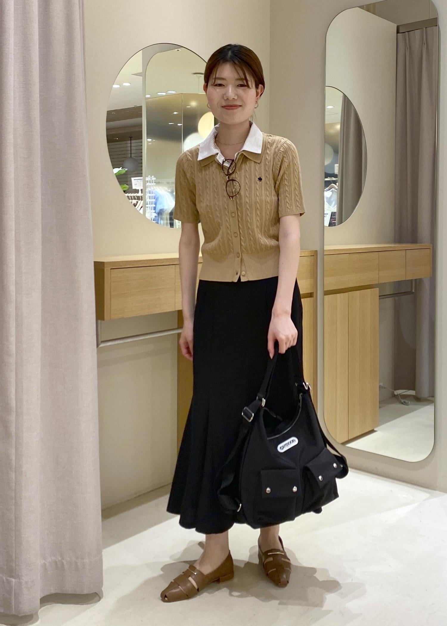 お出かけスタイルとして、シャツ襟部分をを取り外しできる襟付きカーディガンにマーメイドスカートを合わせました。