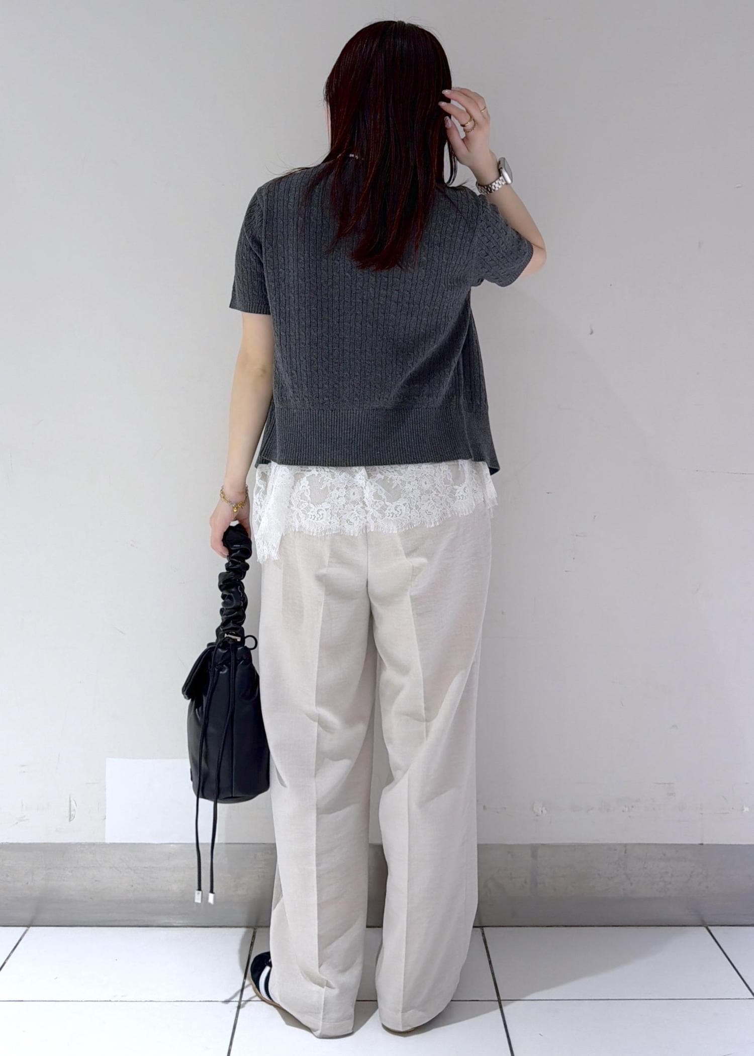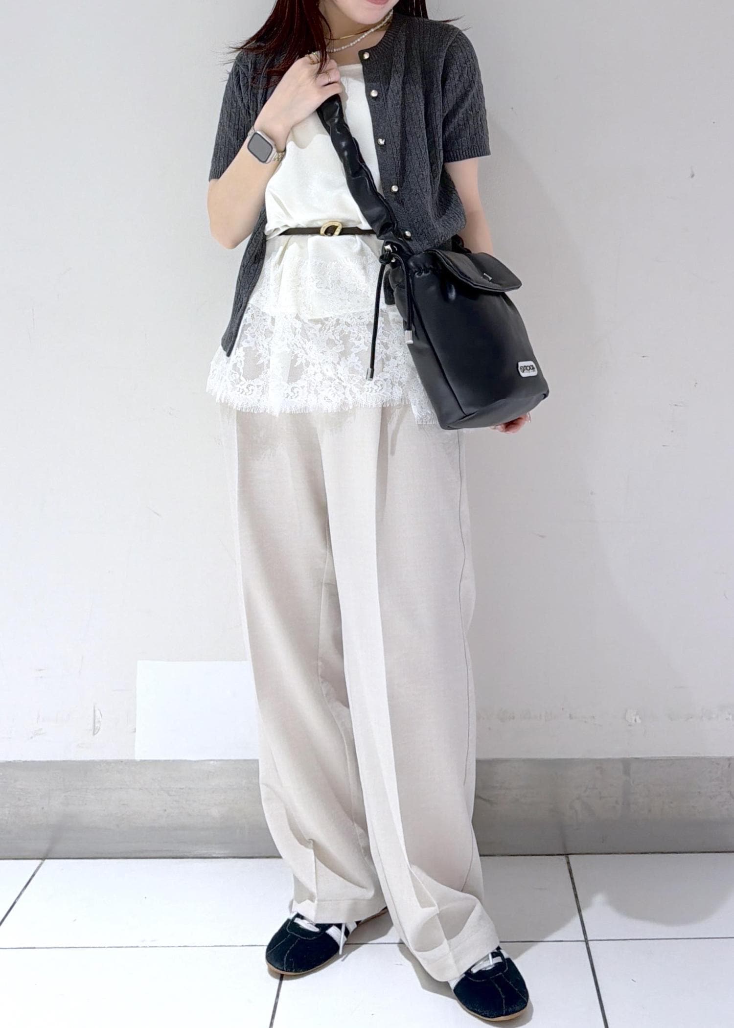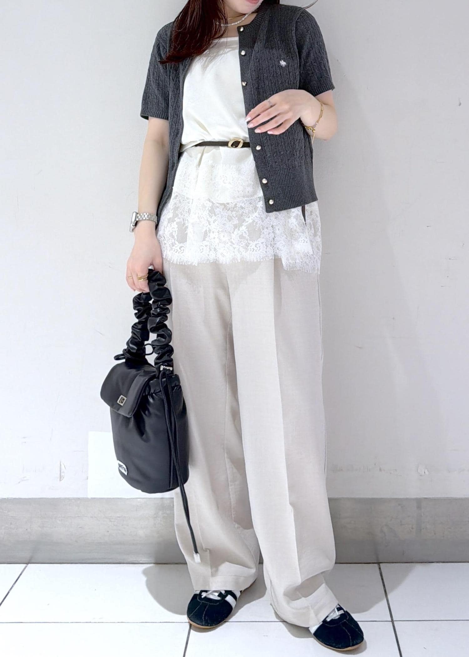 ゆったりとしたワイドパンツを合わせることで、甘さを程よく抑えた大人バランスに仕上げました!