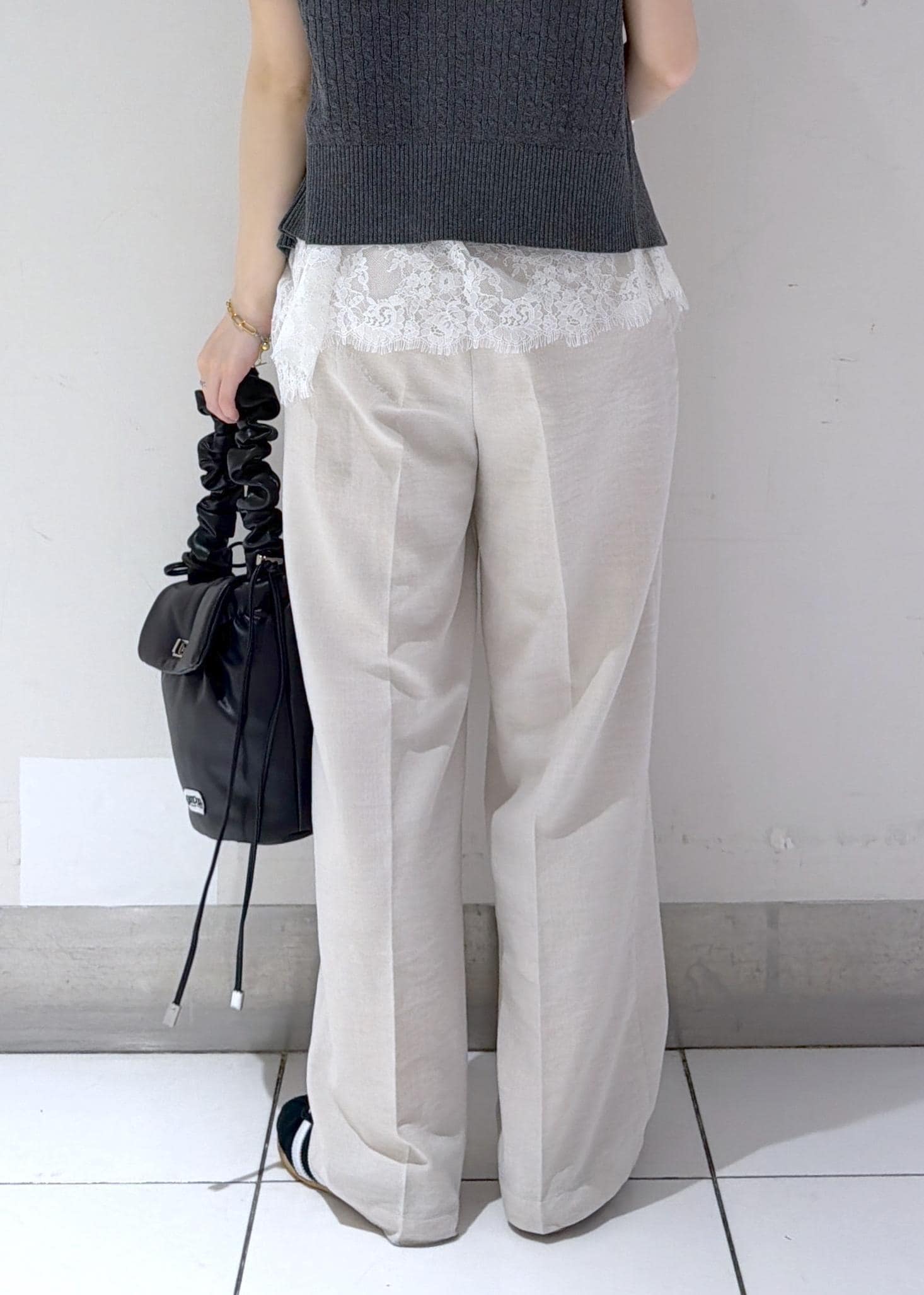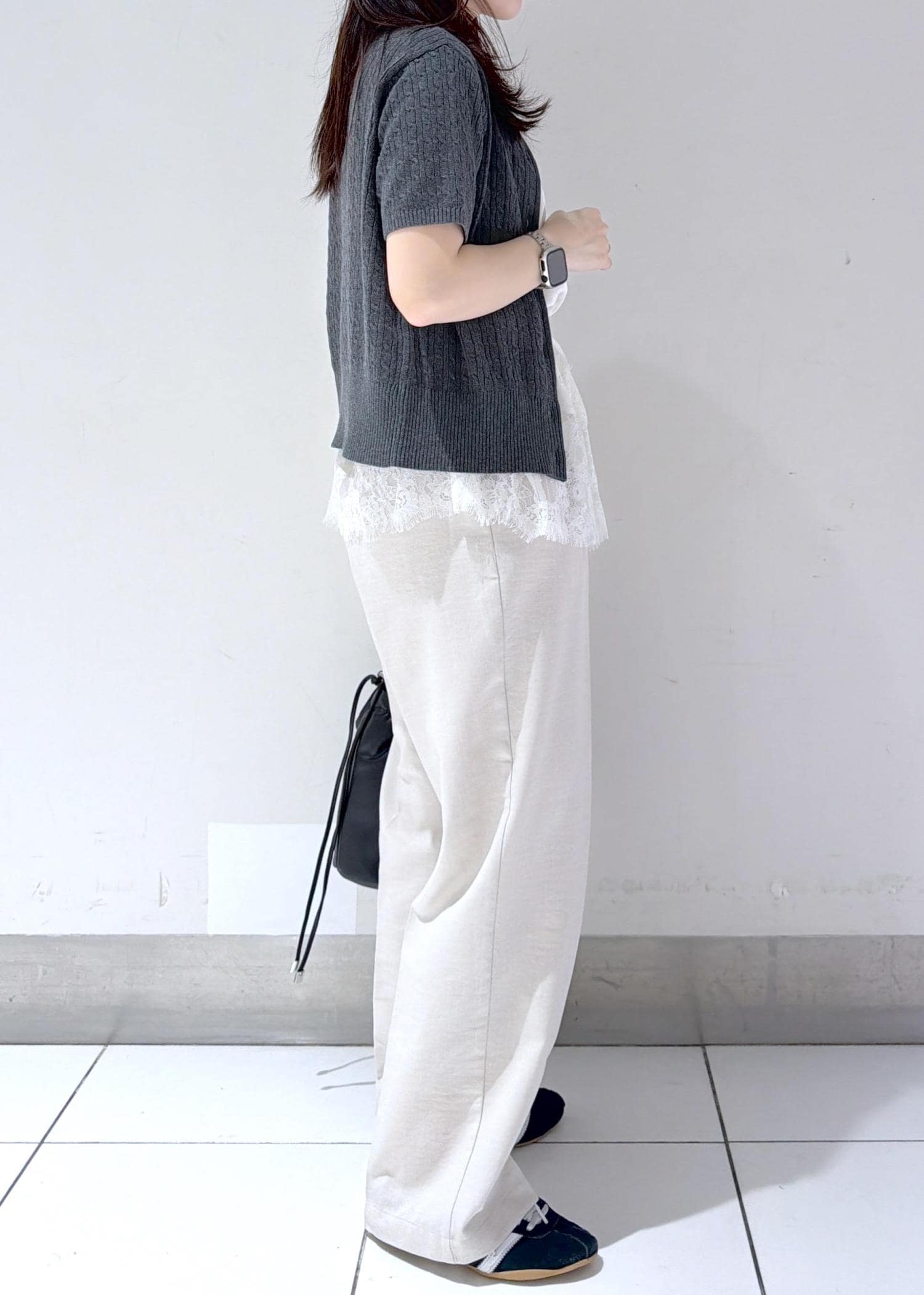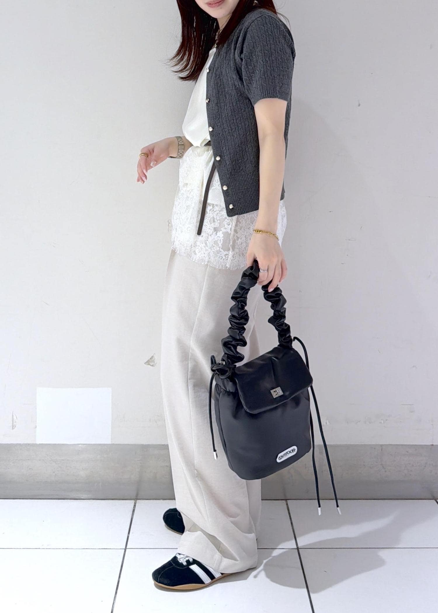 ゆったりとしたワイドパンツを合わせることで、甘さを程よく抑えた大人バランスに仕上げました!
