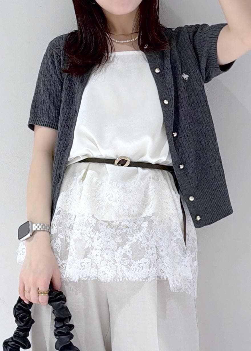 繊細なレースキャミにコンパクトなカーディガンを重ねた、軽やかなレイヤードスタイル✨