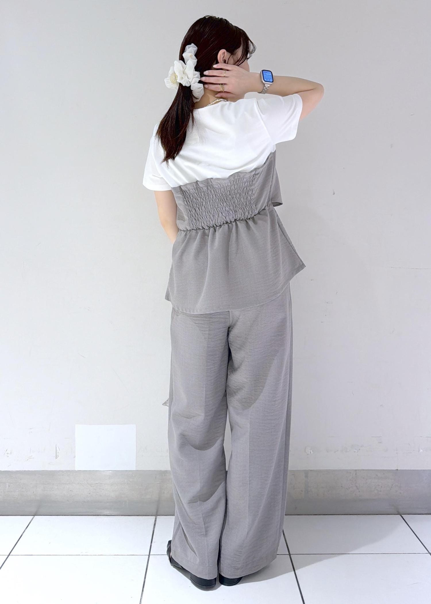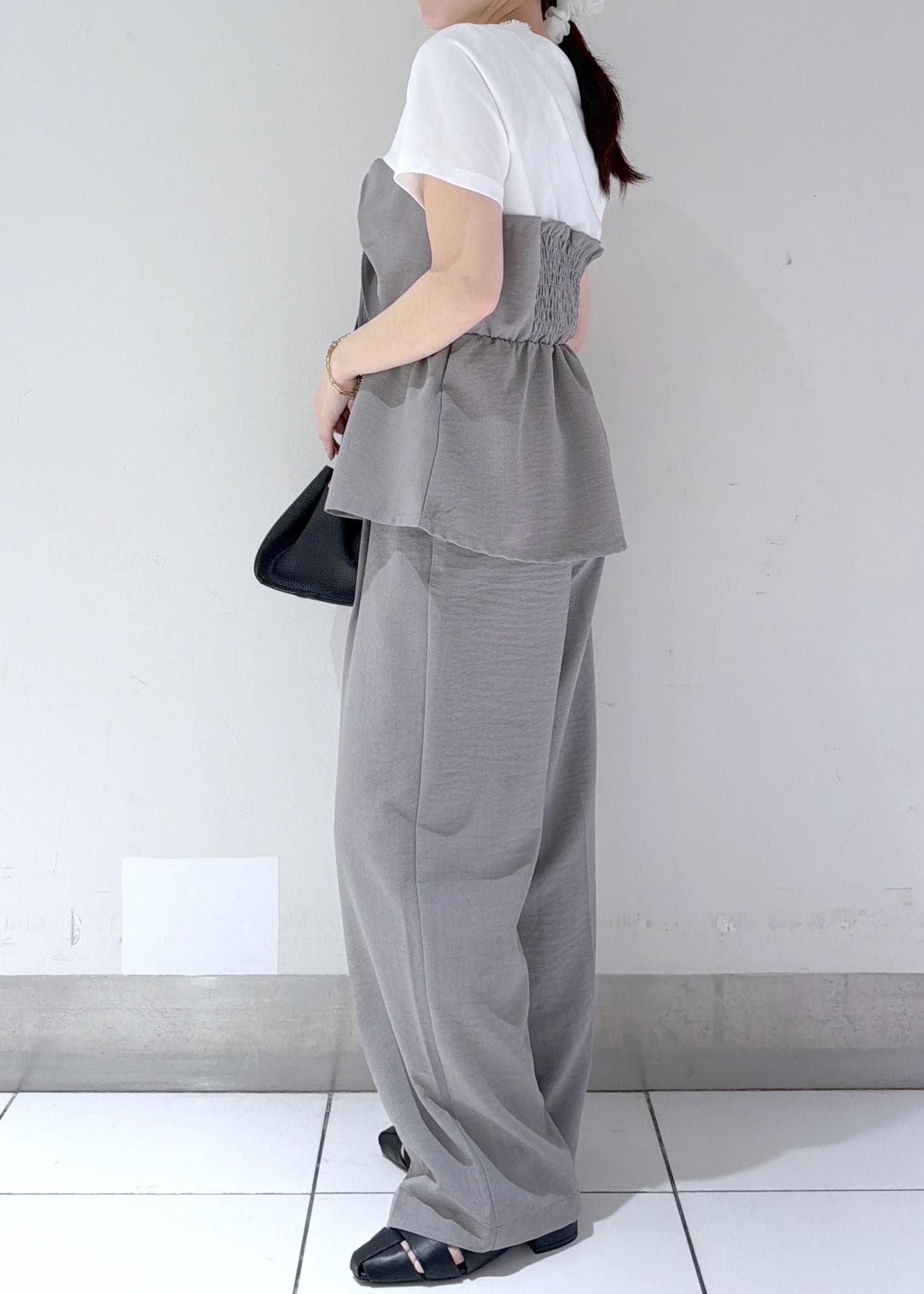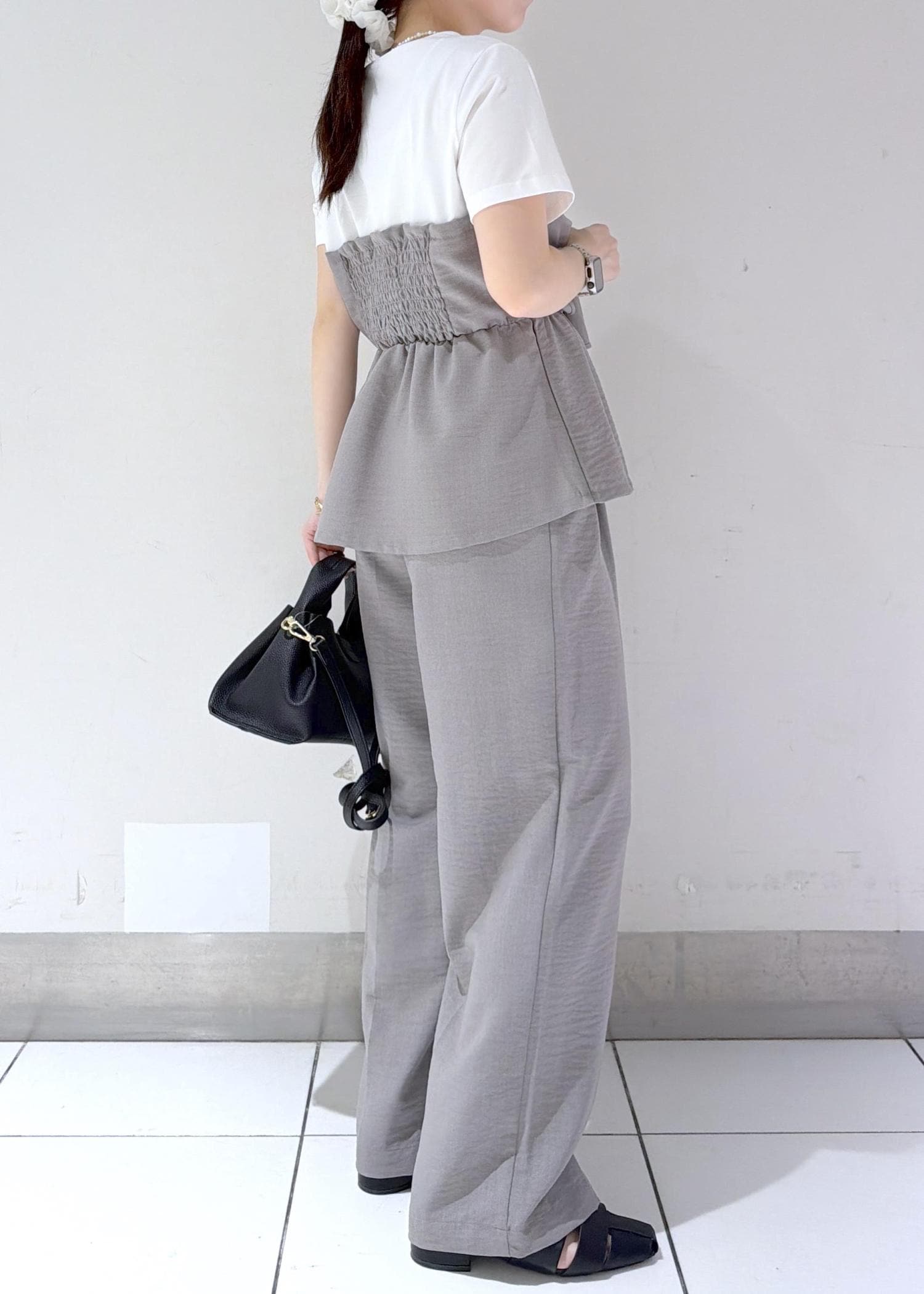 立体感のあるリボンディテールが目を惹くトップスに、同素材のワイドパンツを合わせた統一感のあるスタイリング✨