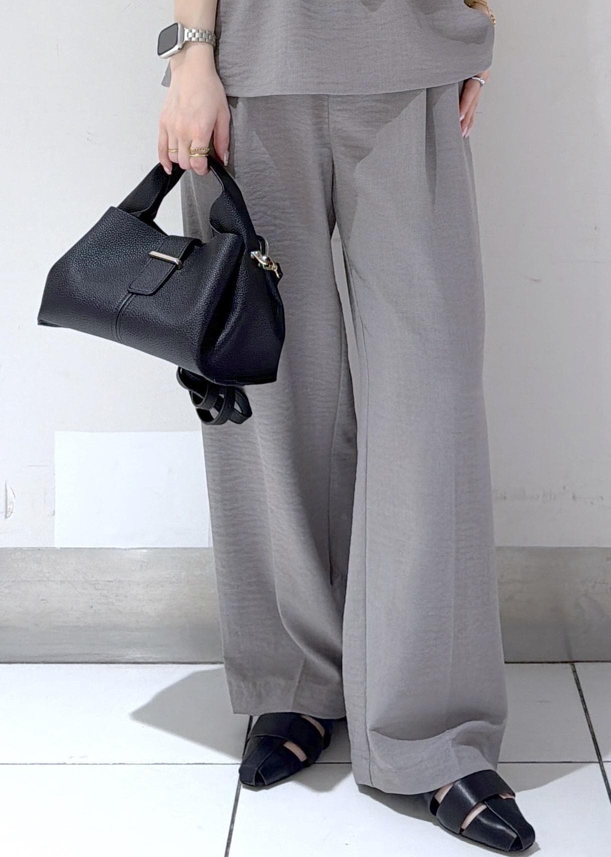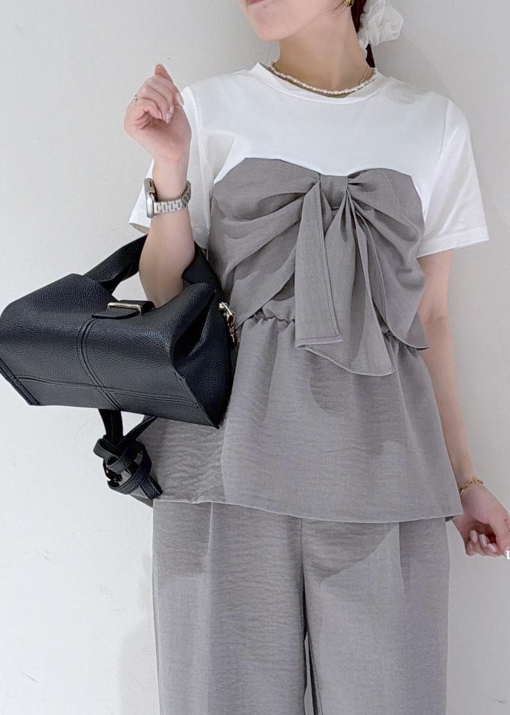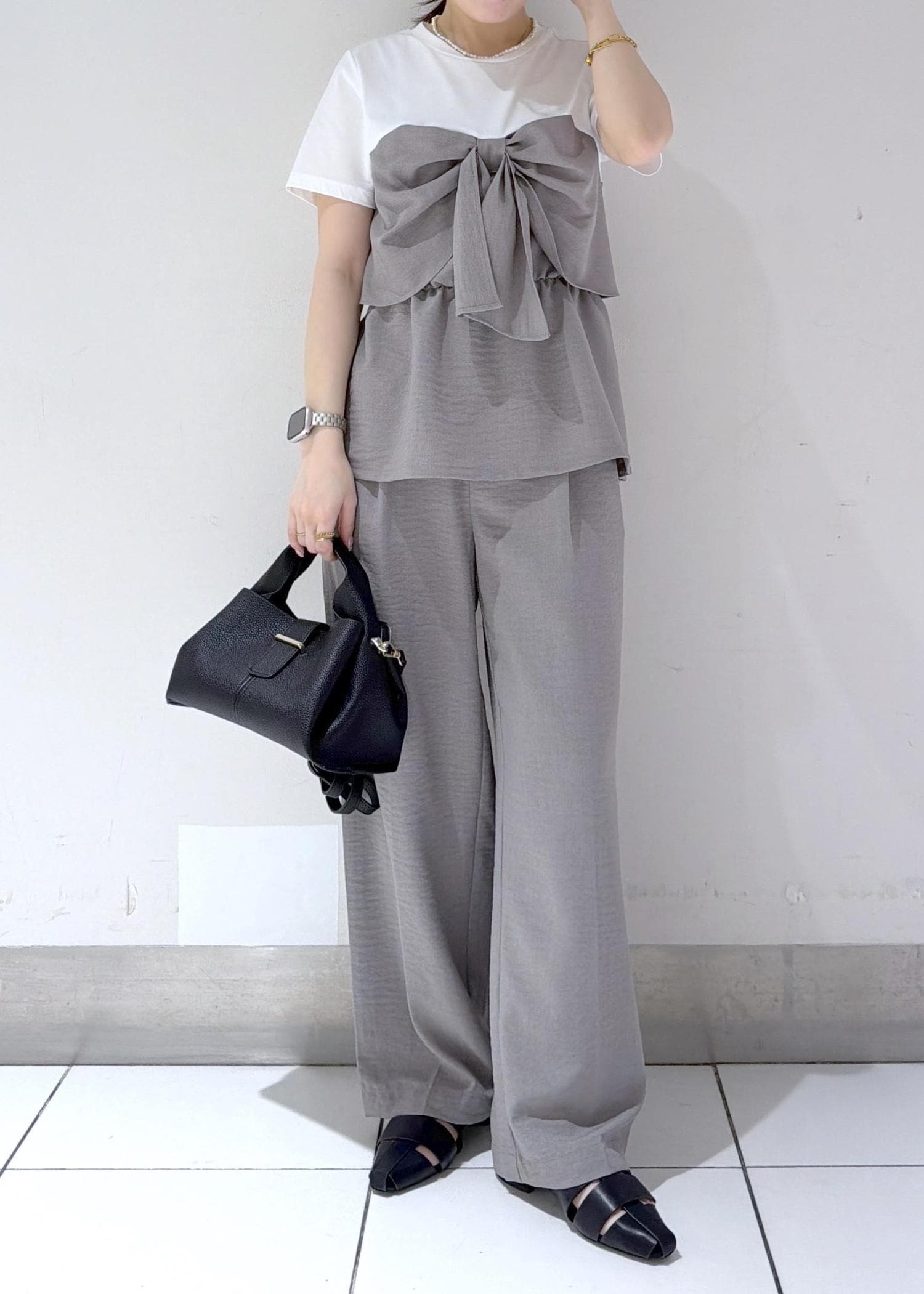 リボンデザインが主役の、セットアップ風グレーコーデ