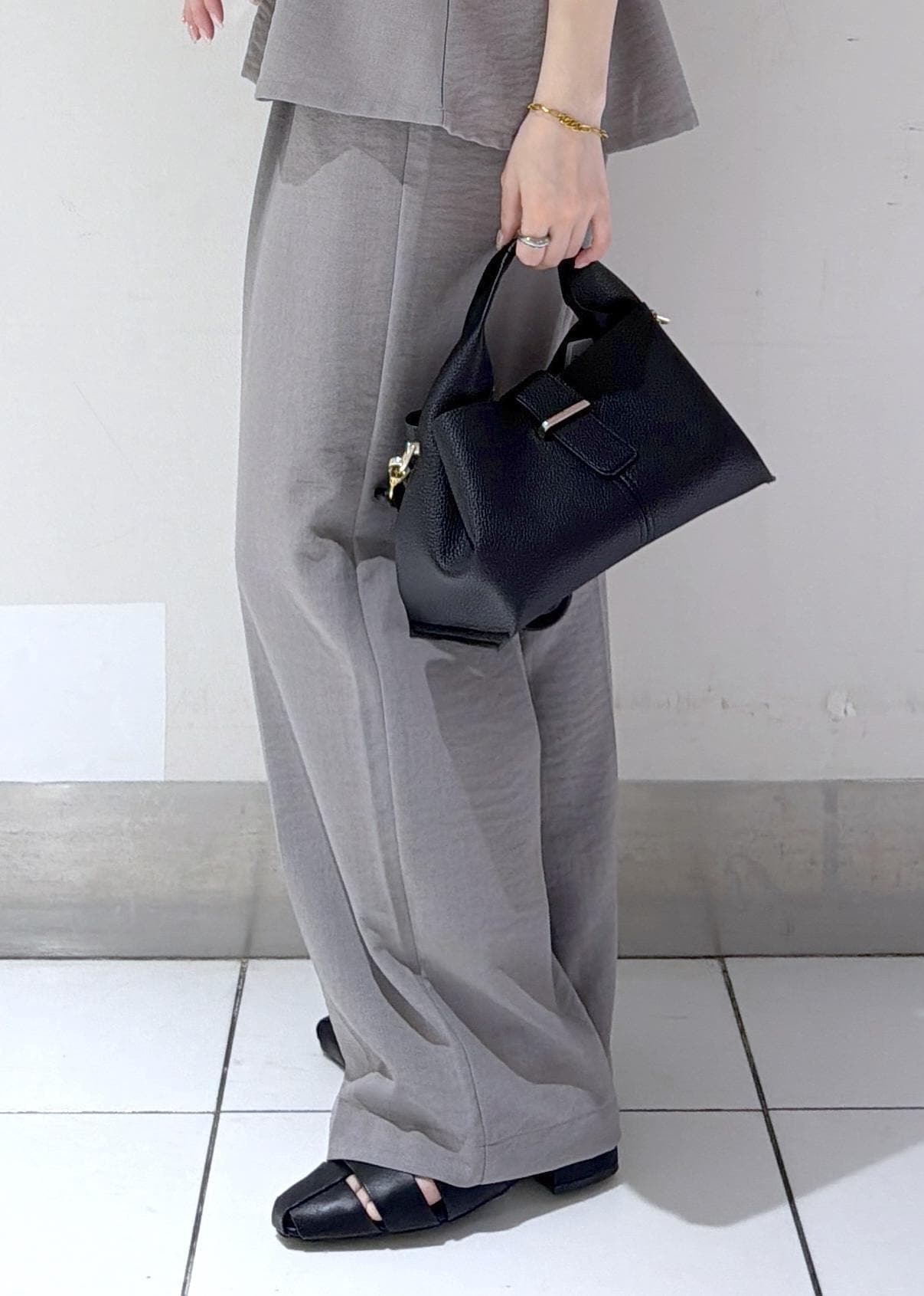 ブラック小物で全体を引き締め、大人っぽくまとまるのもポイントです!