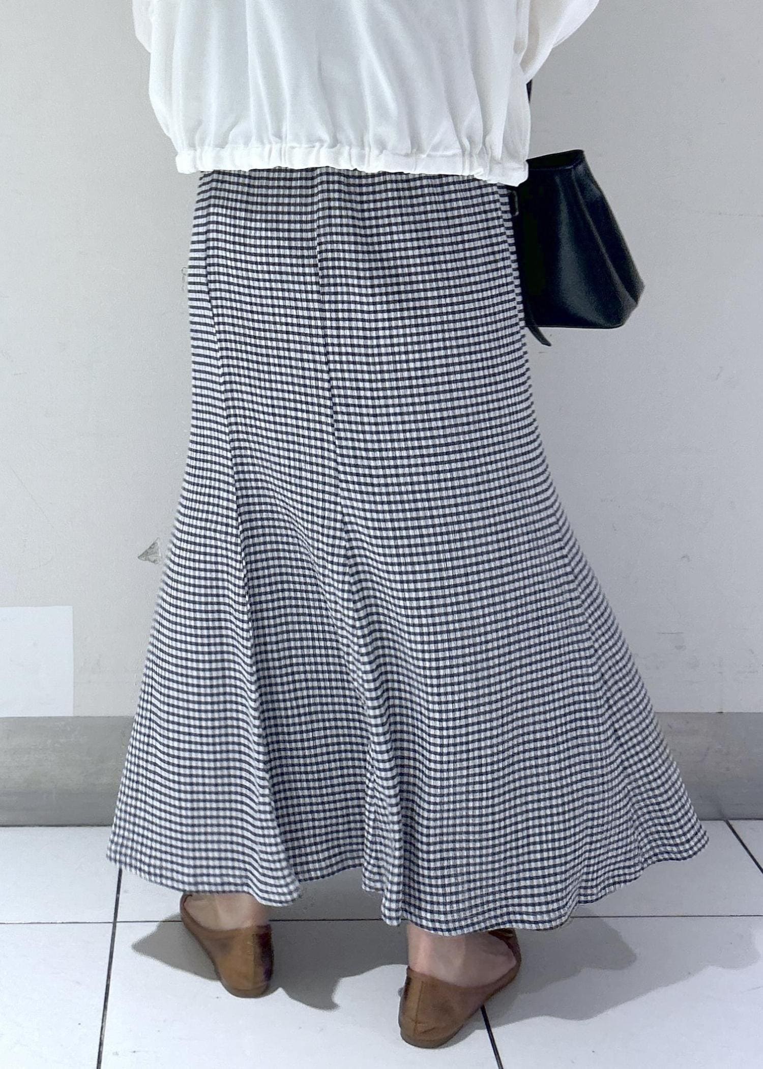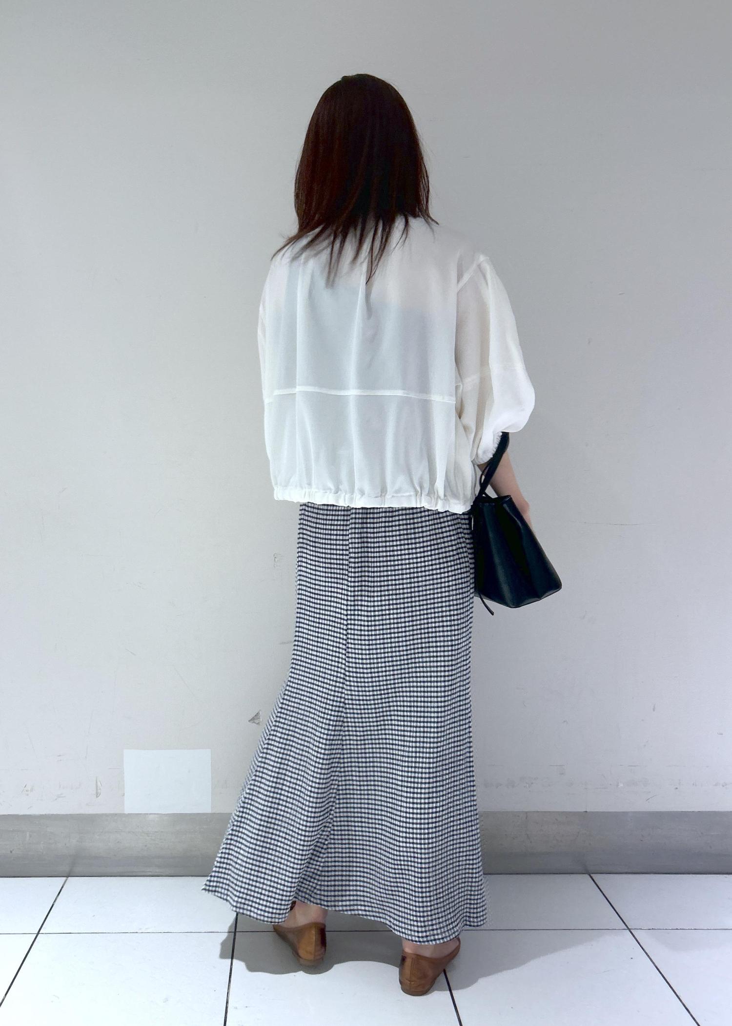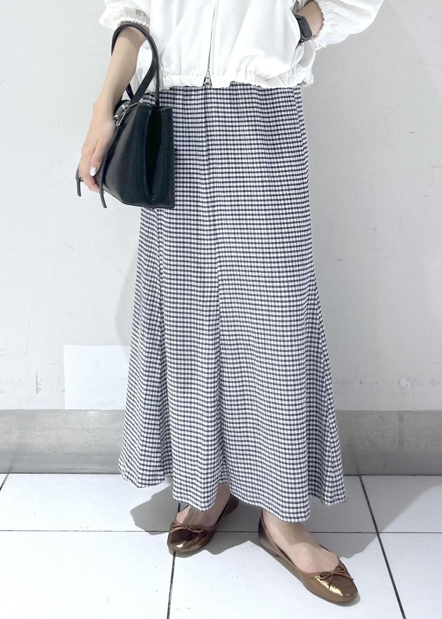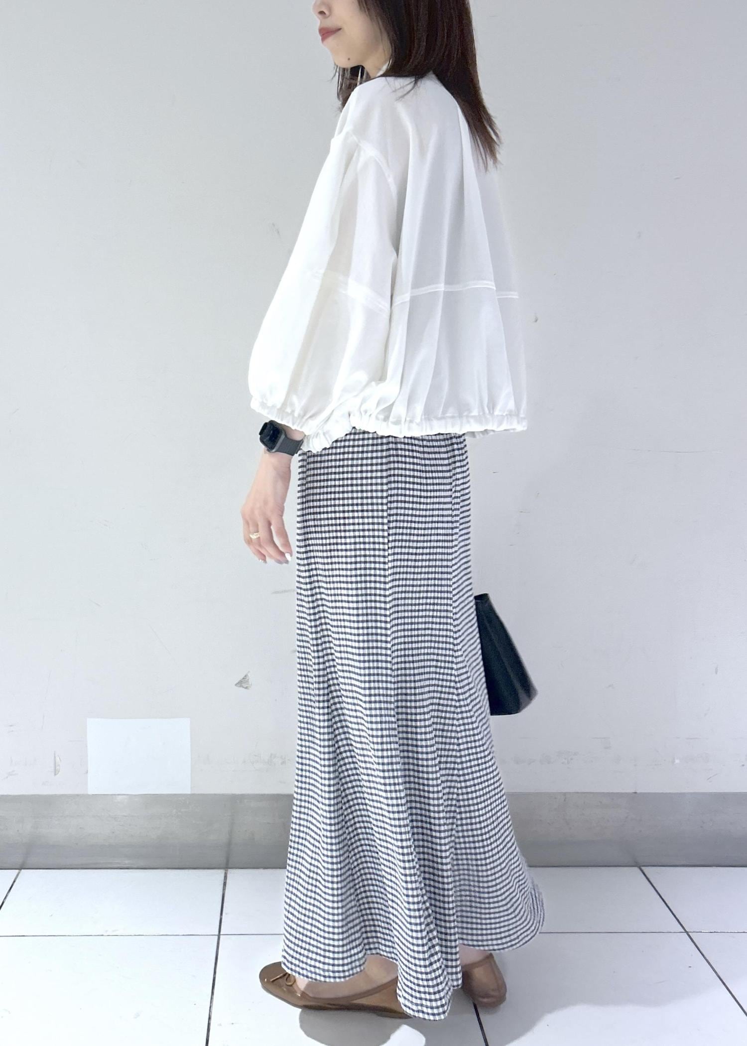 ギンガムチェックのスカートと合わせて女っぽいスタイルに。