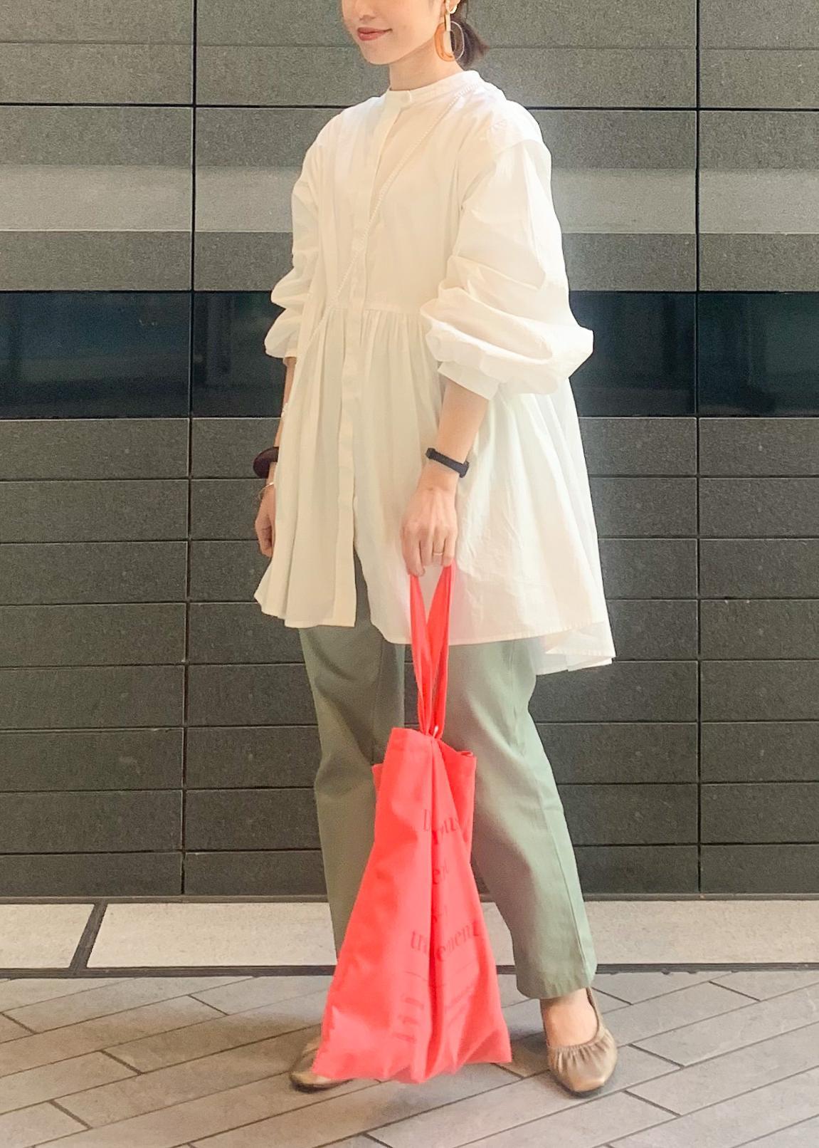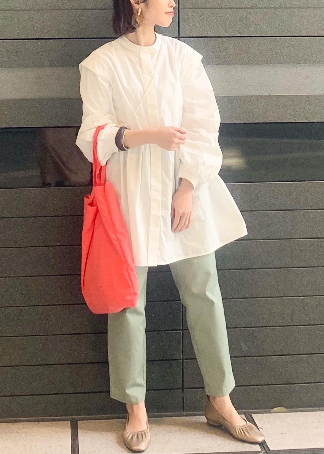 タイプライターコットン使用のブラウスをメインに パンツで合わせたカジュアルコーデ。 ウエスト切り替えとボリューム袖が可愛いブラウスなので、 ボトムはスッキリと。淡いカラー合わせなので ビタミンカラーのバックをポイントに♪ 小柄な方もチャレンジしやすい春スタイルです☺︎