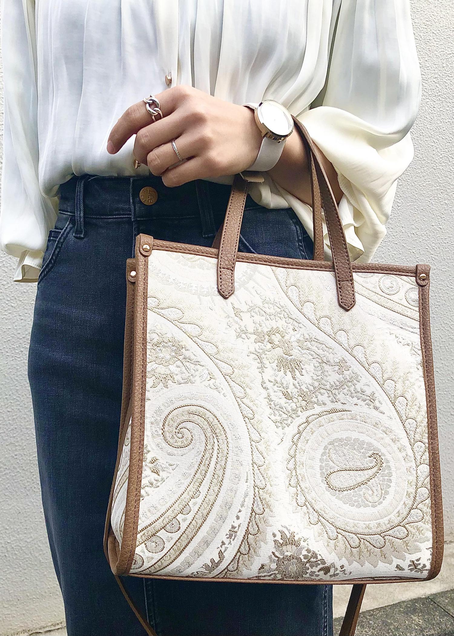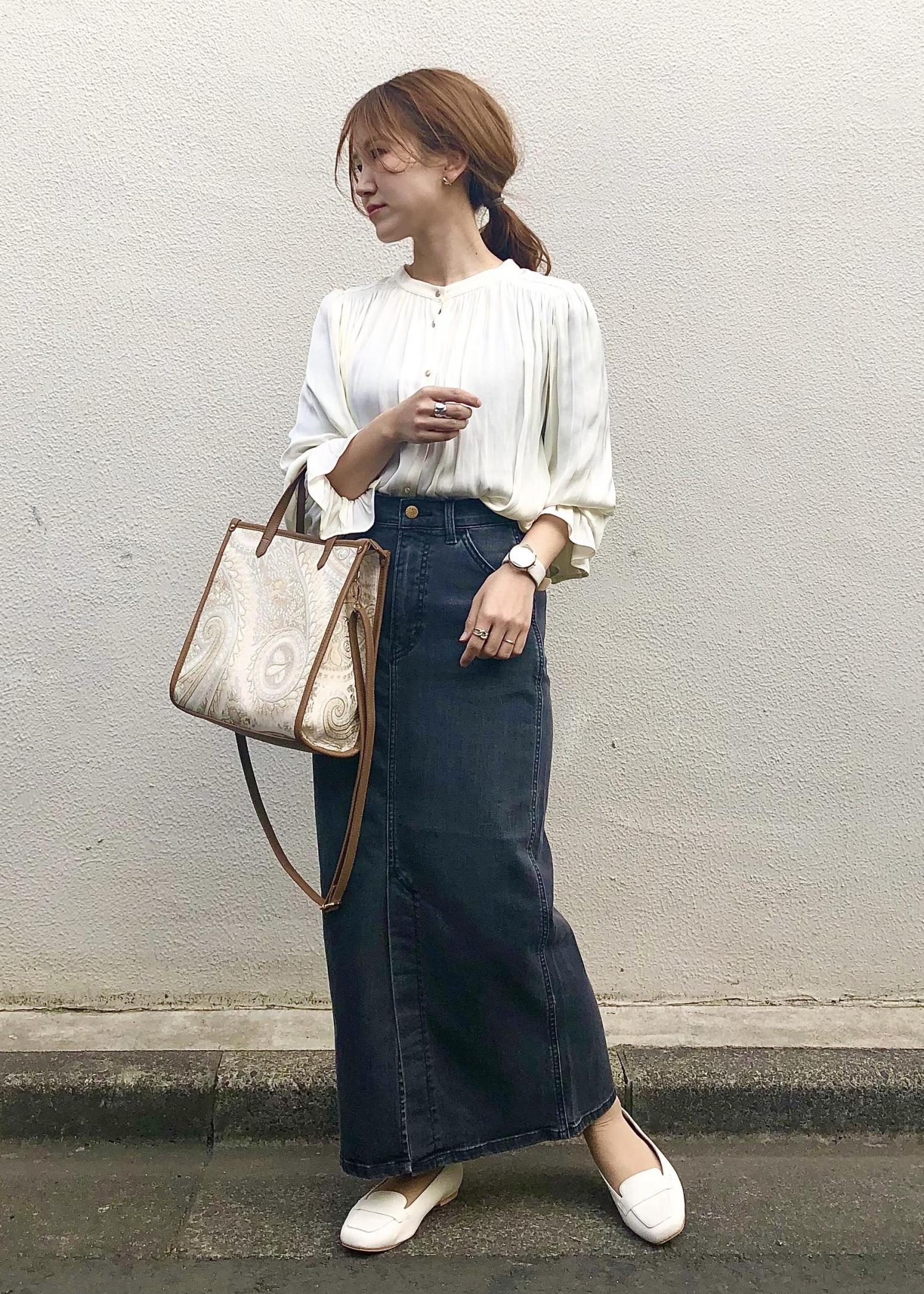 綺麗めなサテンギャザーブラウスにデニムスカートを合わせたデイリーコーデです。 全体的にモノトーンで合わせているので バッグのペイズリー柄がアクセントとしてグッとお洒落なイメージになります。 ギャザーブラウスは柔らかい素材でボリュームが出すぎないので低身長さんにもオススメです。