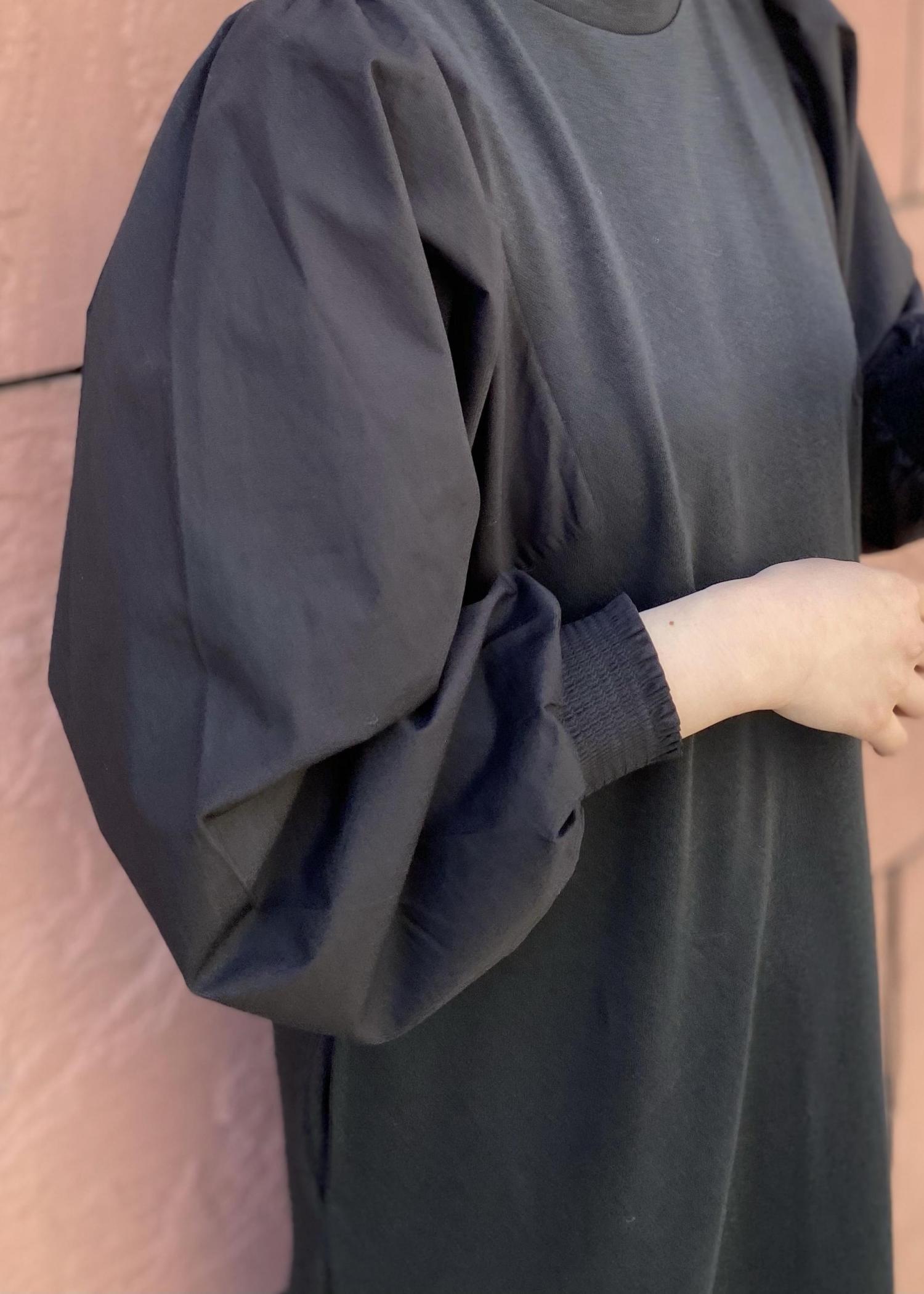 一見シンプルに見えますが、袖の素材違いや、全体のデザインのスッキリさが1枚で決まるワンピースです。