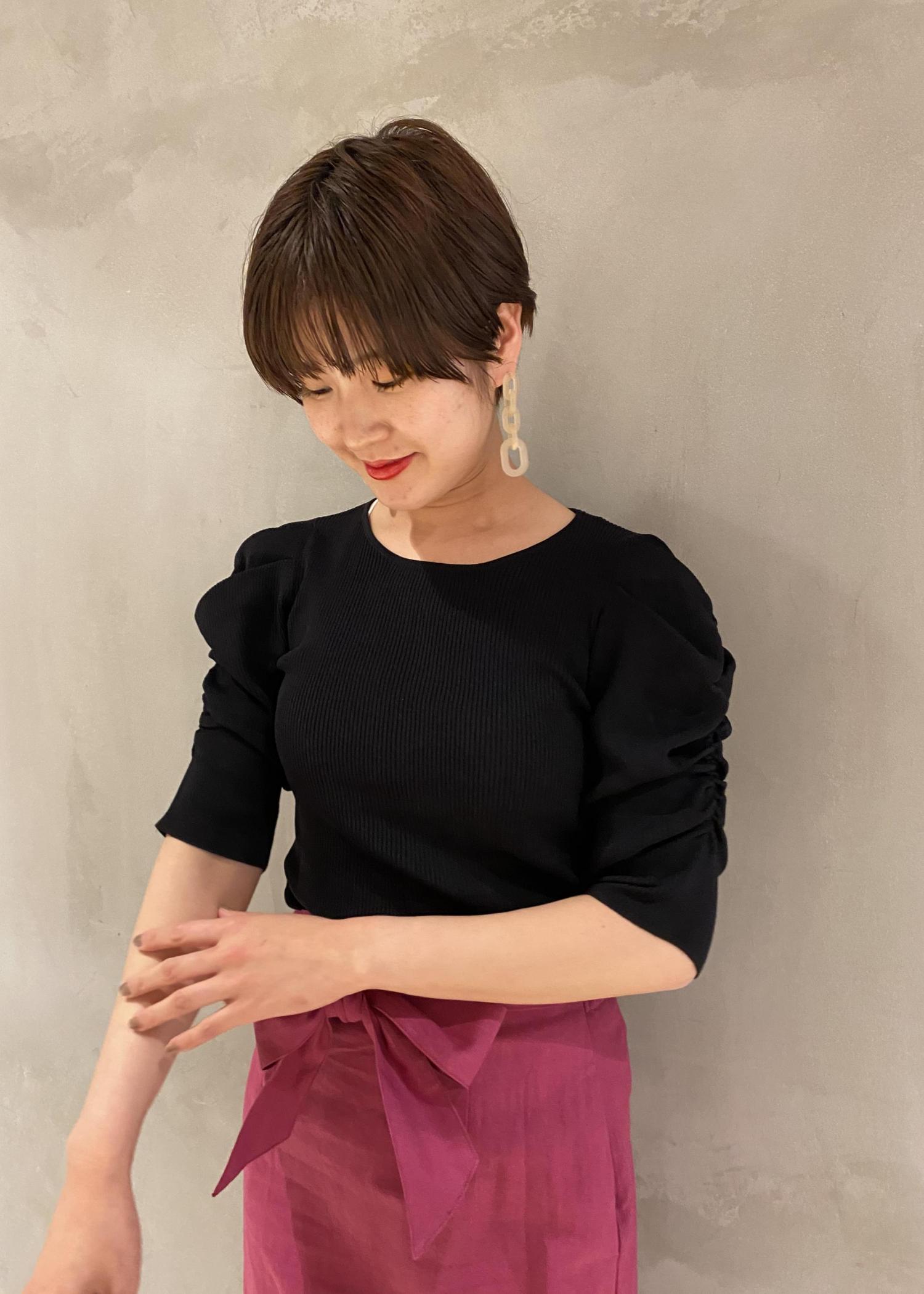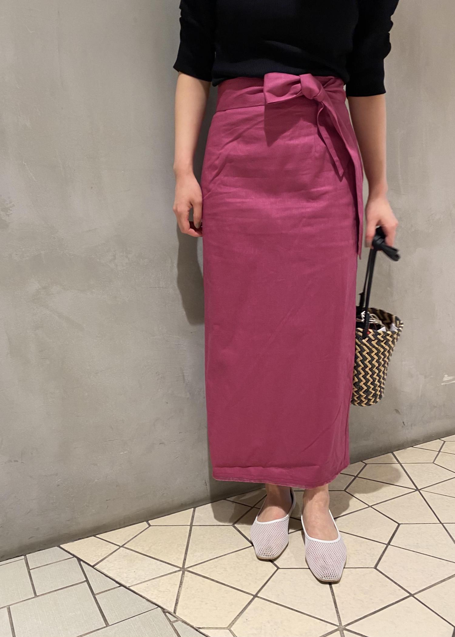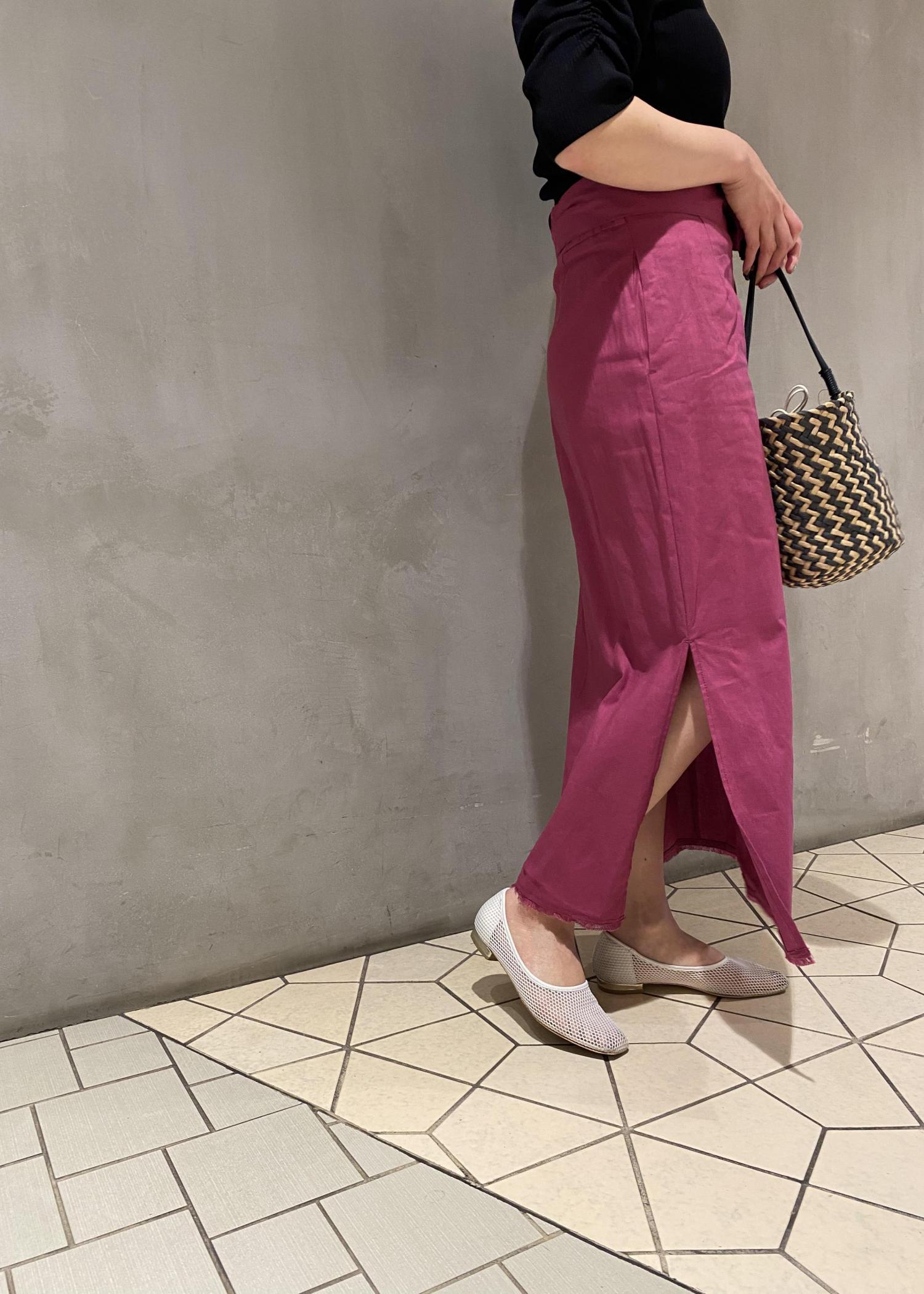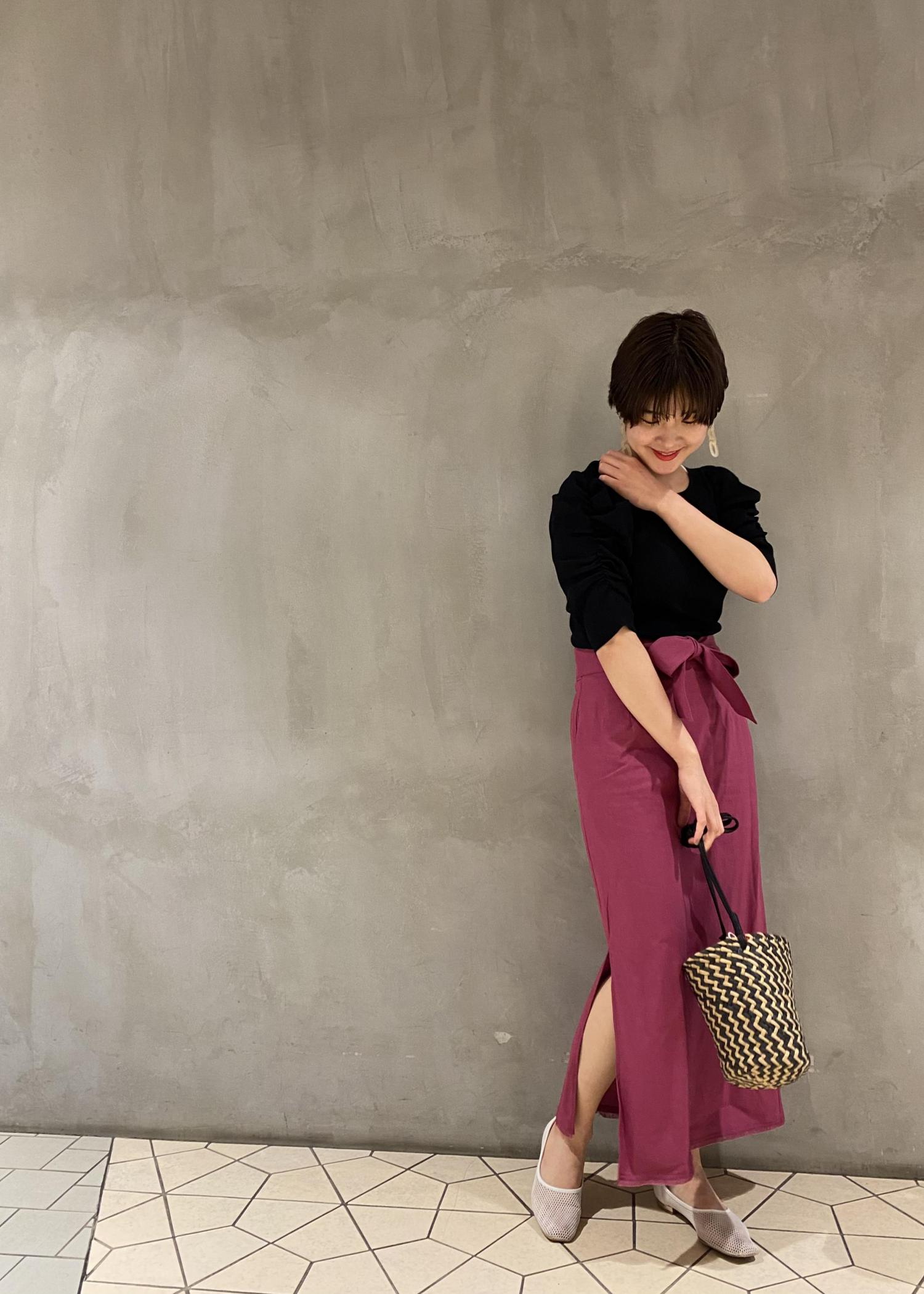鮮やかなピンクカラーのスカートを 女性らしいニットとの合わせで 大人可愛いスタイリングに。 トップスをブラックにする事で、甘さもちょっと 抑えられるので、この夏オススメのカラー合わせです◎